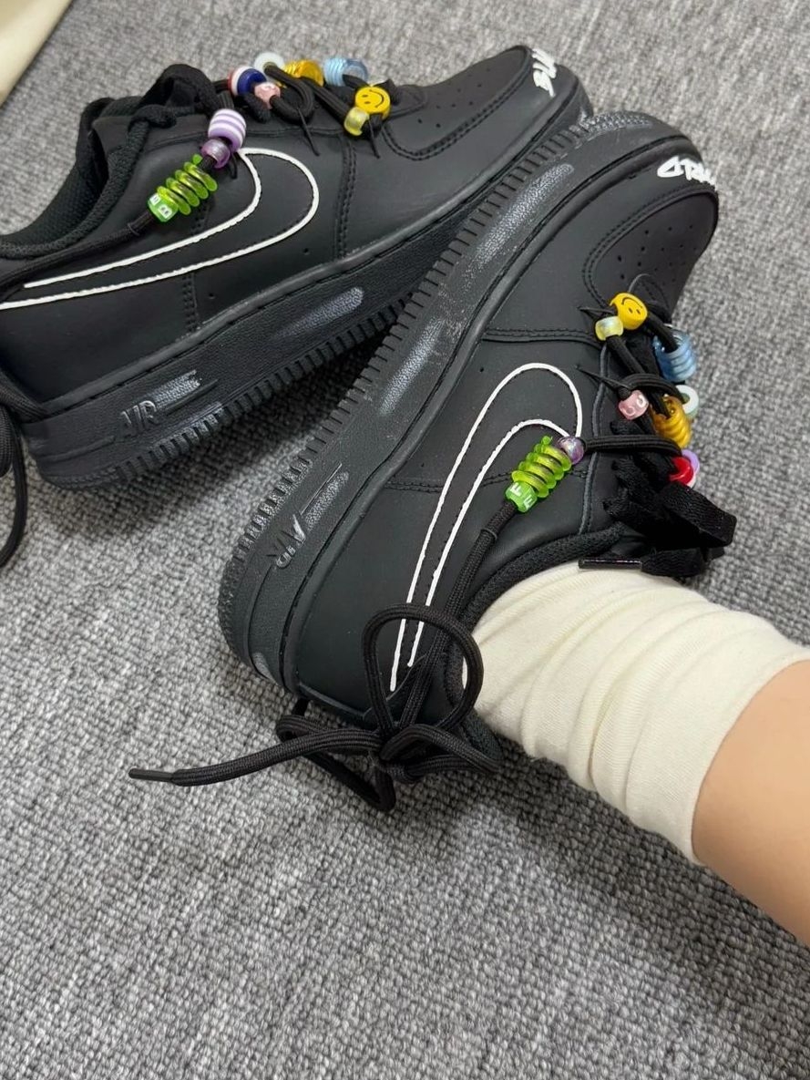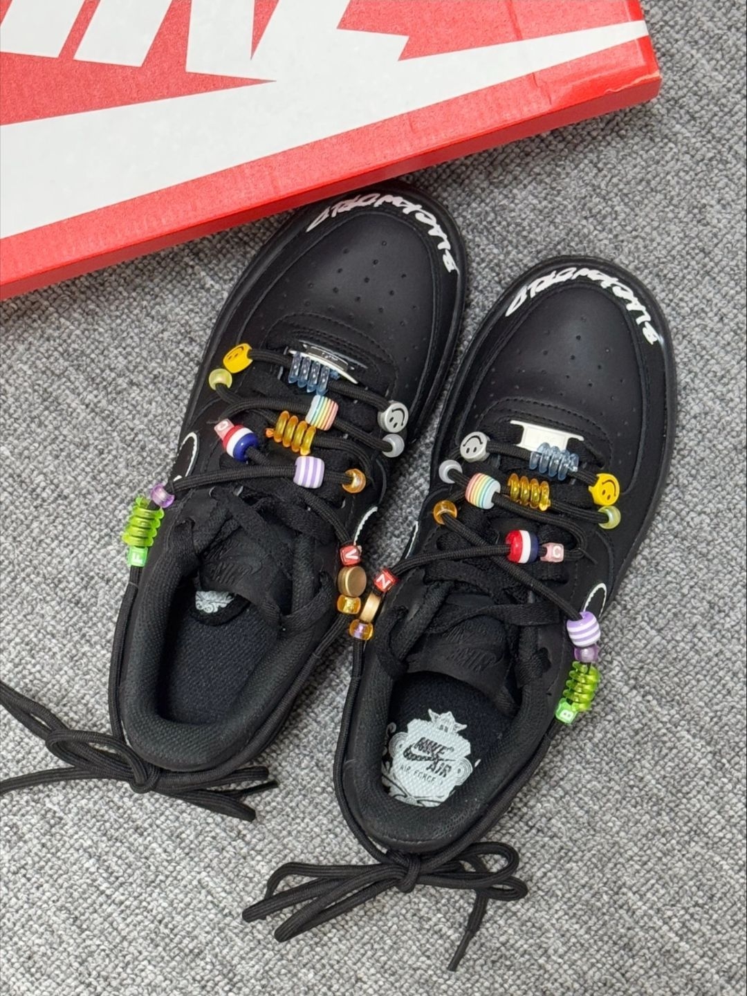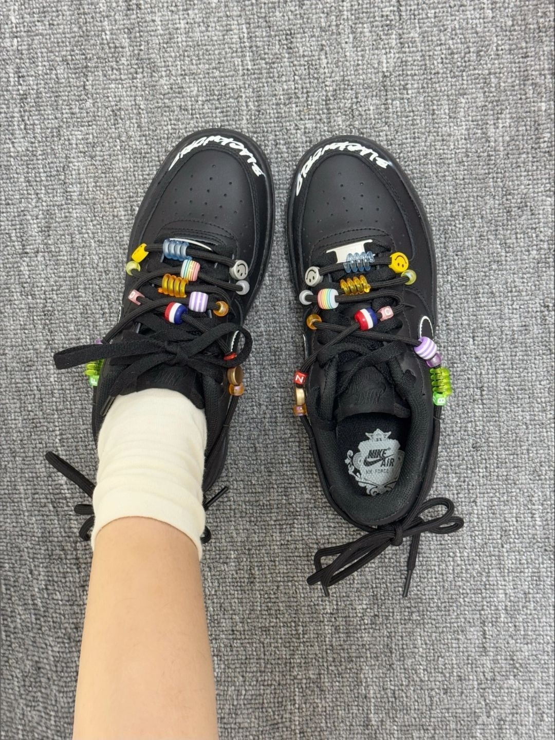 📝是百搭的Nike定制! 黑色板鞋搭配彩色珠珠💛 📸这双显得没有那么沉闷咯 穿上就是有几公分增高✈️ 鞋头字母设计也敲有范儿呢 🧨这双留到过年穿咯!