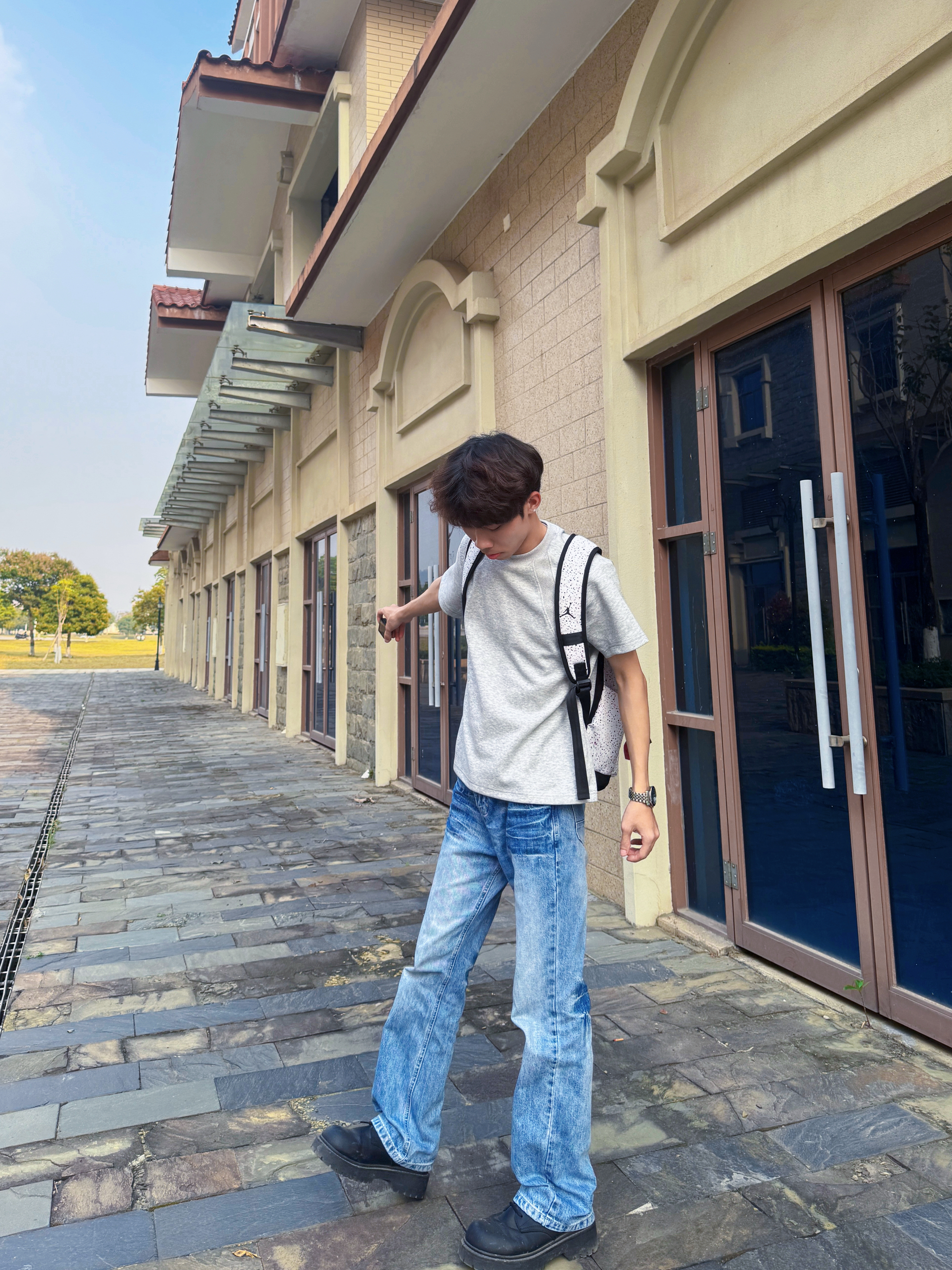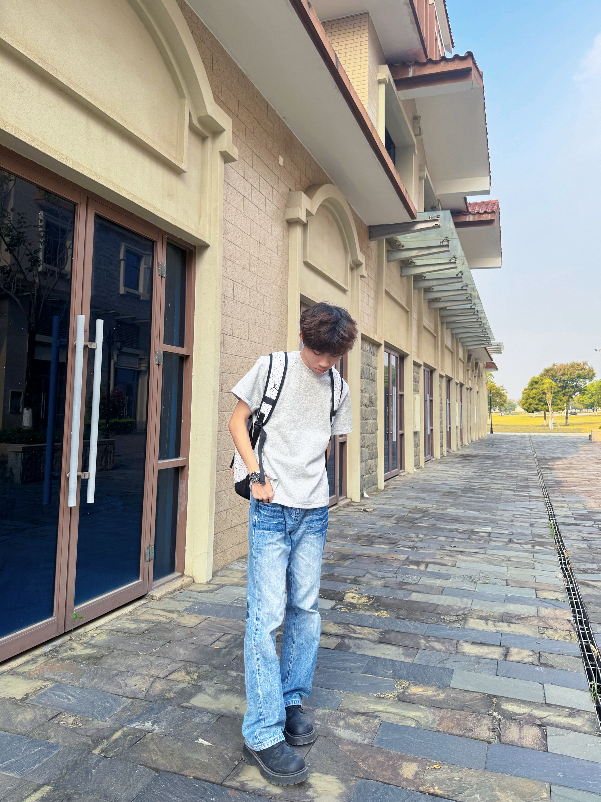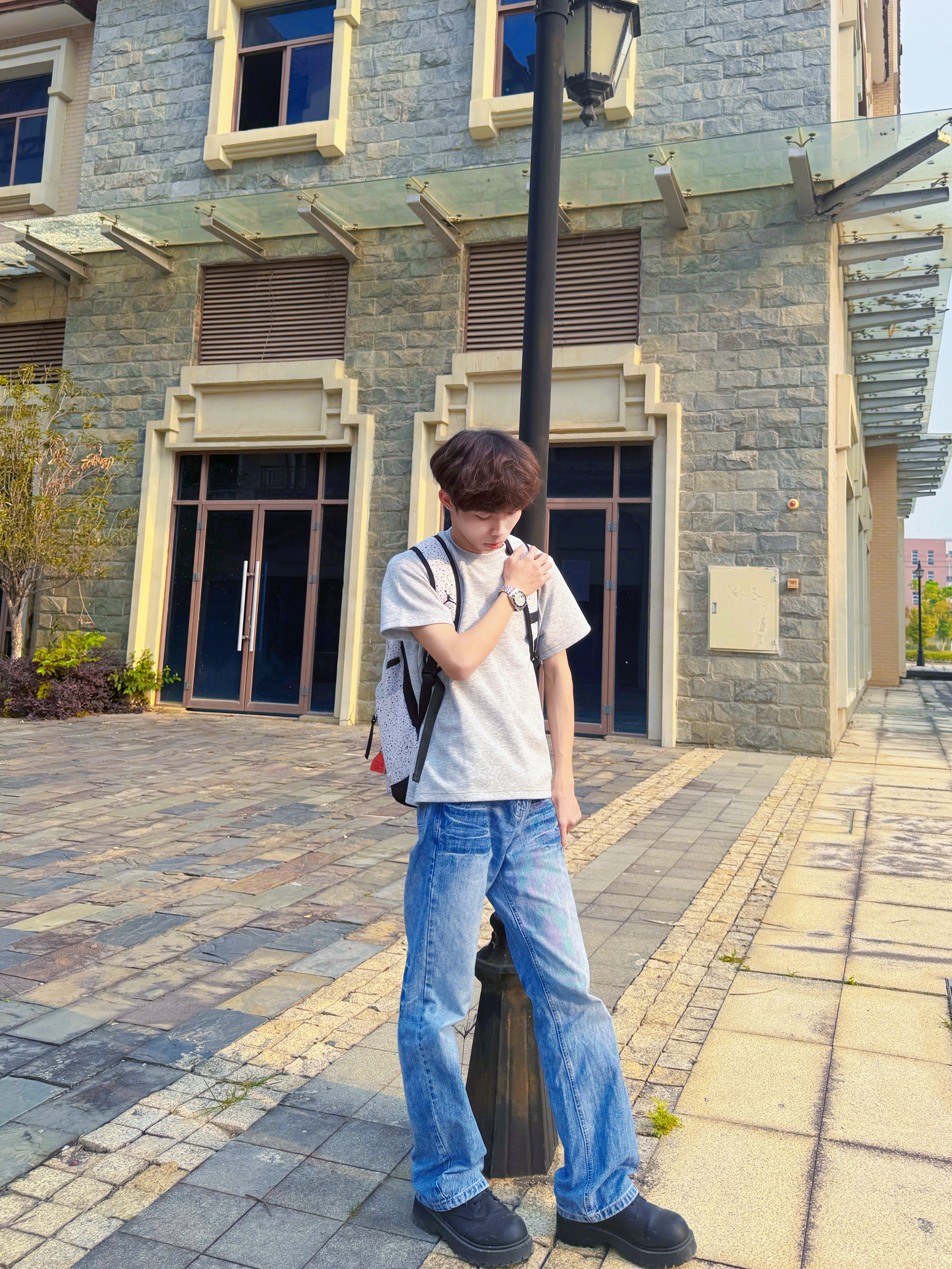 早春这么穿呢? -衣服选择短一点的灰色短袖,宽松的版型,正肩设计,穿上蛮好看的 -裤子选择浅蓝色闪电牛仔裤,盖住鞋脚,让身高比例更好一点 -鞋子选择黑色德比鞋,悄悄增高~