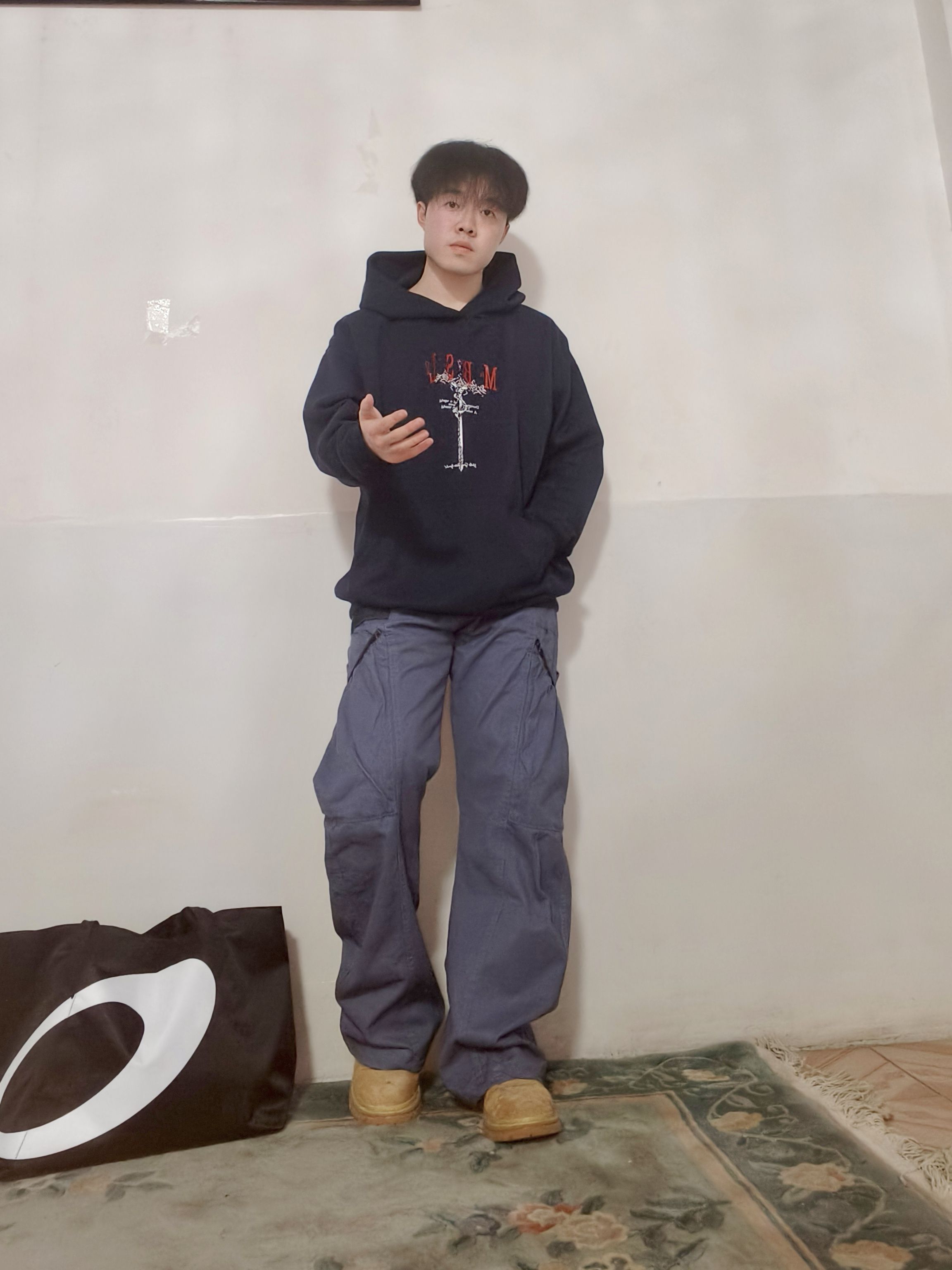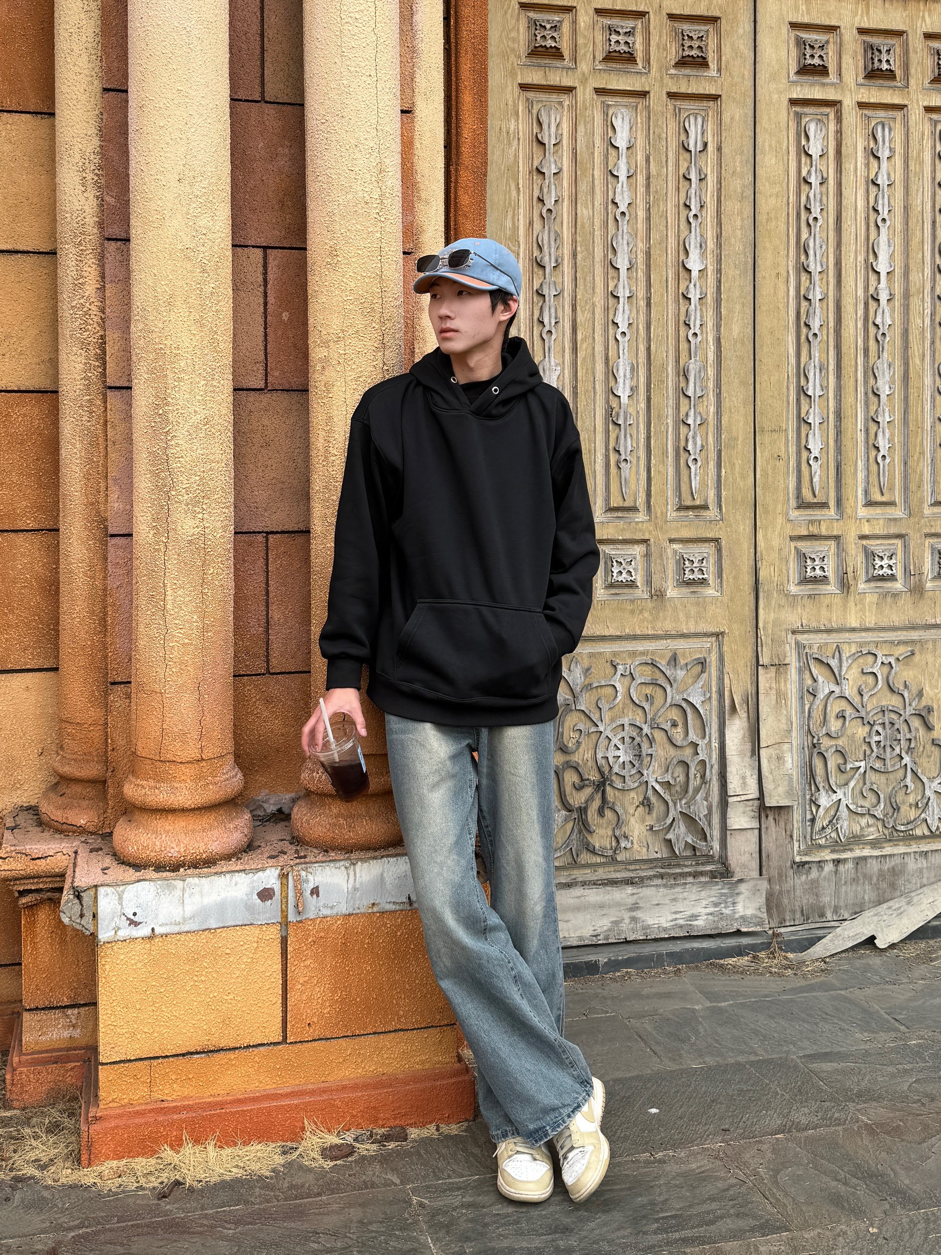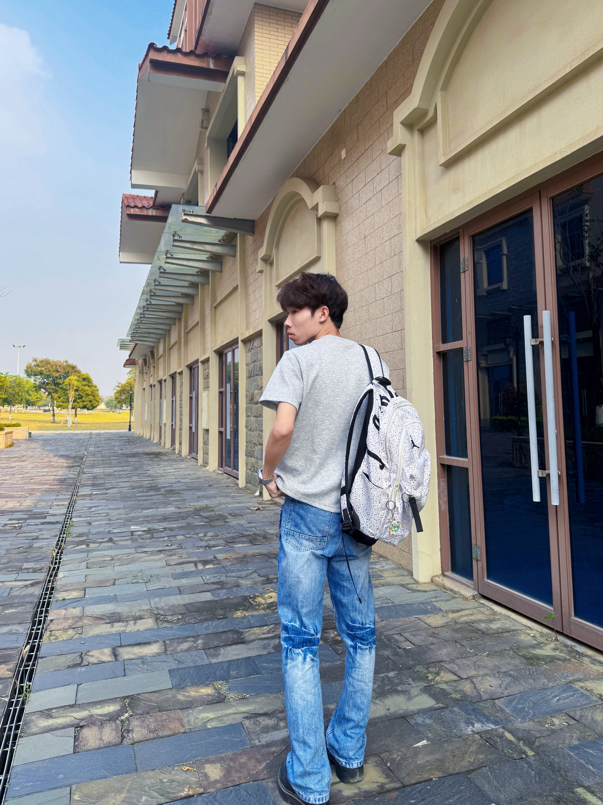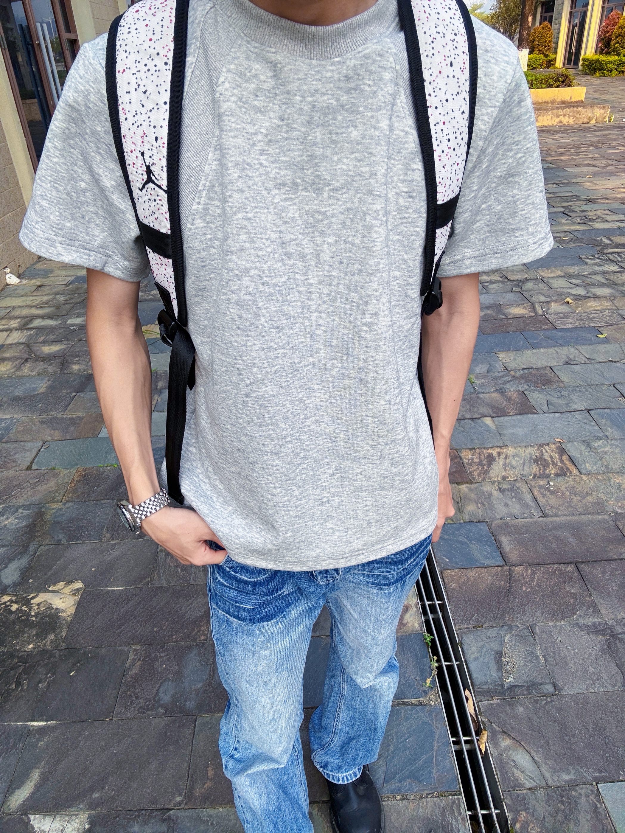 早春这么穿呢? -衣服选择短一点的灰色短袖,宽松的版型,正肩设计,穿上蛮好看的 -裤子选择浅蓝色闪电牛仔裤,盖住鞋脚,让身高比例更好一点 -鞋子选择黑色德比鞋,悄悄增高~