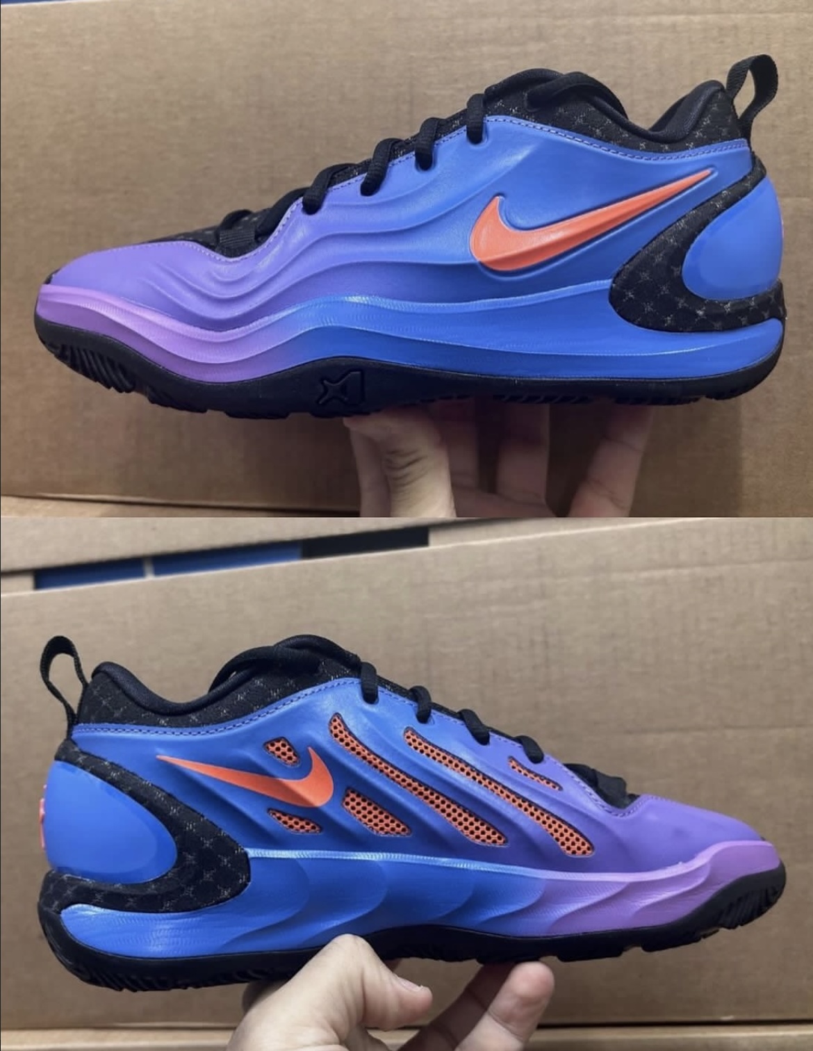 这双AJ2代新配色走的是复古未来风,渐变紫蓝撞色+橙红Swoosh,视觉冲击力拉满: