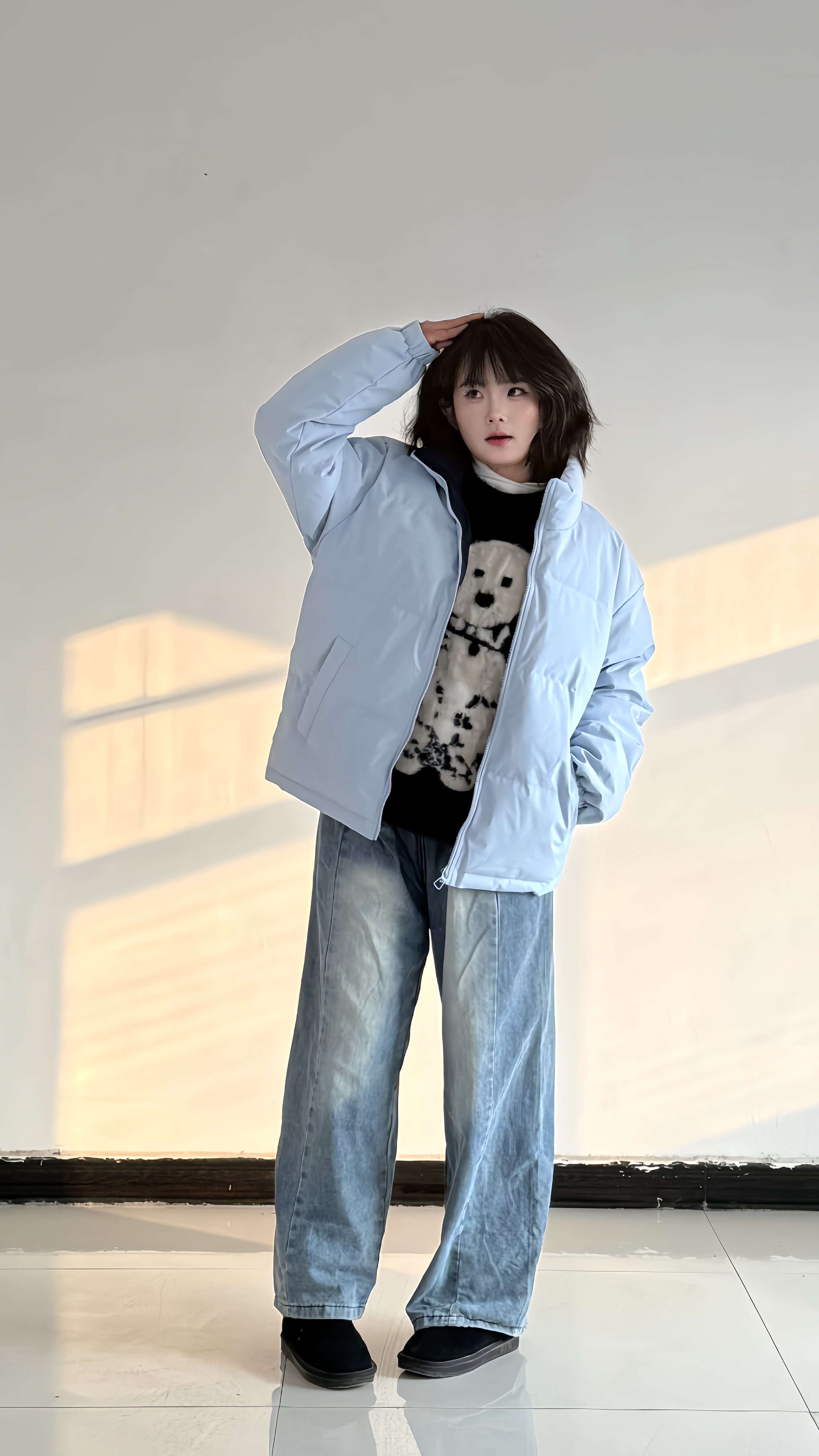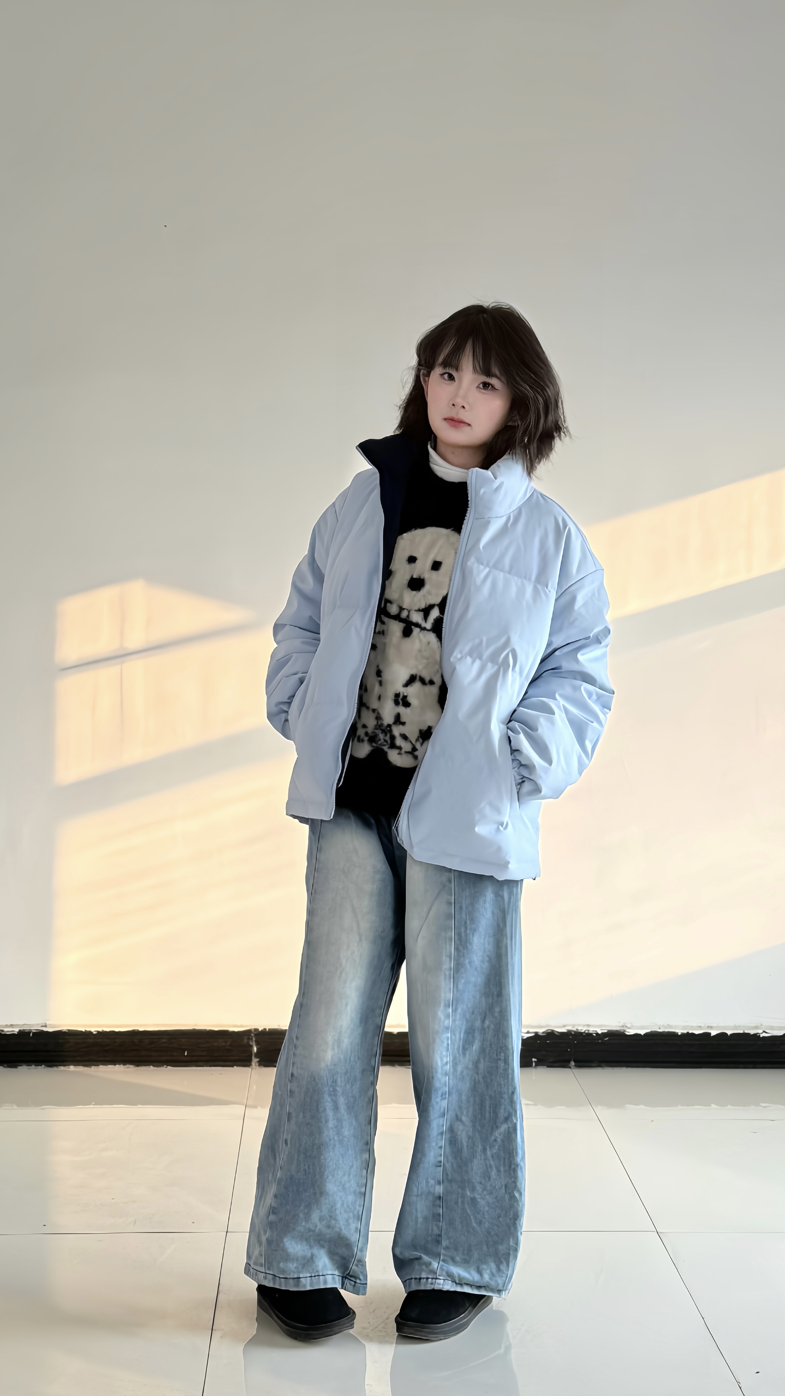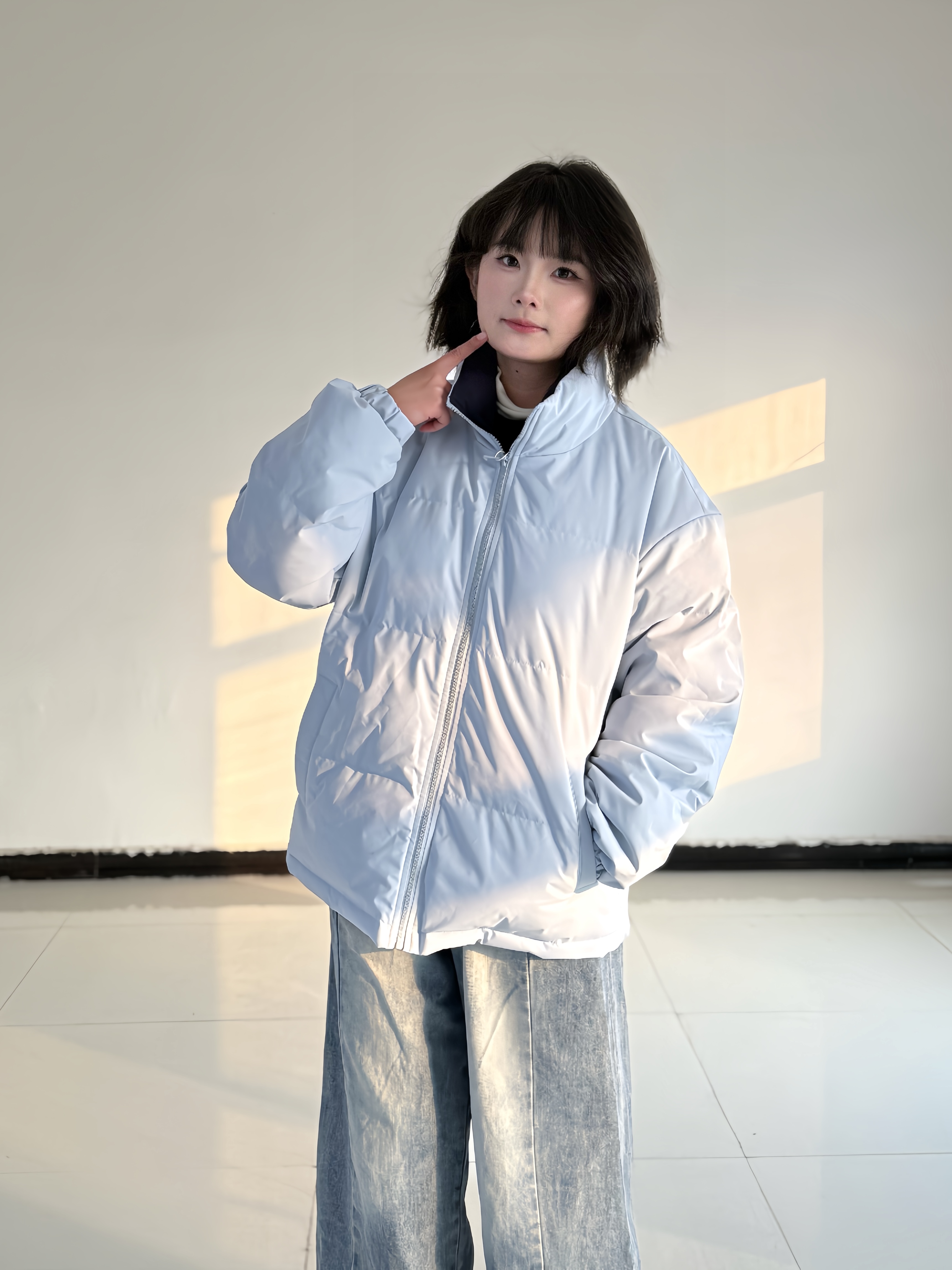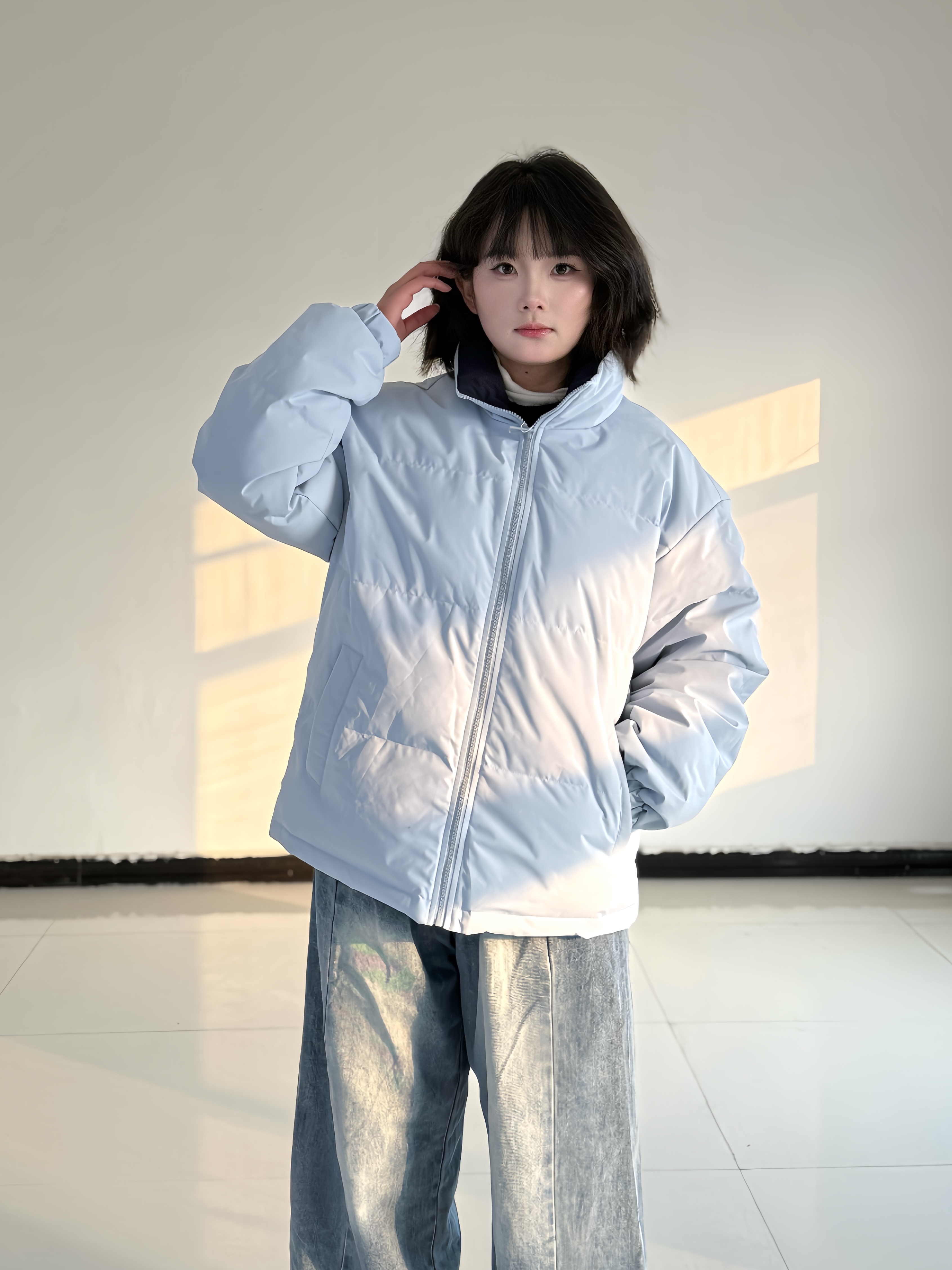 浅雾蓝棉服自带清冷柔和的视觉氛围,立领设计利落挡风,蓬松度刚好适配日常通勤的保暖需求。 宽松版型对各类身材都很包容,内搭一件黑白撞色针织衫,可增加造型层次,弱化棉服的厚重感。 下装搭配做旧水洗阔腿牛仔裤,垂坠感的裤型能自然修饰腿线,让整体风格更显随性自在。 整套穿搭以浅色系为主,色彩清爽和谐,既满足冬日保暖需求,又能呈现舒适不刻意的时髦感。