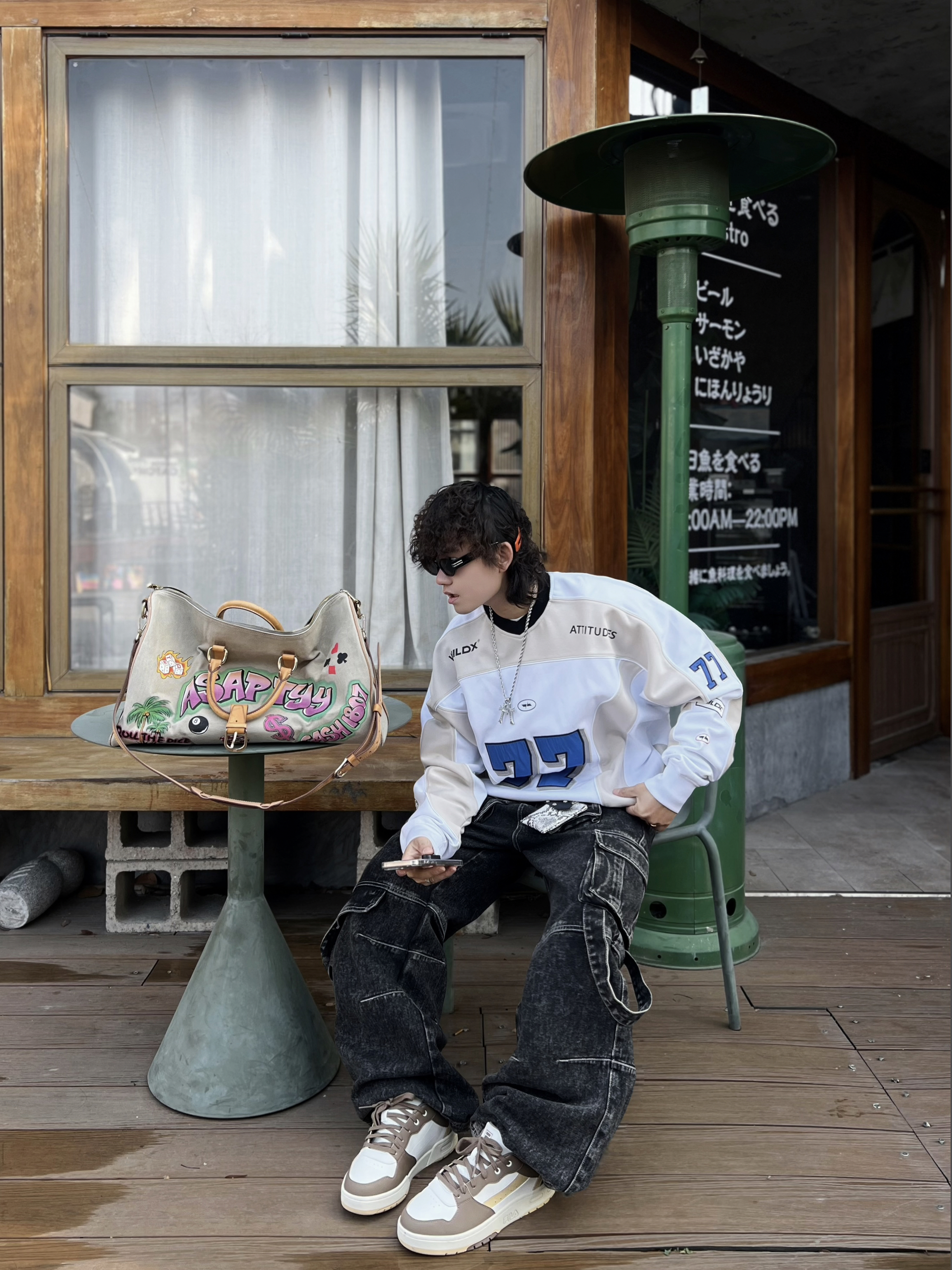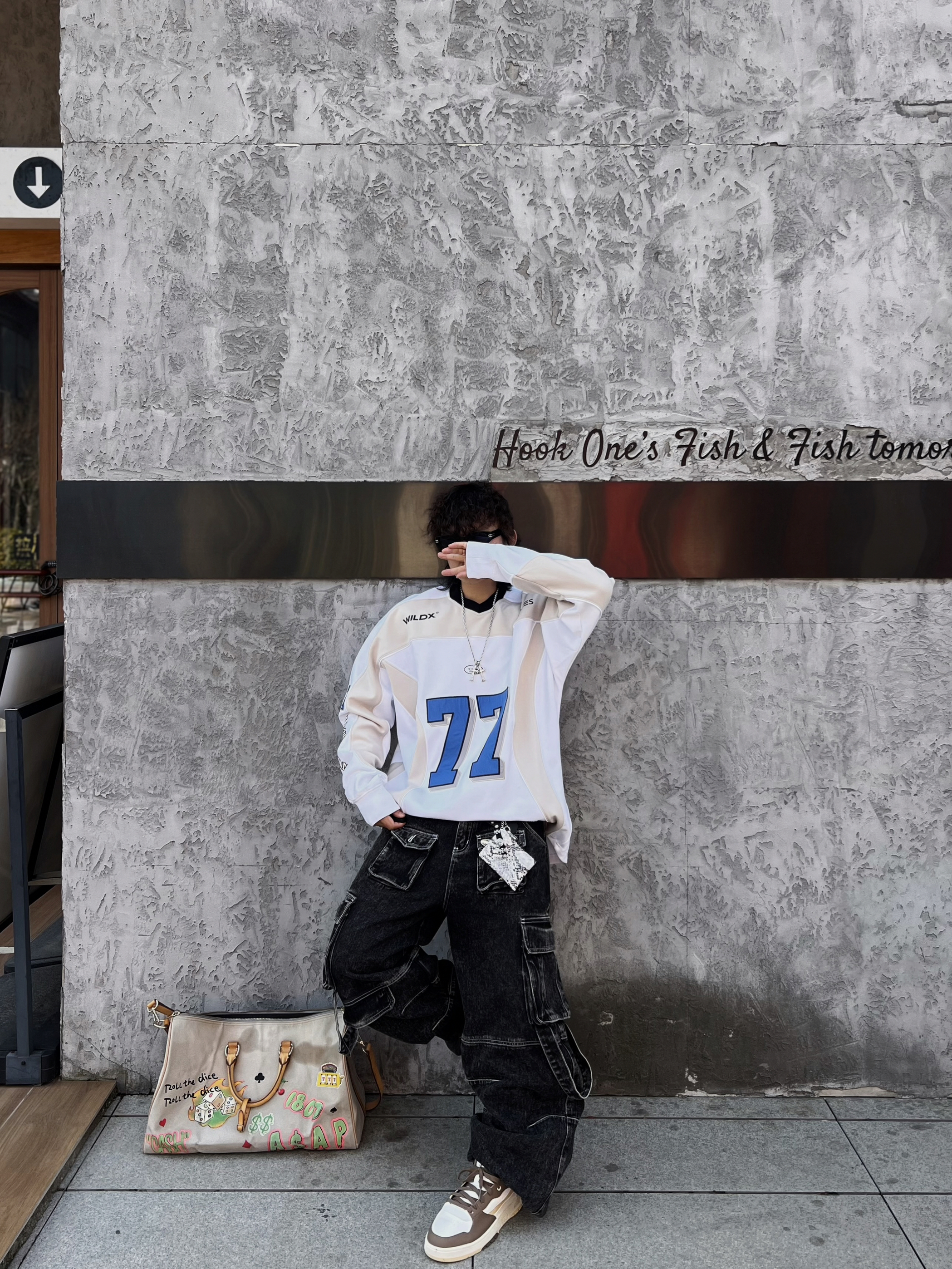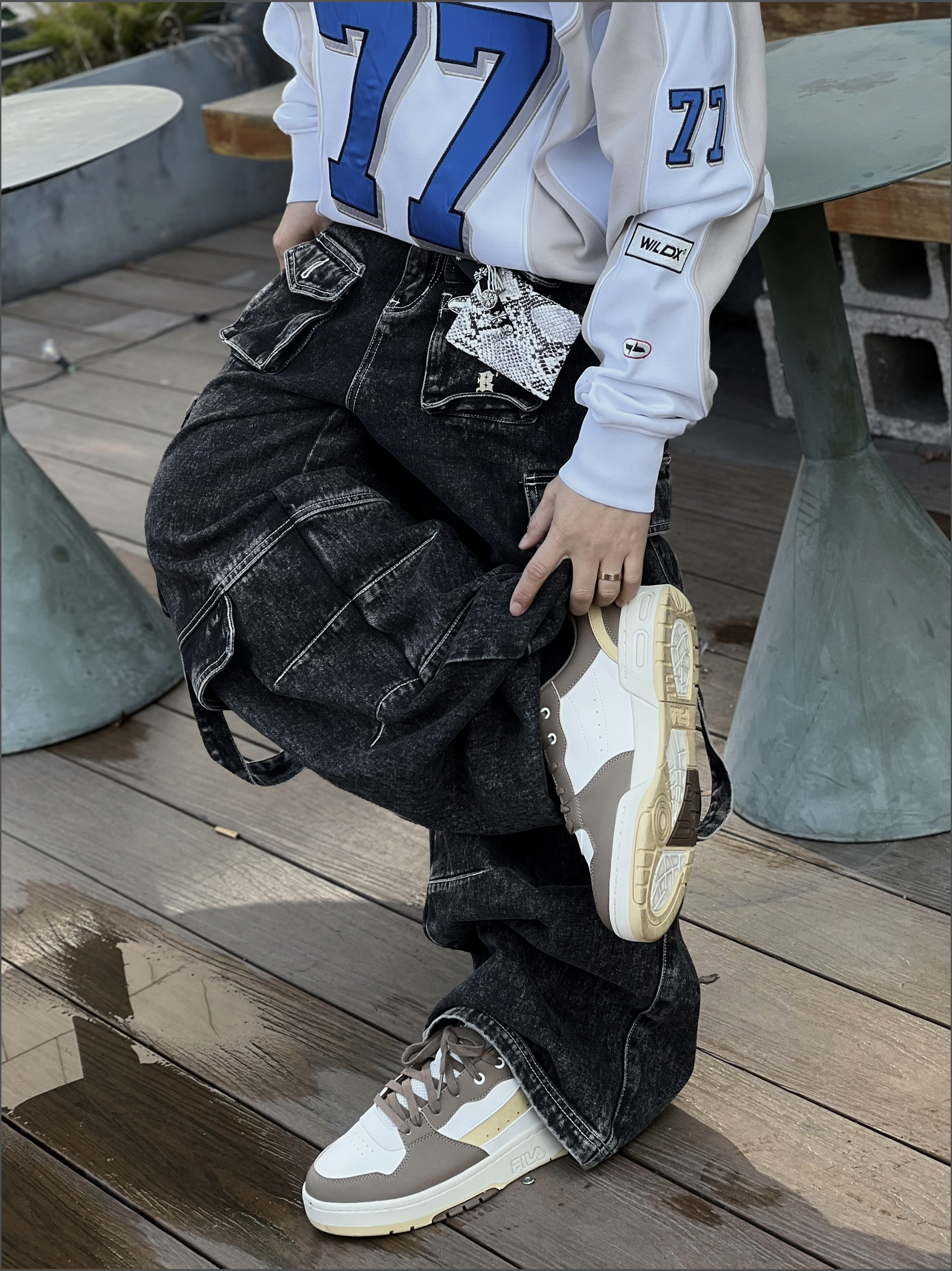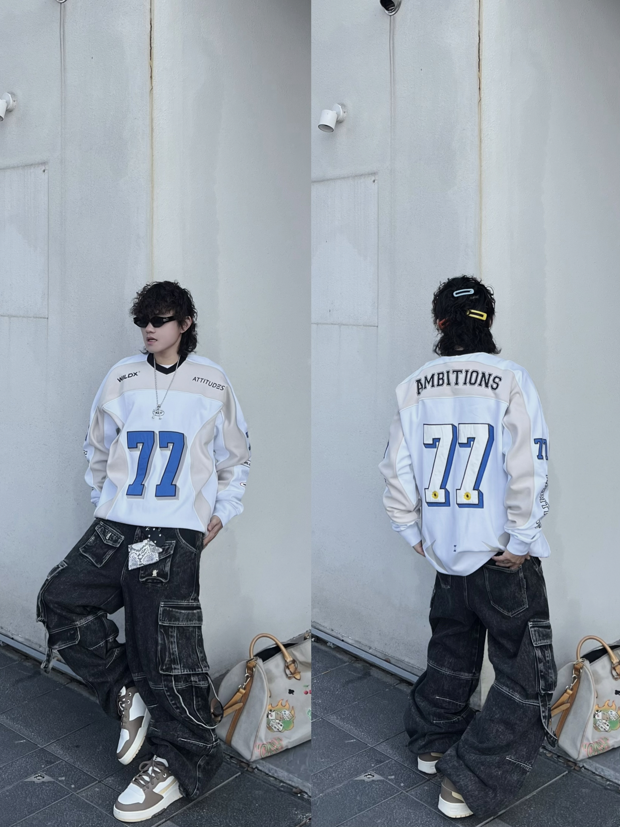 ‼️早春潮人态度,就得是美式复古+松弛感双重拉满! • 👔核心单品:蓝白拼色77号球衣,美式运动风拿捏,oversize版型遮肉又随性 • 👖下装搭配:做旧工装牛仔裤,多口袋设计自带街头质感,层次感拉满 • 细节点睛: ◦ 撞色 FILA 运动鞋呼应衣身色调,整体更和谐 ◦ 涂鸦旅行包作为亮点,中和深色沉闷,活力感十足 ◦ 银链配饰+口袋挂饰,细节感满满,潮范儿十足 • 态度氛围...