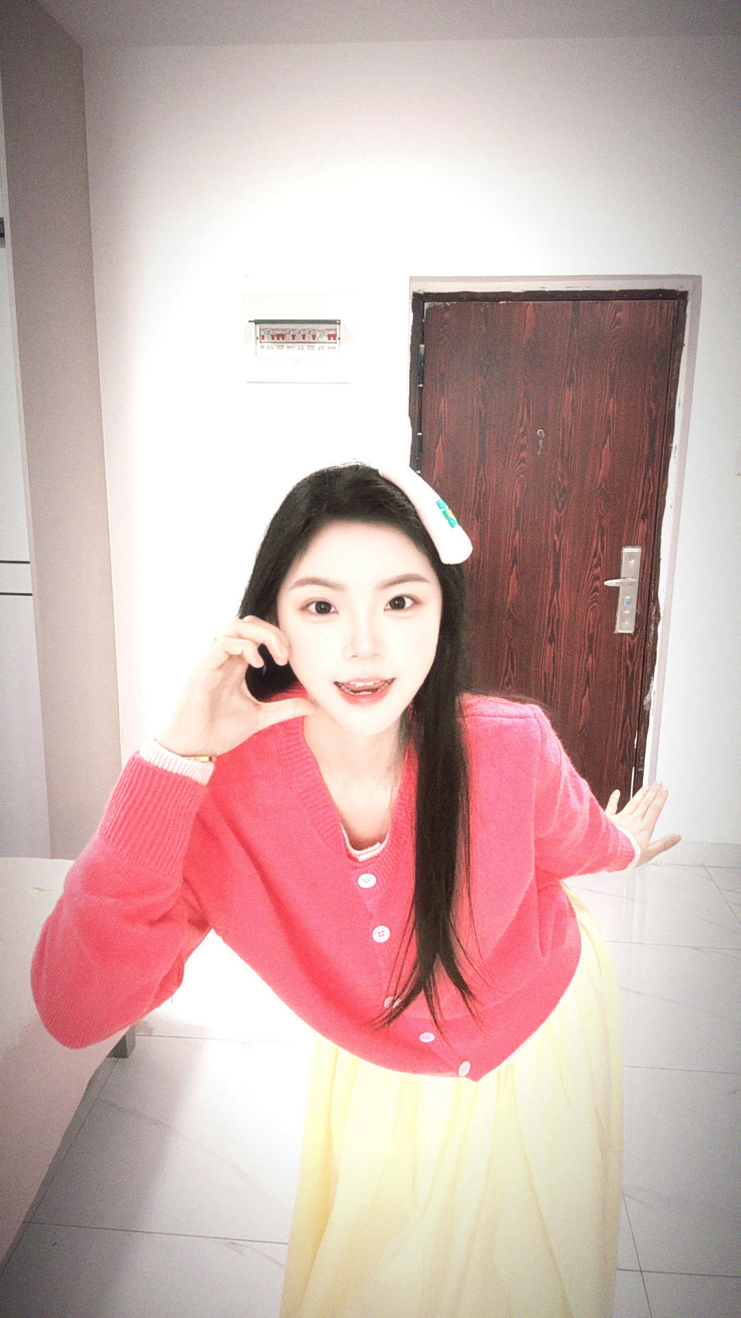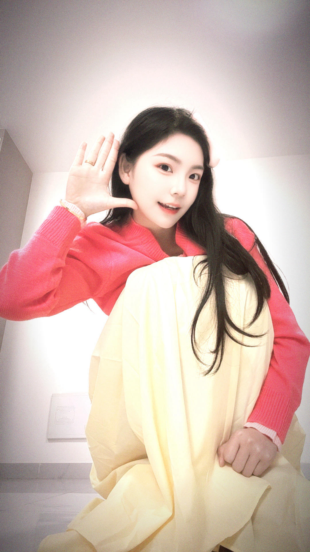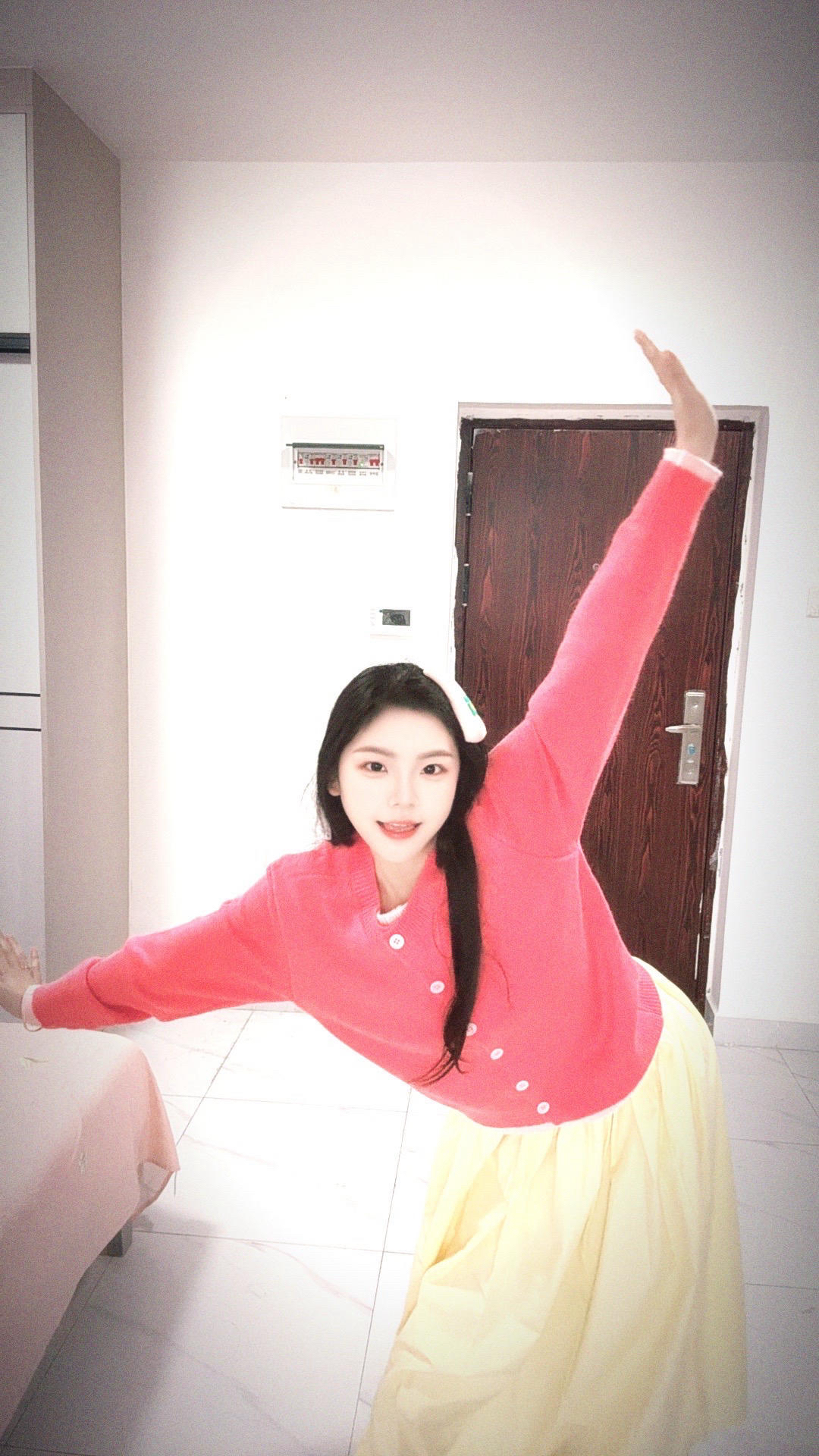 粉色的假两件上衣搭配黄色半身裙 春日的氛围感真的太足了 甜美又可爱 淡黄色的半身裙真的像甜甜的小蛋糕 但是毛衣是针织的摩擦久了也会起小球