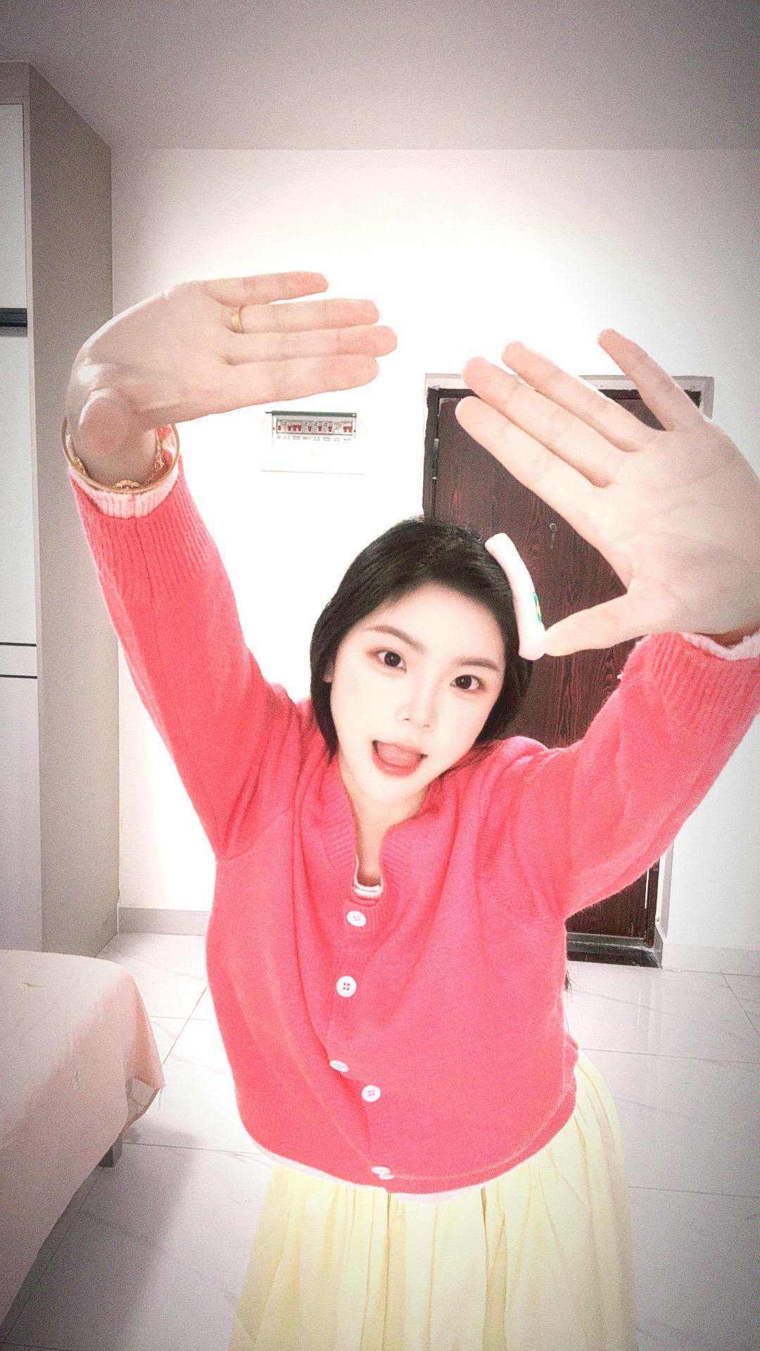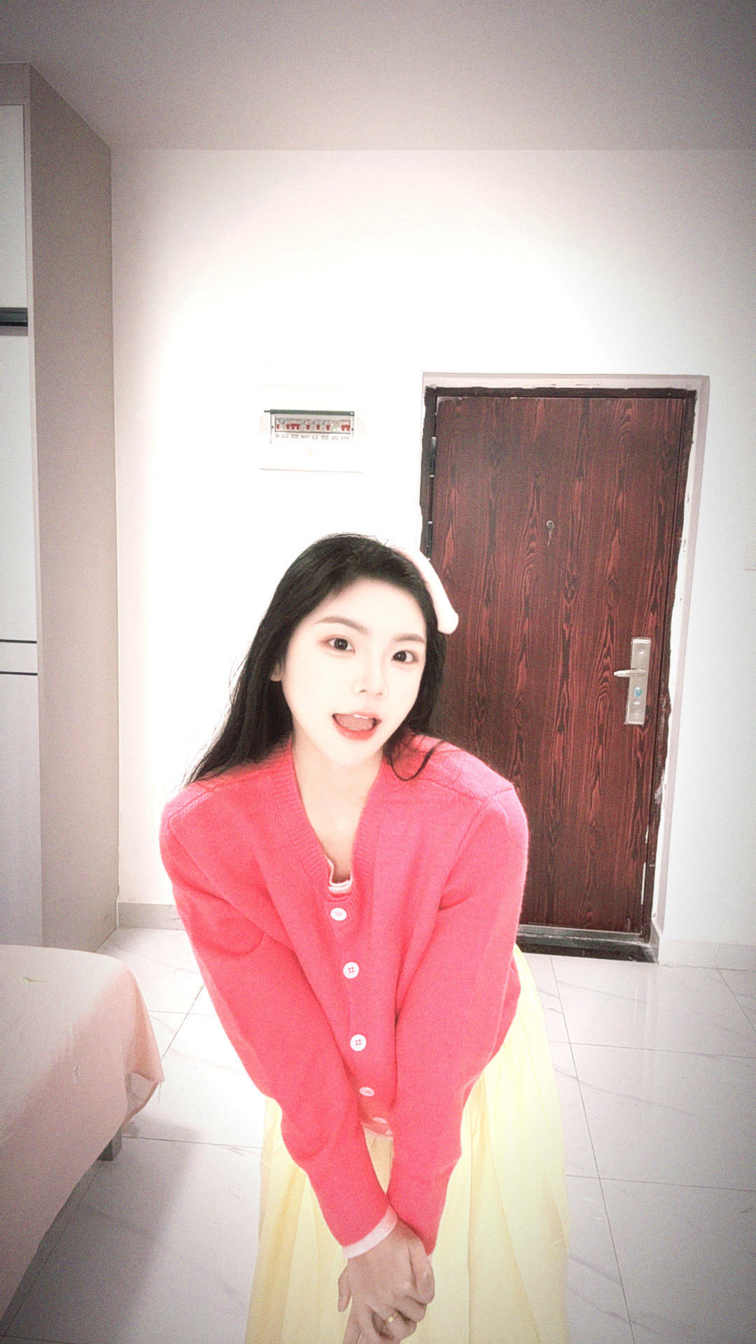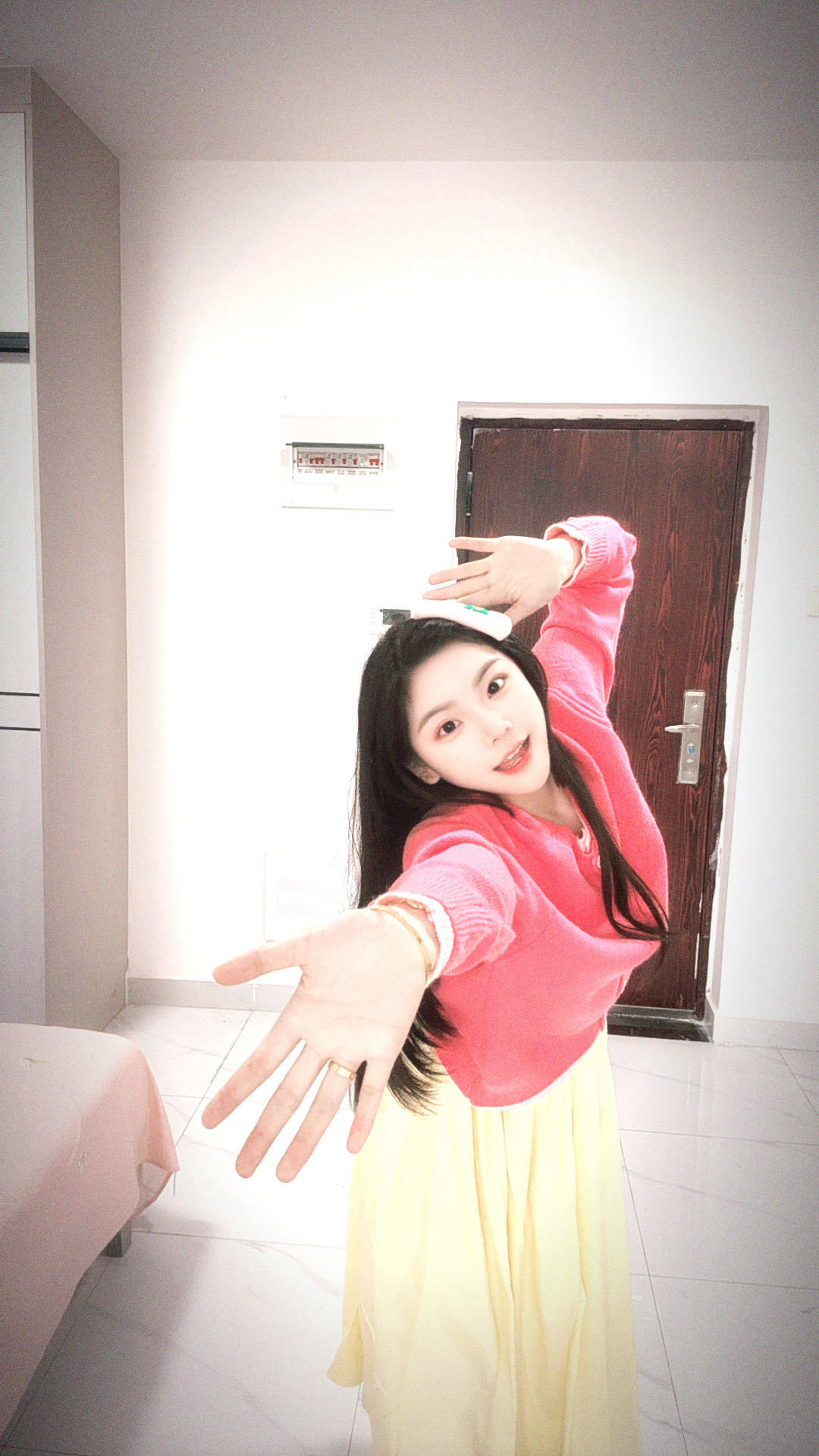 粉色的假两件上衣搭配黄色半身裙 春日的氛围感真的太足了 甜美又可爱 淡黄色的半身裙真的像甜甜的小蛋糕 但是毛衣是针织的摩擦久了也会起小球