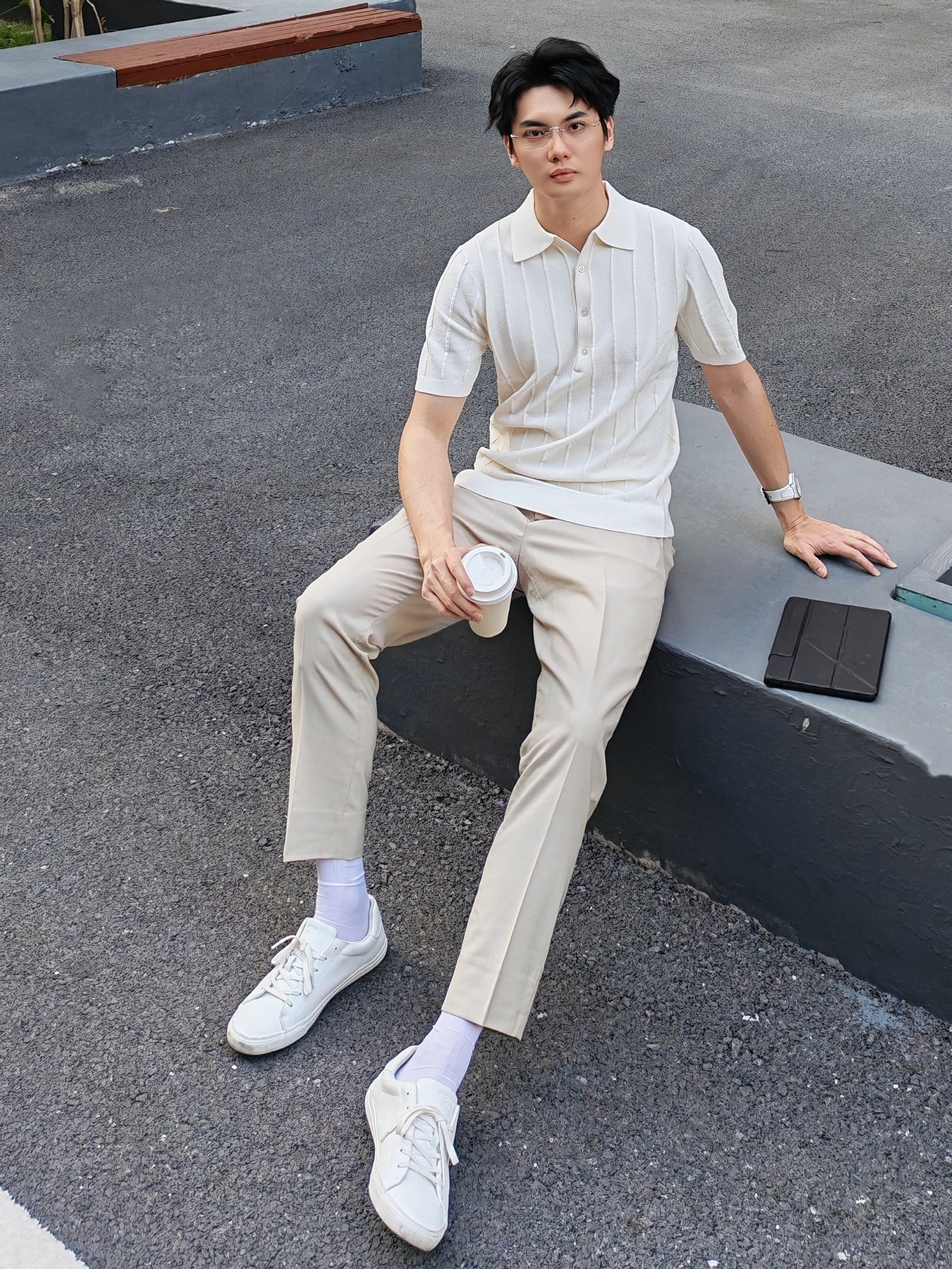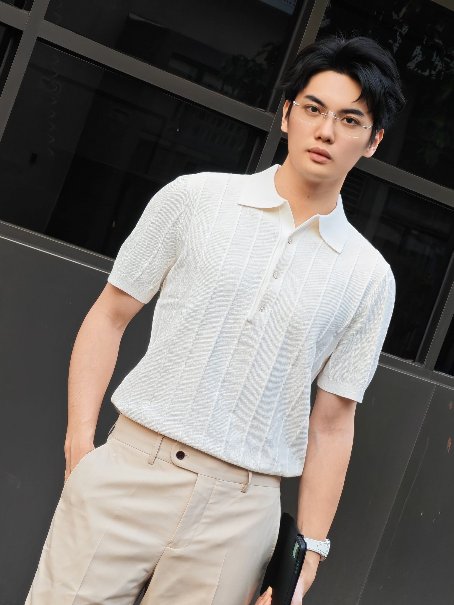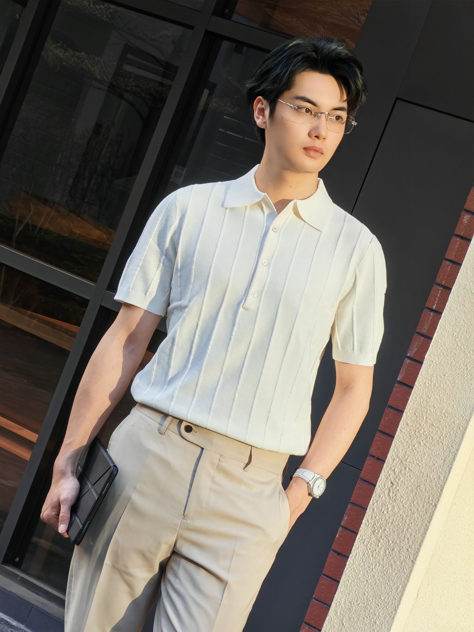 hi 这里是镭子的通勤松弛感穿搭分享 米白竖条纹针织Polo衫,肌理感拉满,清爽又显质感。 搭配浅卡其高腰西裤,利落垂坠,弱化正式感更显随性。 脚踩小白鞋,舒适透气,适配通勤、约会、周末出行等多种场景。 细框眼镜与简约腕表点缀,整体干净温柔,轻松拿捏不费力的高级感。