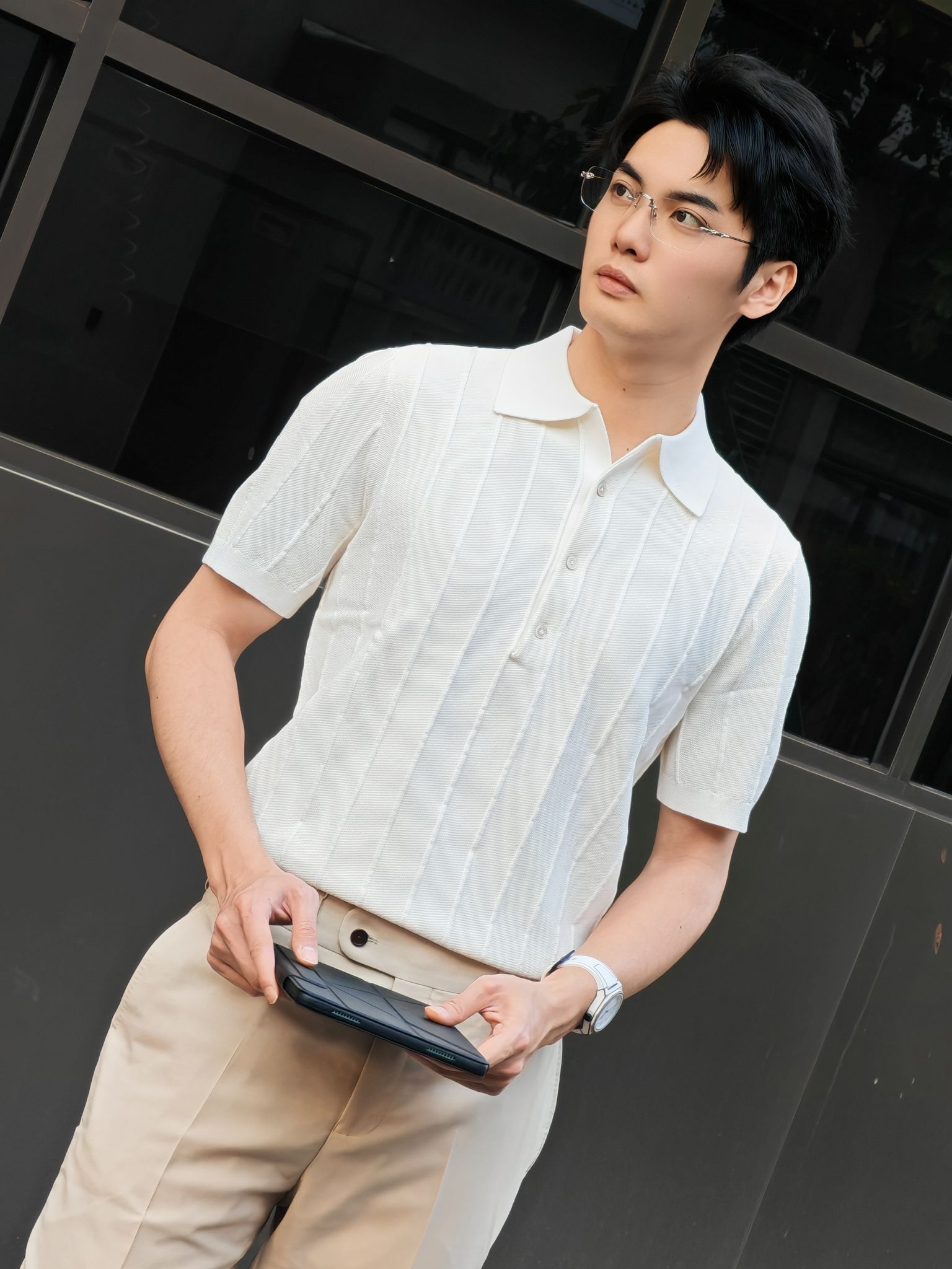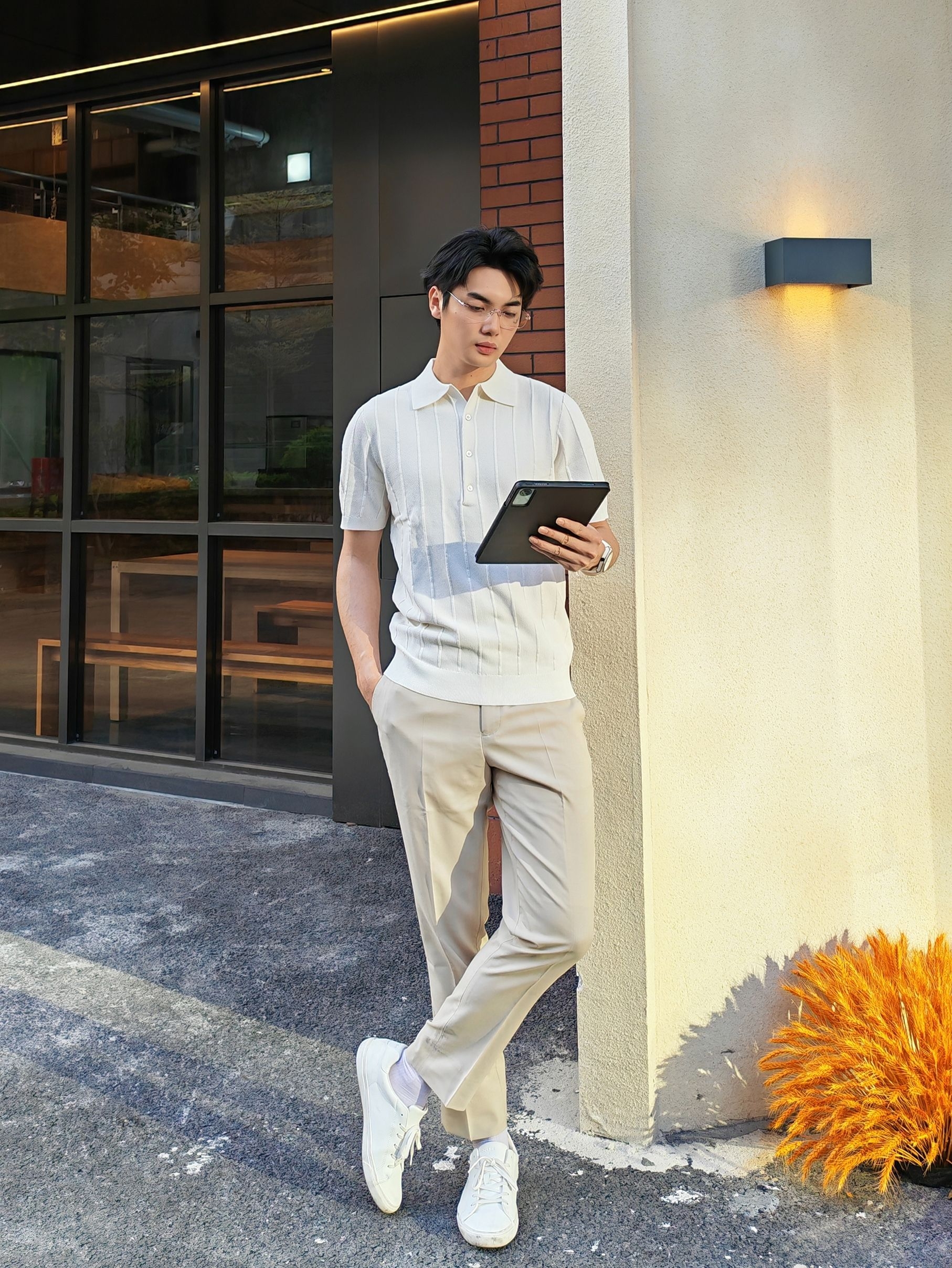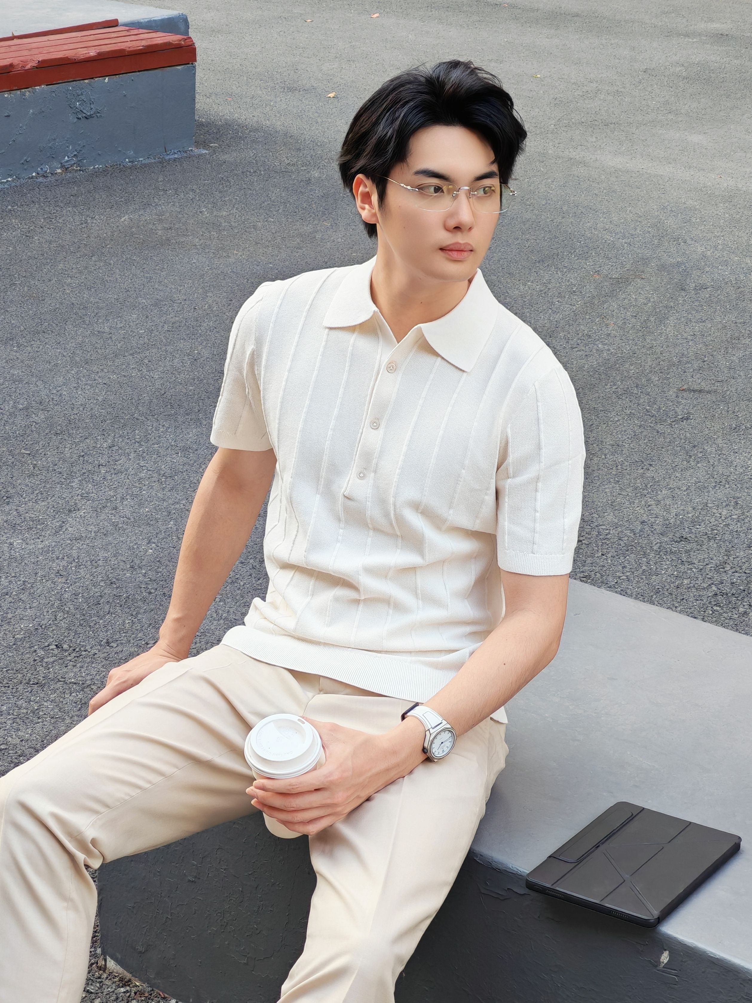 hi 这里是镭子的通勤松弛感穿搭分享 米白竖条纹针织Polo衫,肌理感拉满,清爽又显质感。 搭配浅卡其高腰西裤,利落垂坠,弱化正式感更显随性。 脚踩小白鞋,舒适透气,适配通勤、约会、周末出行等多种场景。 细框眼镜与简约腕表点缀,整体干净温柔,轻松拿捏不费力的高级感。