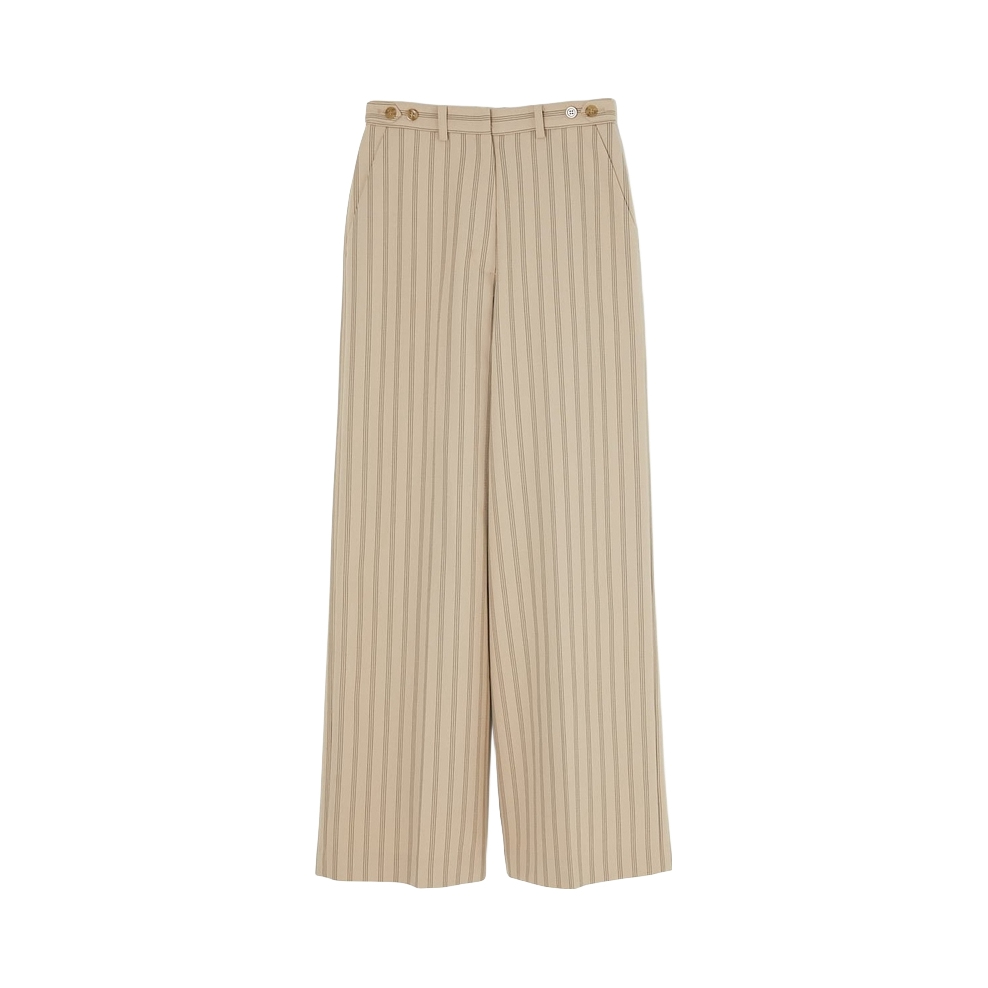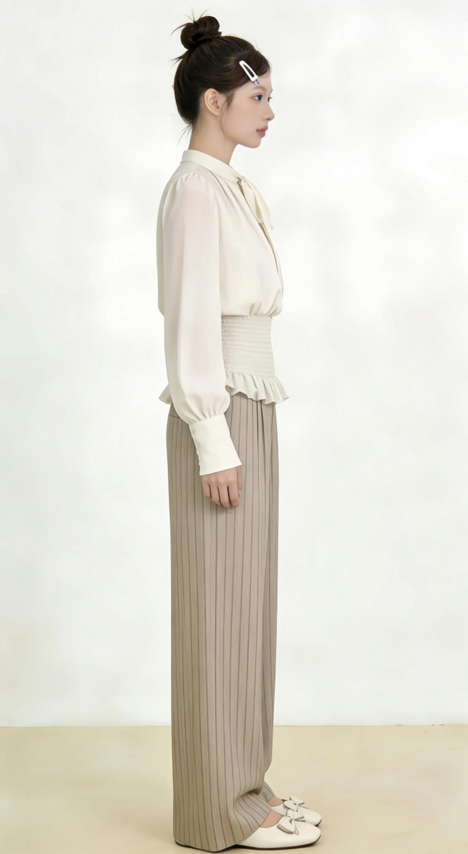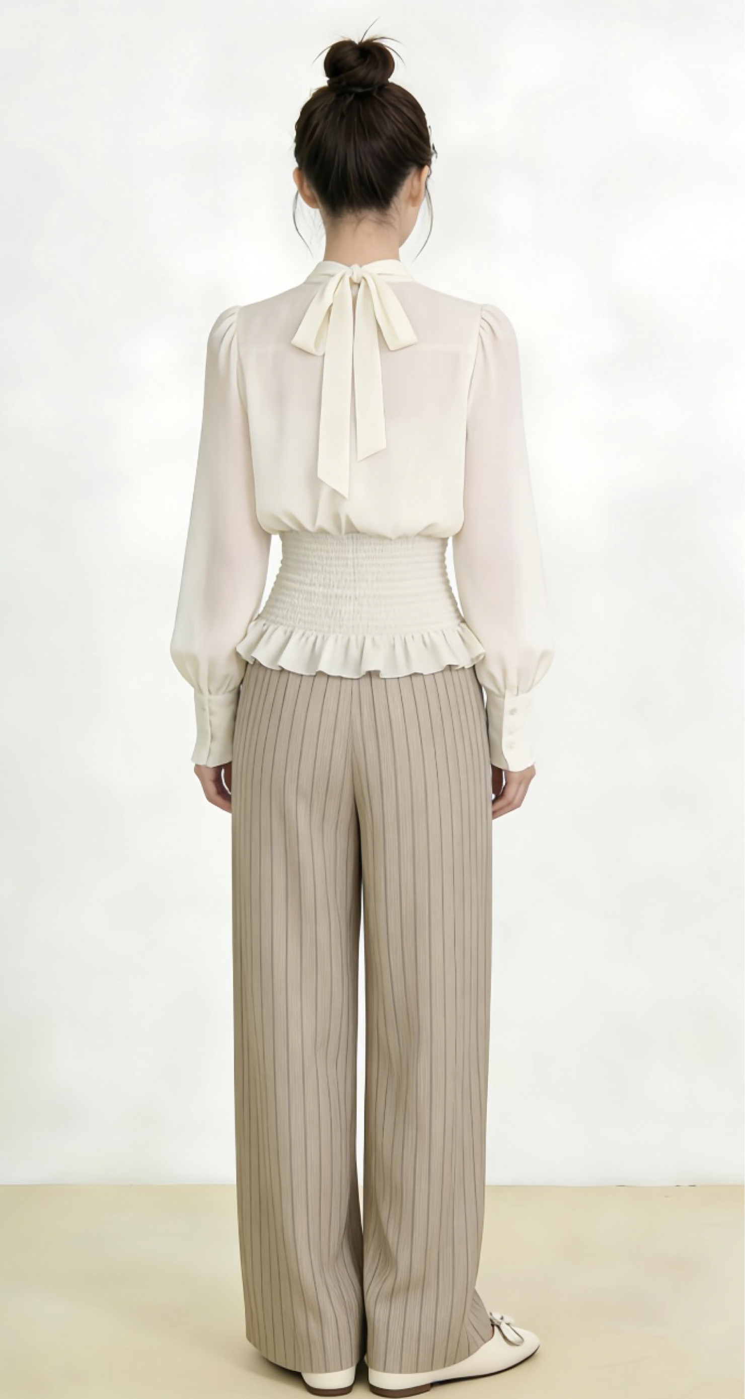 这套真的是通勤党的天菜! 奶杏色蝴蝶结领衬衫+松紧腰荷叶边设计,温柔又显腰线,搭配卡其色竖条纹阔腿裤,垂感超棒还藏肉,小个子也能穿出大长腿~