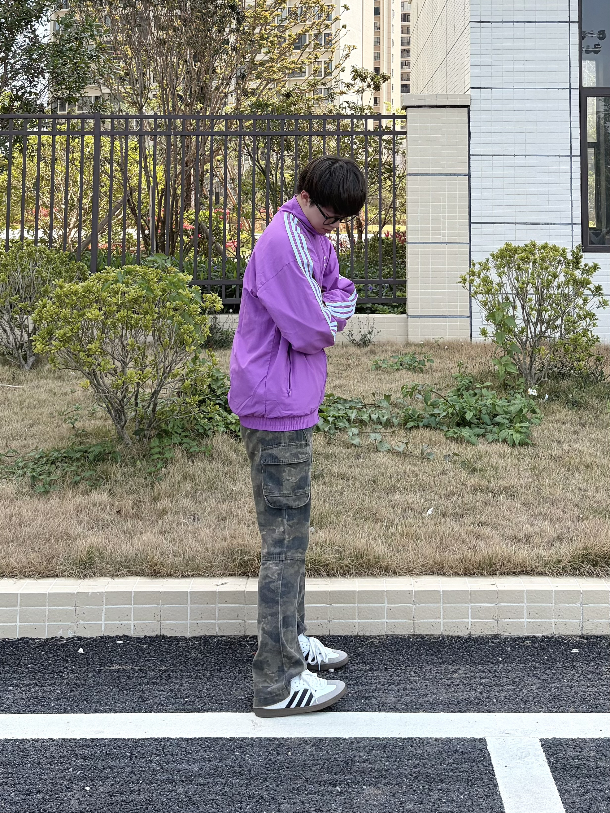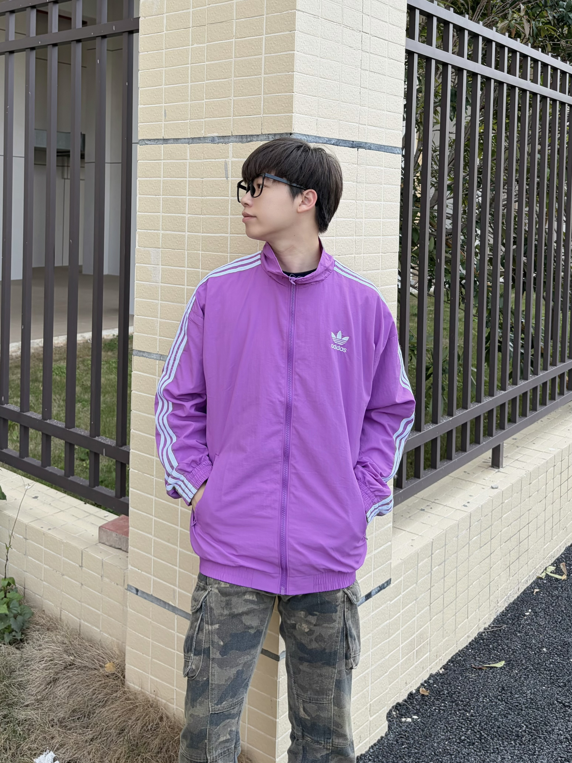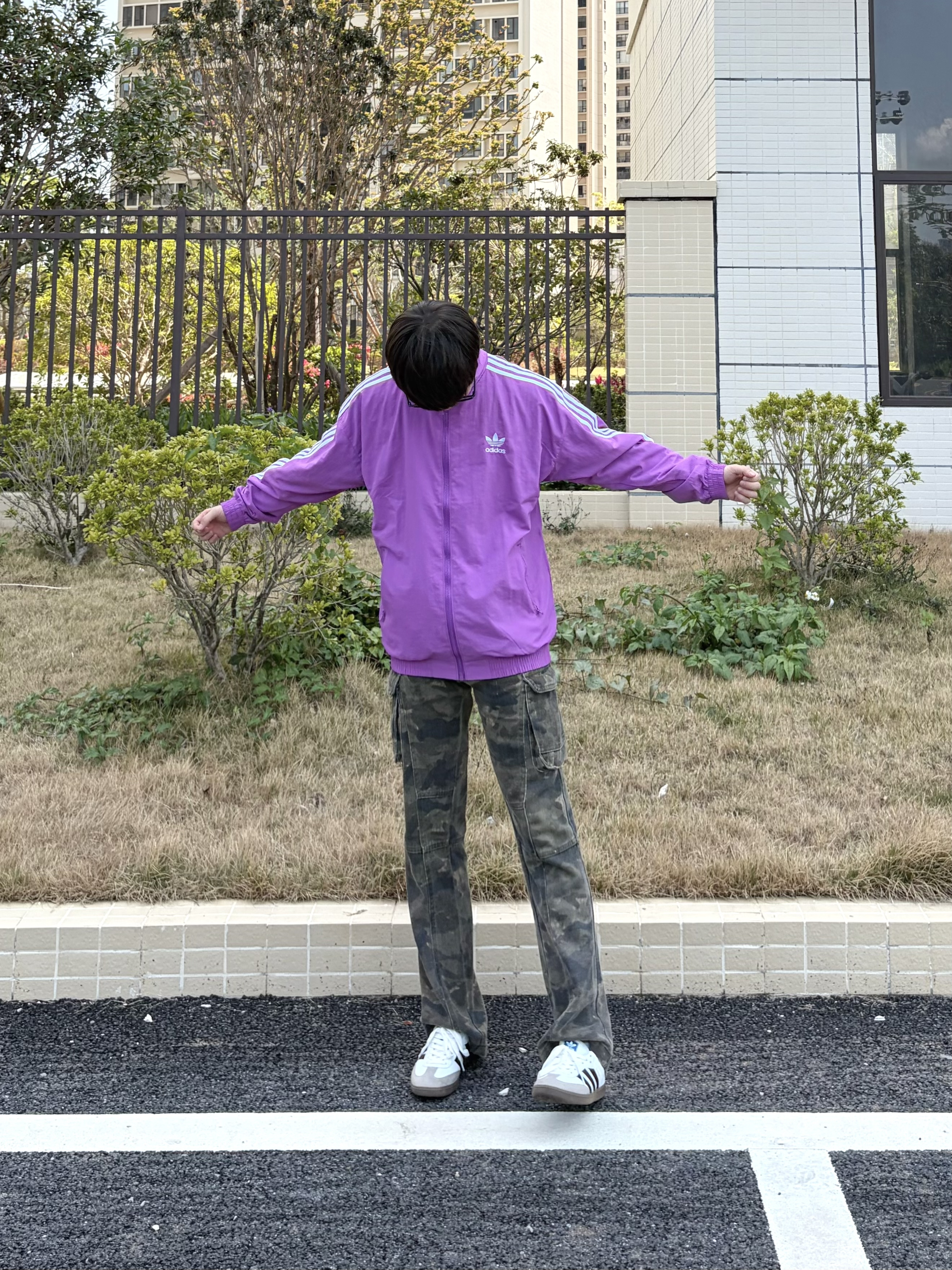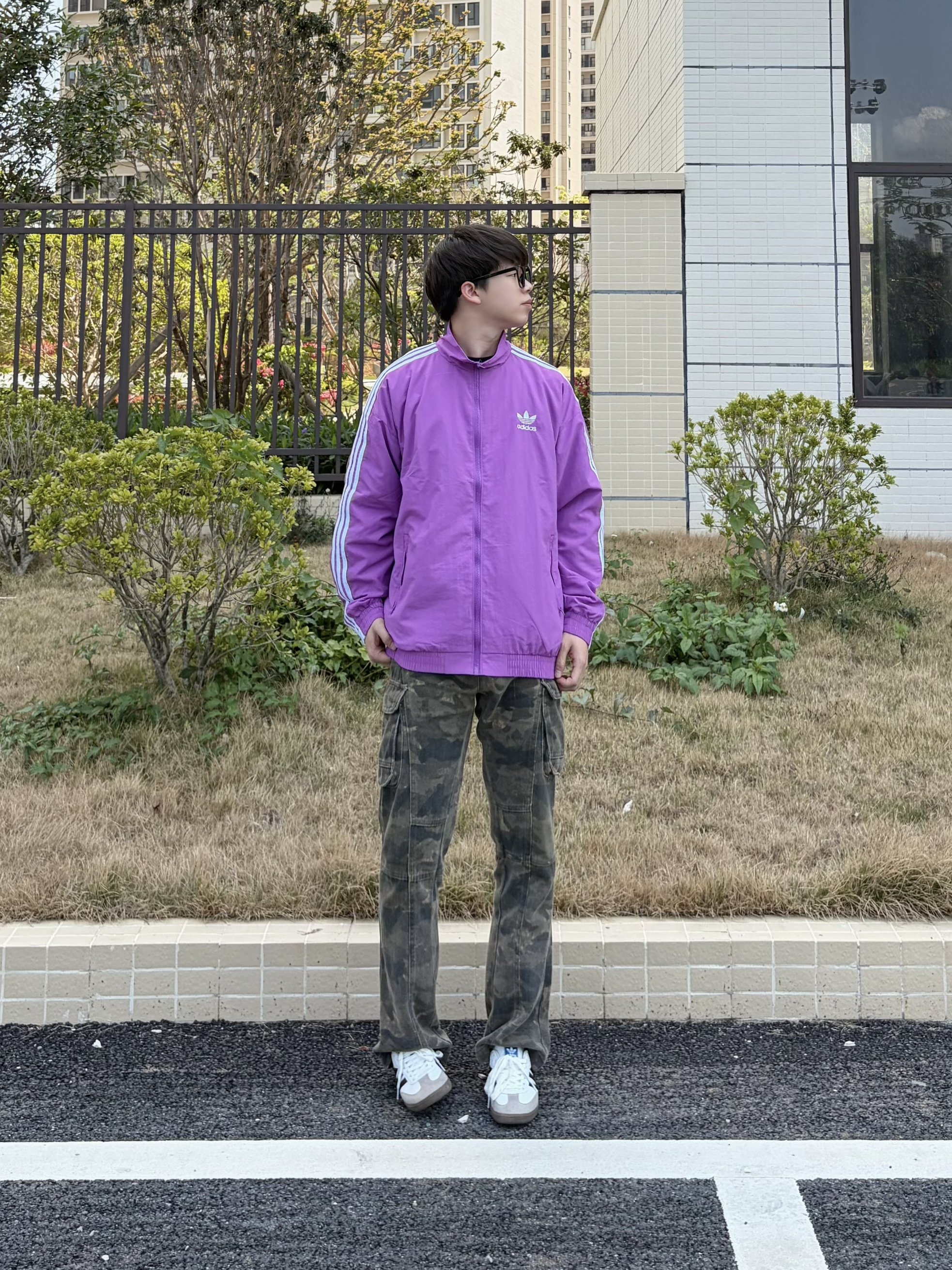 早春的风还带着点清爽🍃 出门上身了阿迪紫调立领外套👔 简约颜值日常穿毫无负担 搭配做旧迷彩工装裤👖 以及上脚双复古德训板鞋👟 一套下来随性又有辨识度