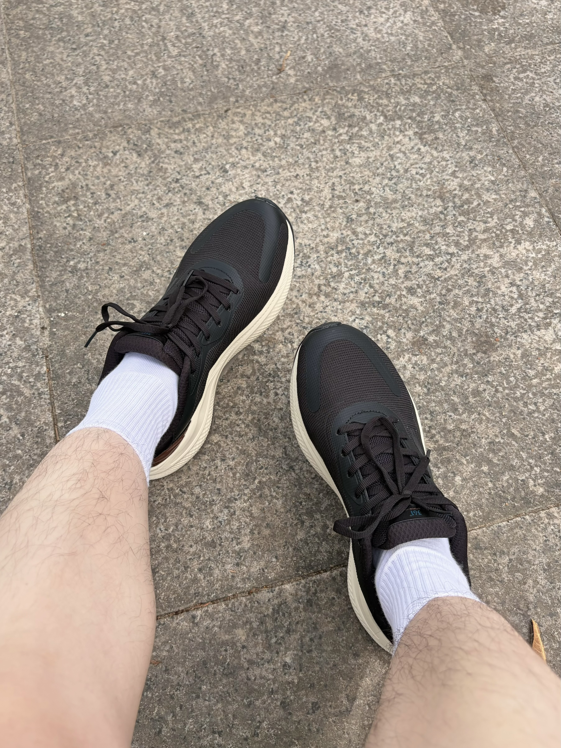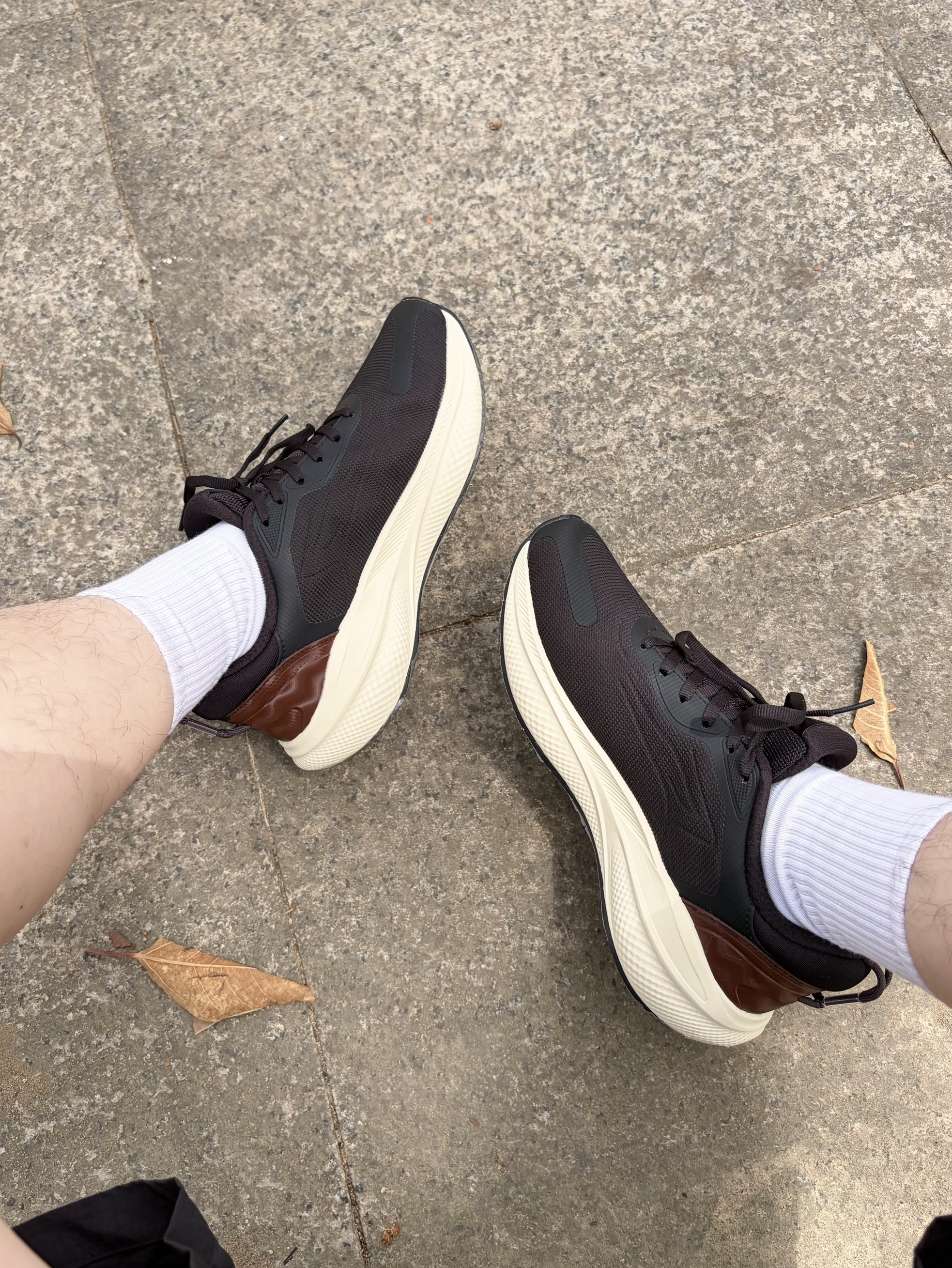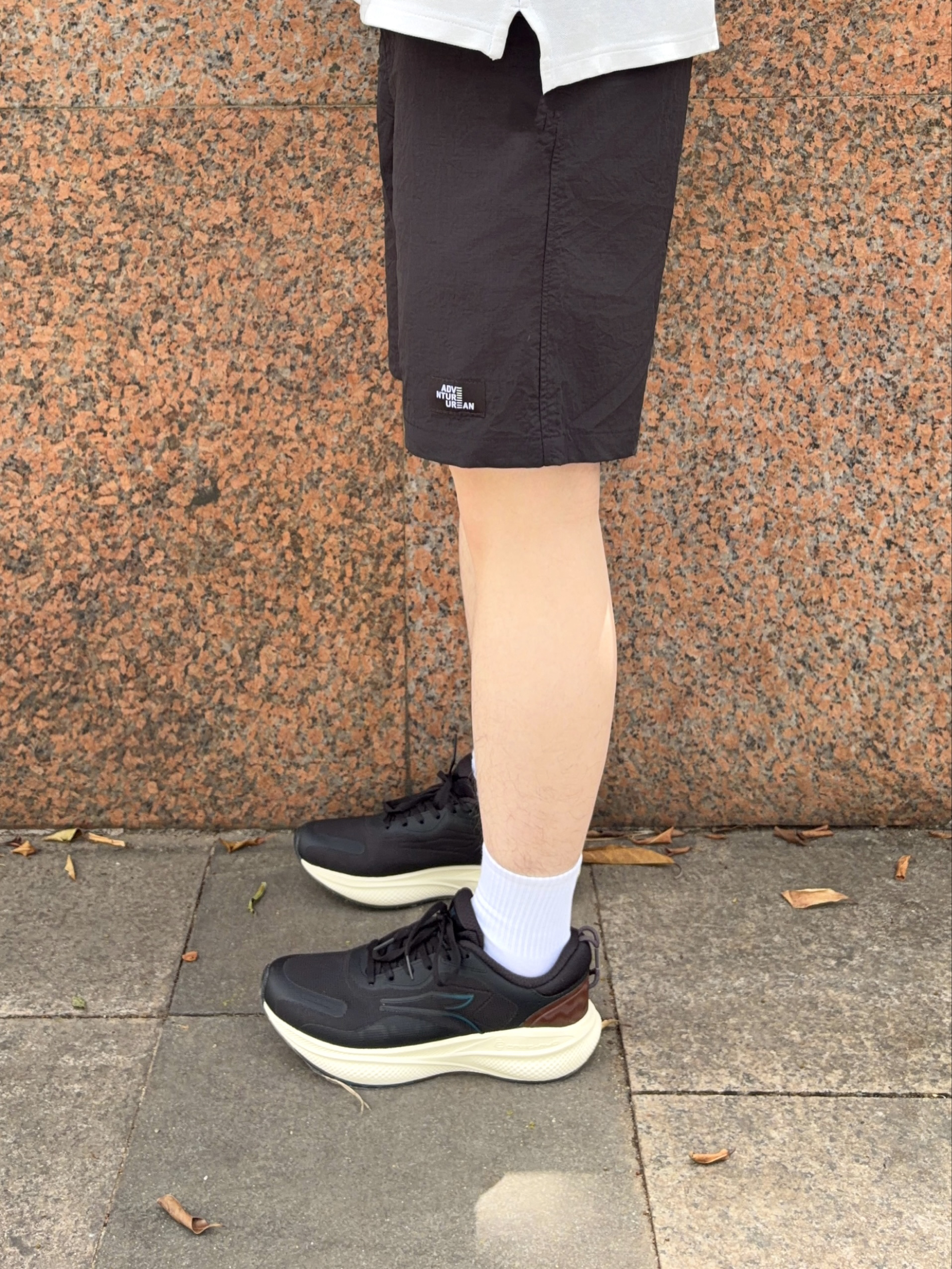 上脚了 361° 这双黑米棕休闲跑鞋xiet 经典黑白配色低调又耐看 网面透气 厚底踩感软弹舒适🌬️ 日常慢跑或通勤都很稳✅ 搭配白Polo衫👕与黑短裤 一身清爽利落 户外自在又随性🔥
