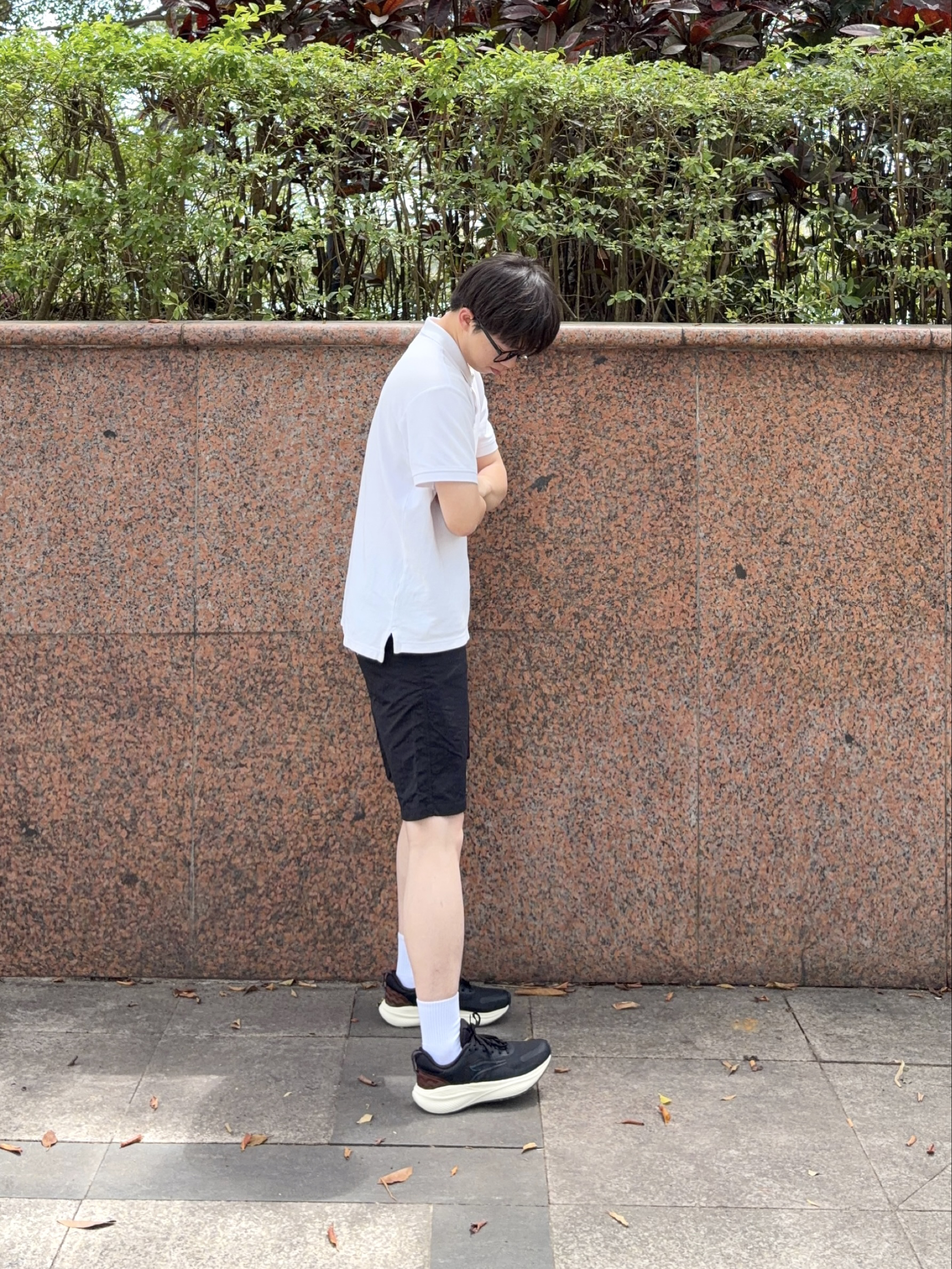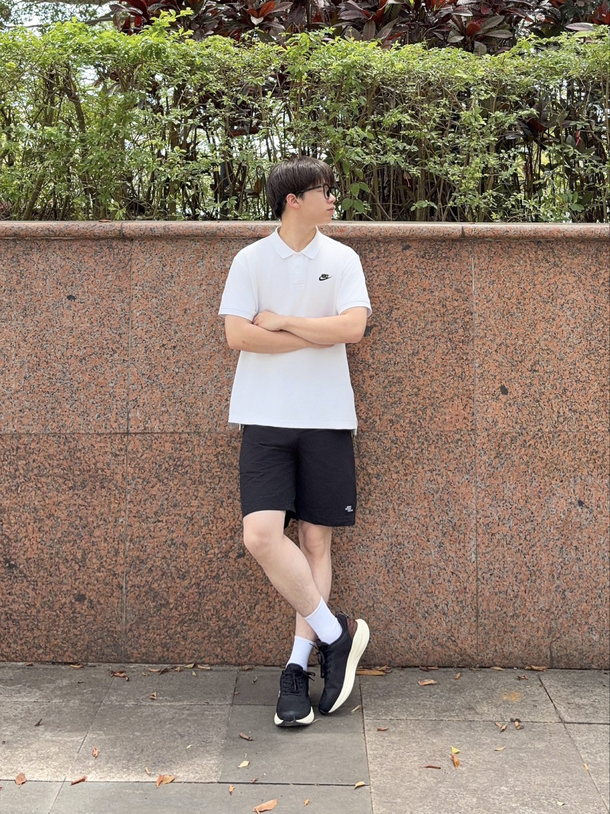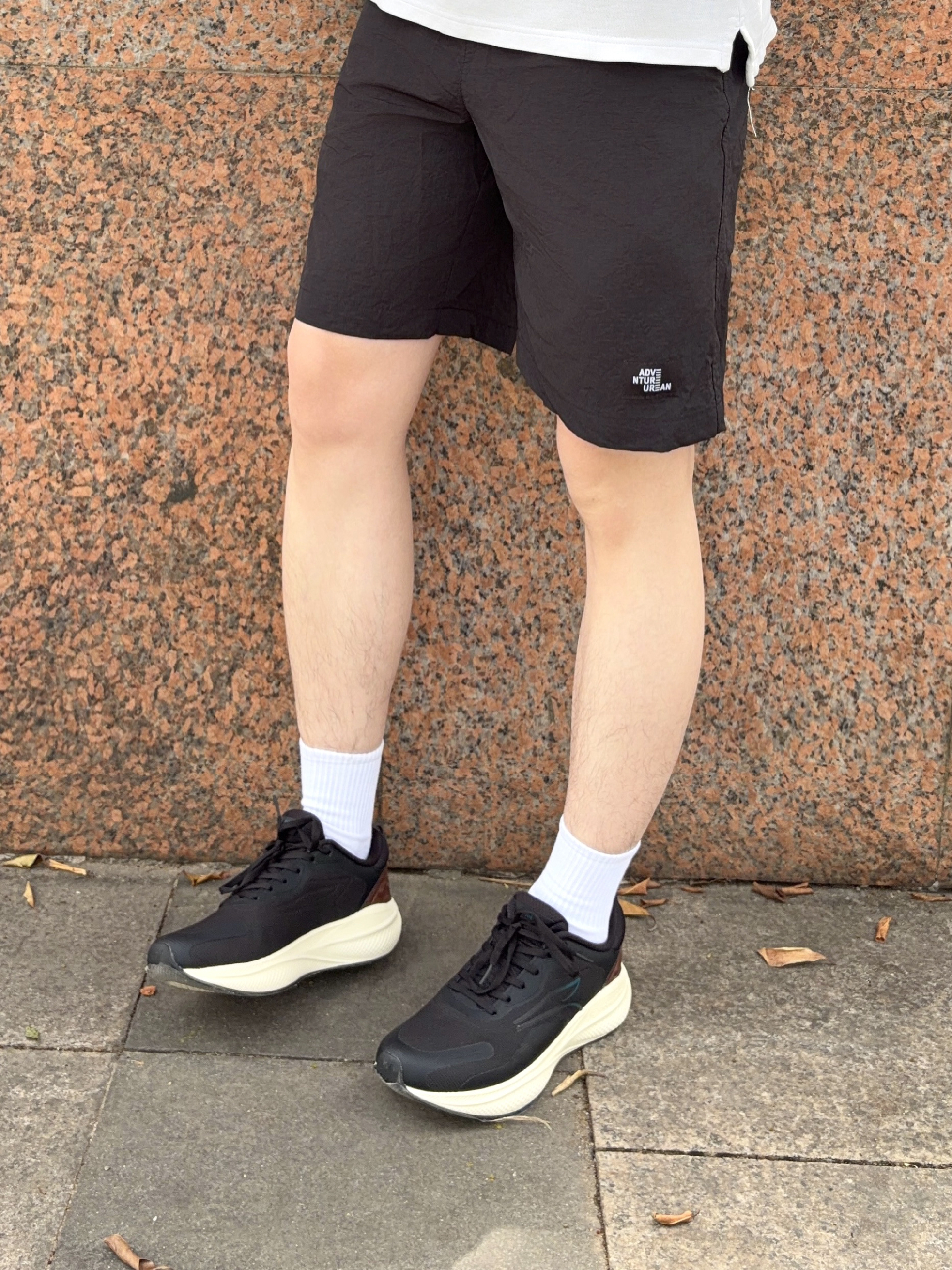 上脚了 361° 这双黑米棕休闲跑鞋xiet 经典黑白配色低调又耐看 网面透气 厚底踩感软弹舒适🌬️ 日常慢跑或通勤都很稳✅ 搭配白Polo衫👕与黑短裤 一身清爽利落 户外自在又随性🔥