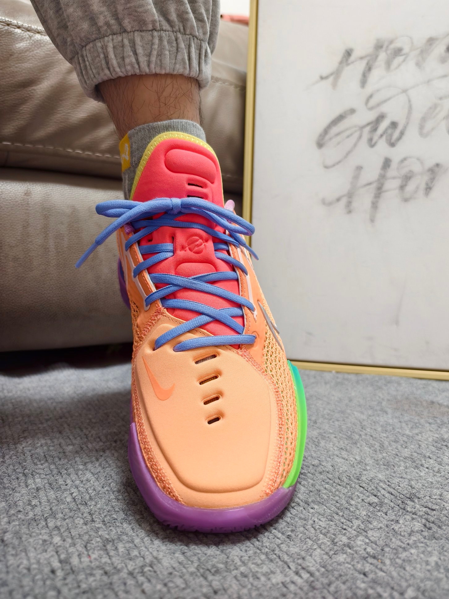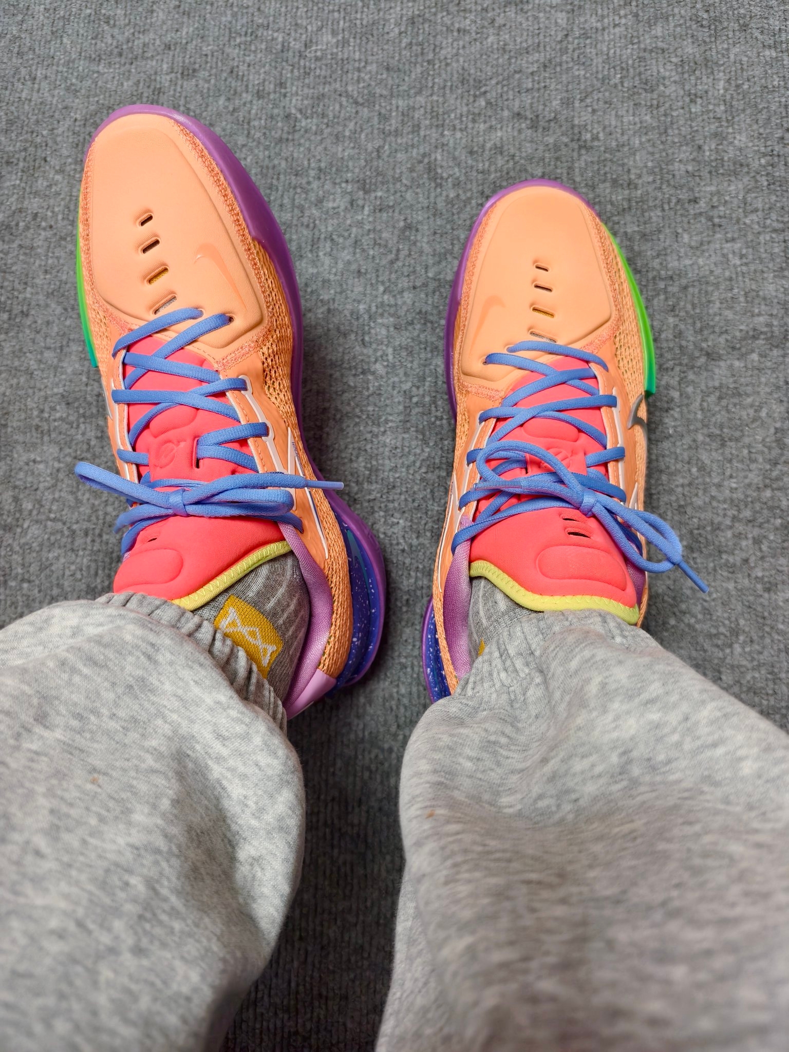 这次的GT Cut 1 哈珀配色确实是把五颜六色安排明白了,很跳脱的设计。 🤔所以内搭组合,咱们也可以来一次多色组合。 MIIOW 的这组应季多色短袜,正好派上用场。透气和亲肤贴合,给我的体验都不错。 🤓作为喜欢运动鞋兼职通勤的我来说,低帮篮球鞋+短筒袜的组合,确实很给劲。下班后,没事还能和同事组一下养生🏀。 @社区小管家 MIIOW