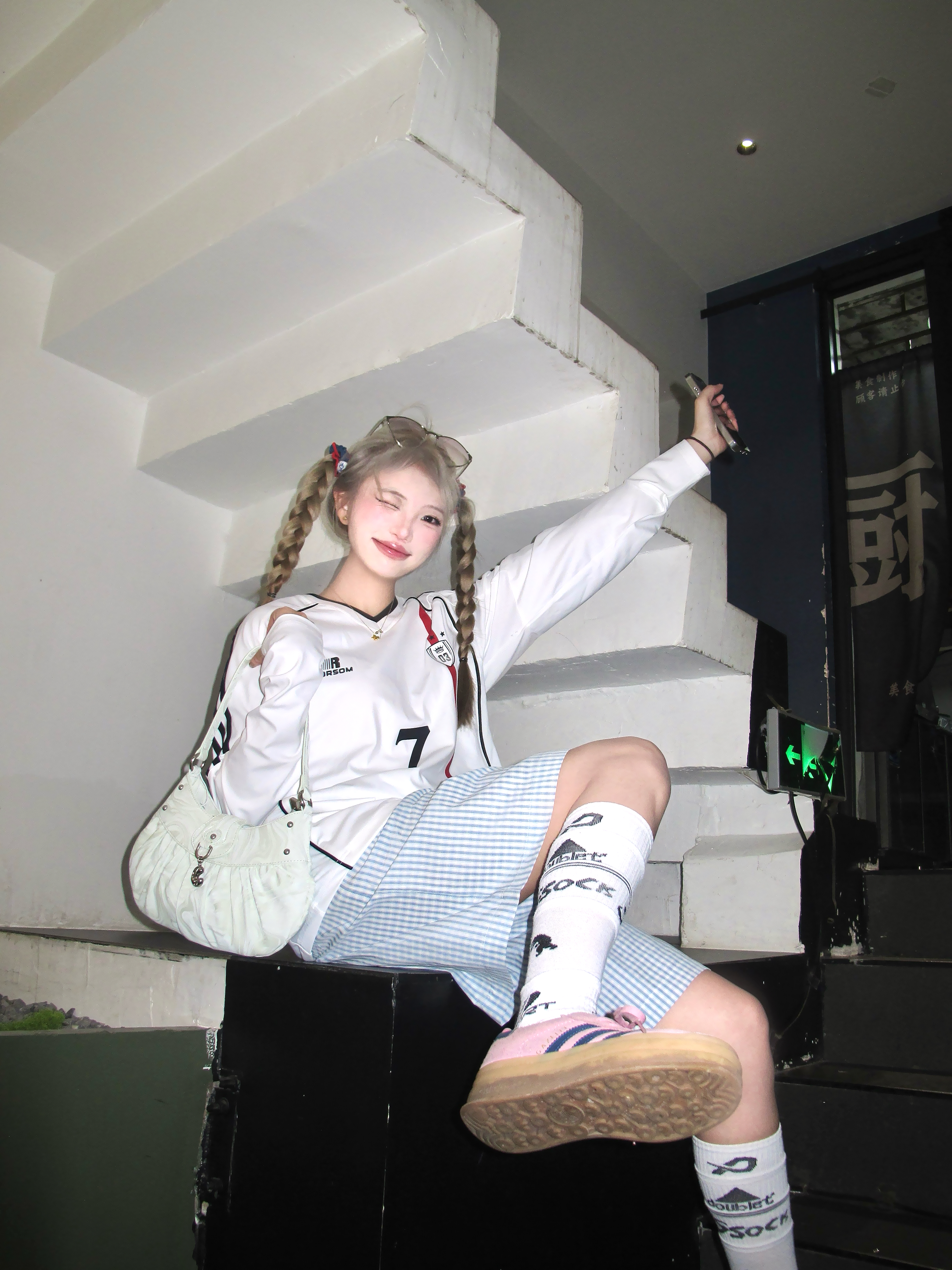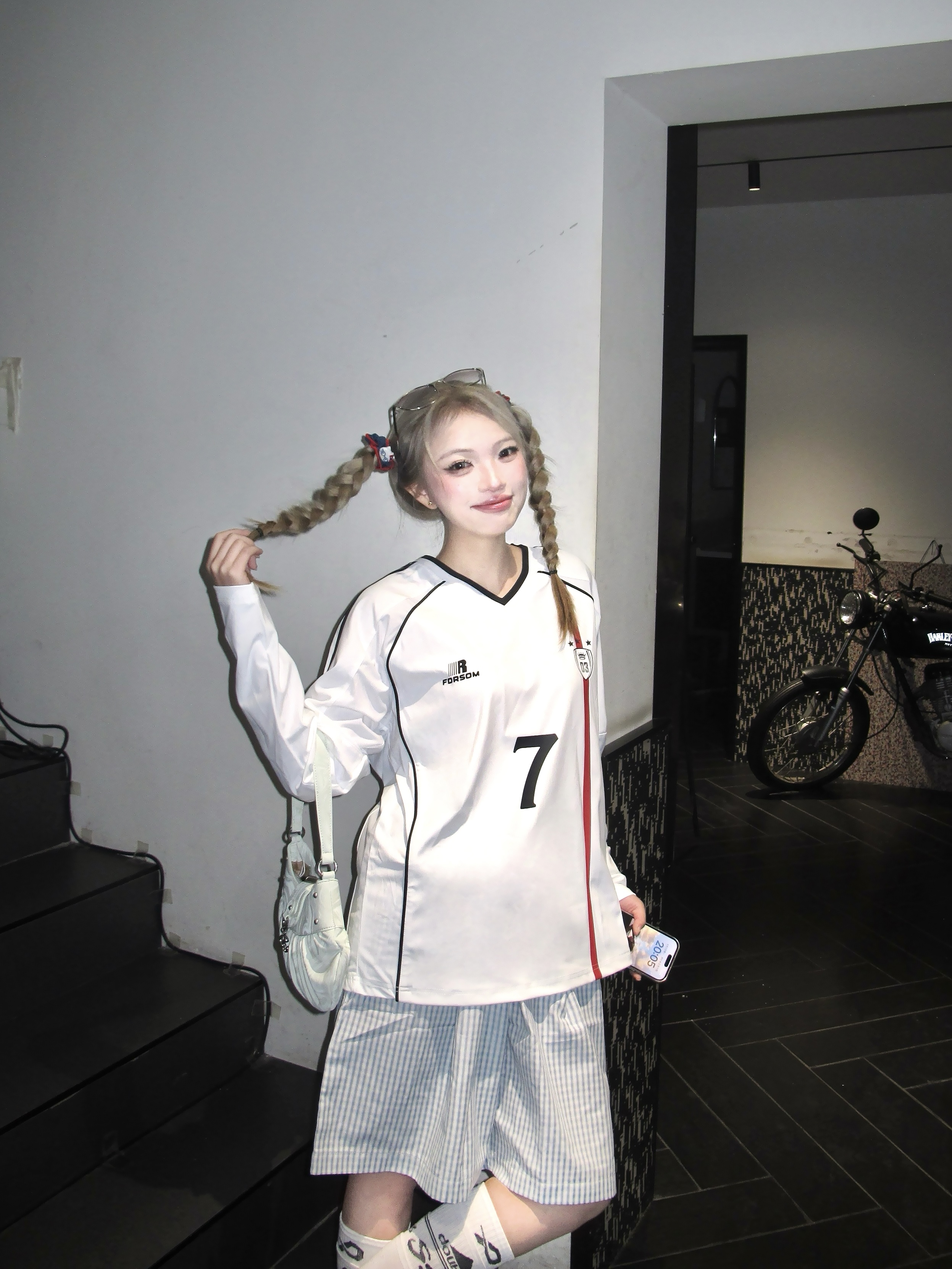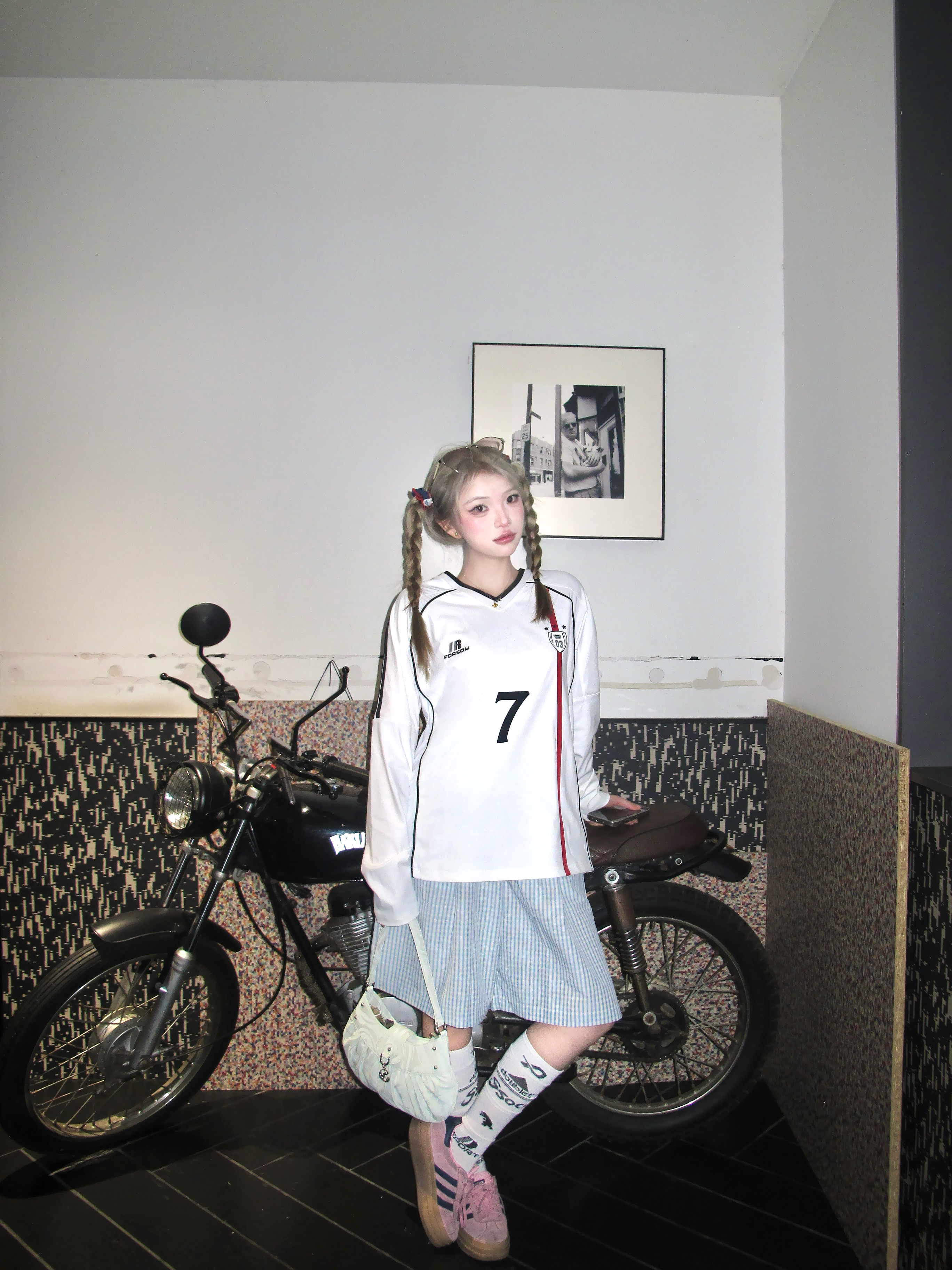 这套甜酷感要溢出屏幕了! 浅色系的一套cool girl 白色速干v领球衣搭配蓝色格子半身裤 一套好有帅气干净氛围✌️ 鞋子搭配粉色阿迪德训鞋👟 色彩更加饱满咯 两只麻花辫一扎 更有个性! 一套穿去踏春正正好!