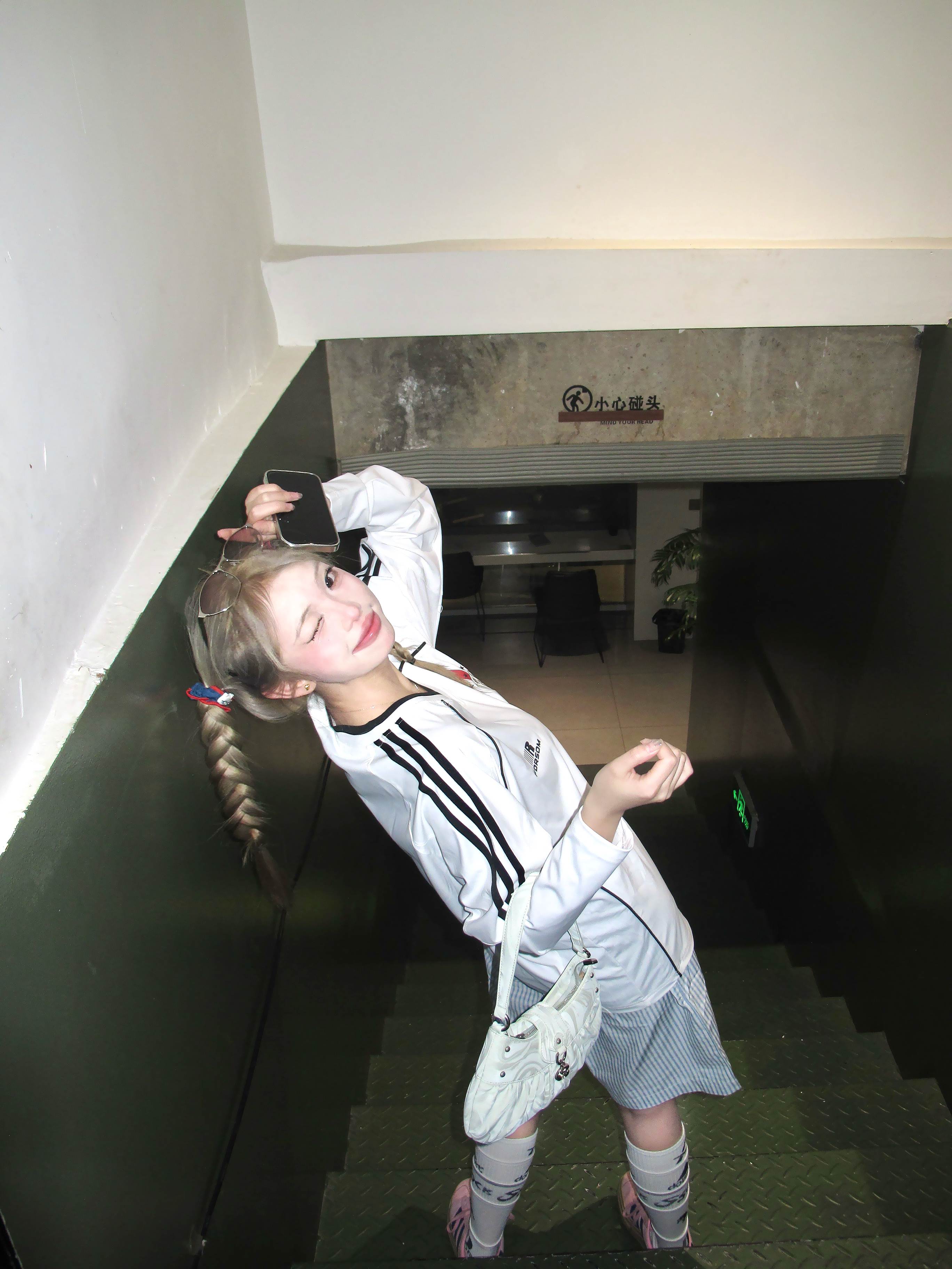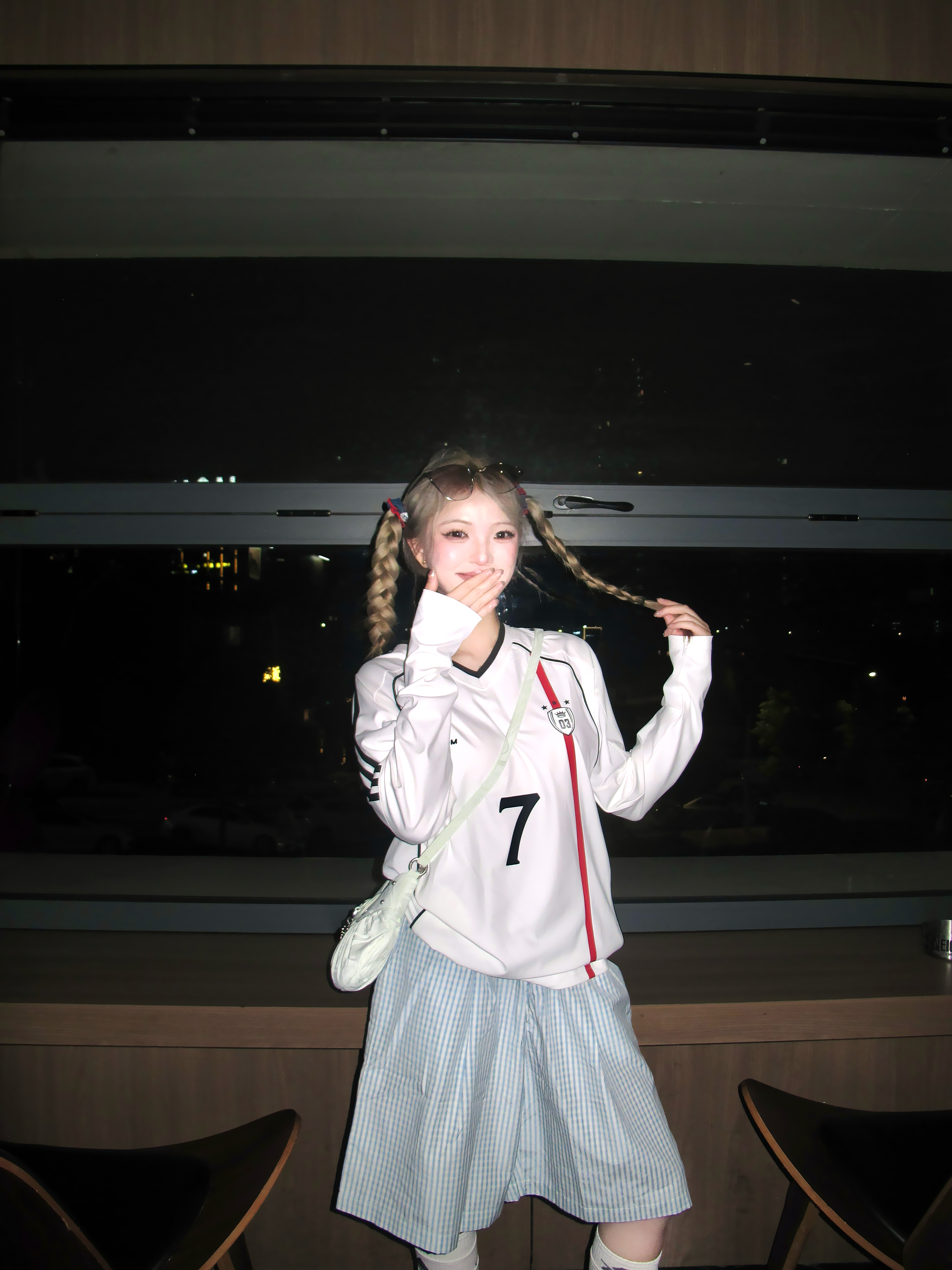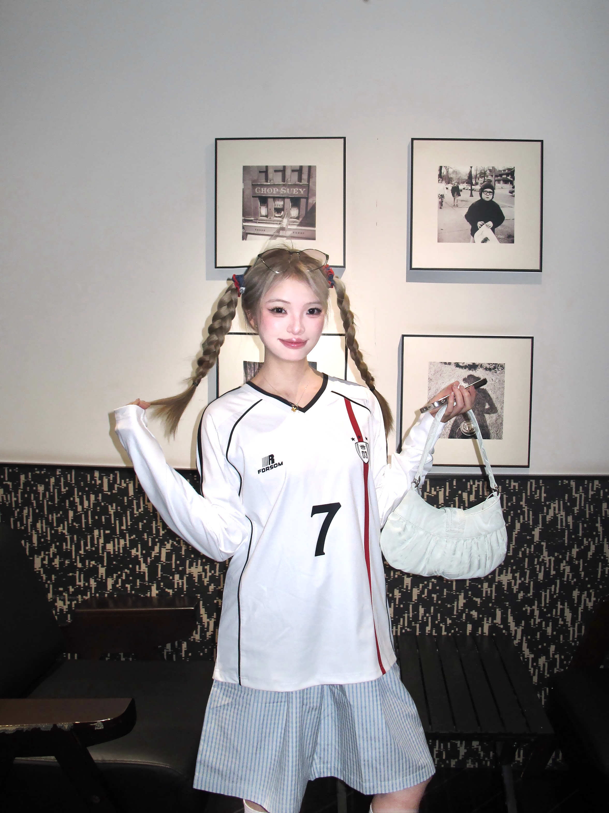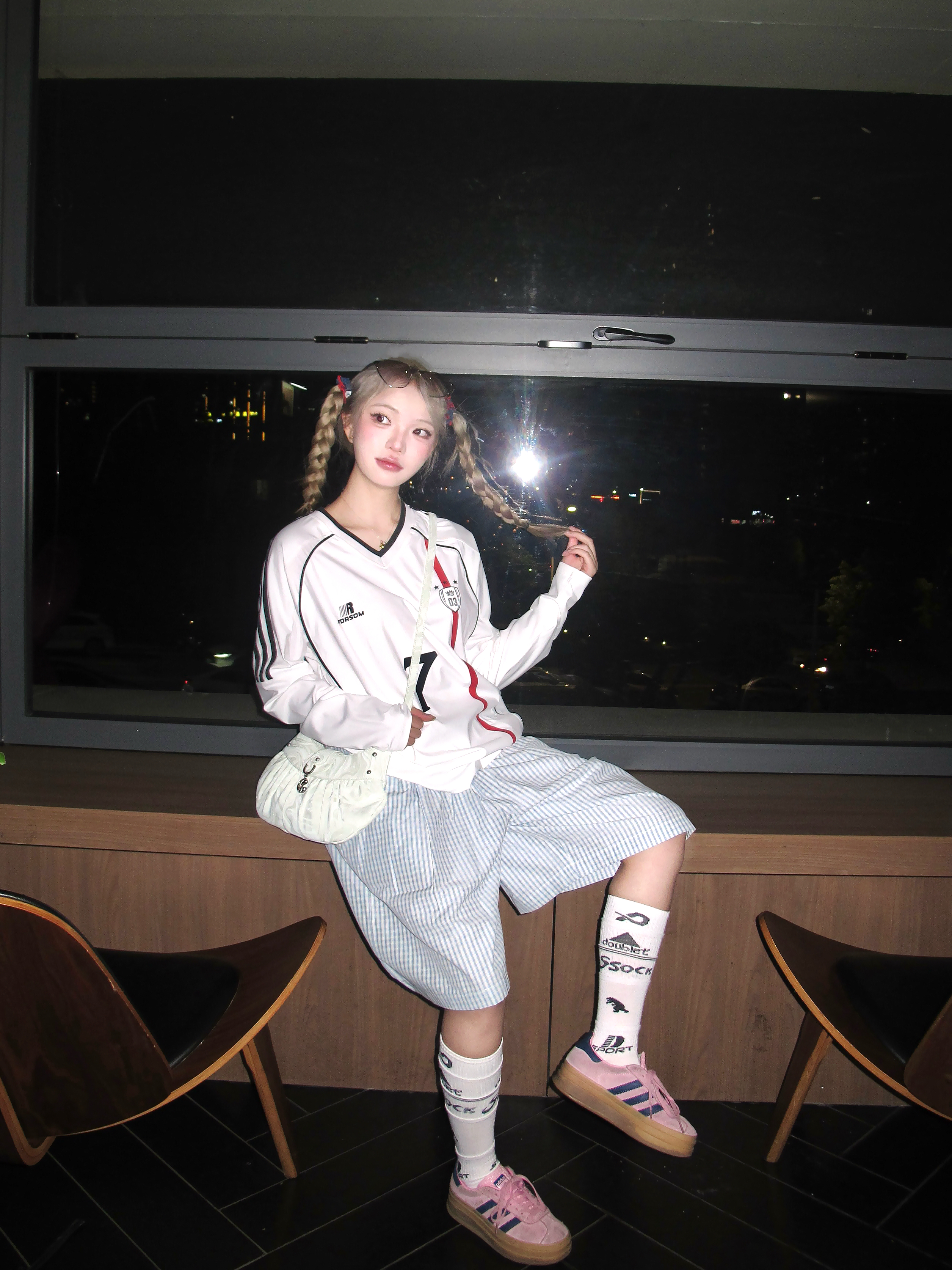 这套甜酷感要溢出屏幕了! 浅色系的一套cool girl 白色速干v领球衣搭配蓝色格子半身裤 一套好有帅气干净氛围✌️ 鞋子搭配粉色阿迪德训鞋👟 色彩更加饱满咯 两只麻花辫一扎 更有个性! 一套穿去踏春正正好!