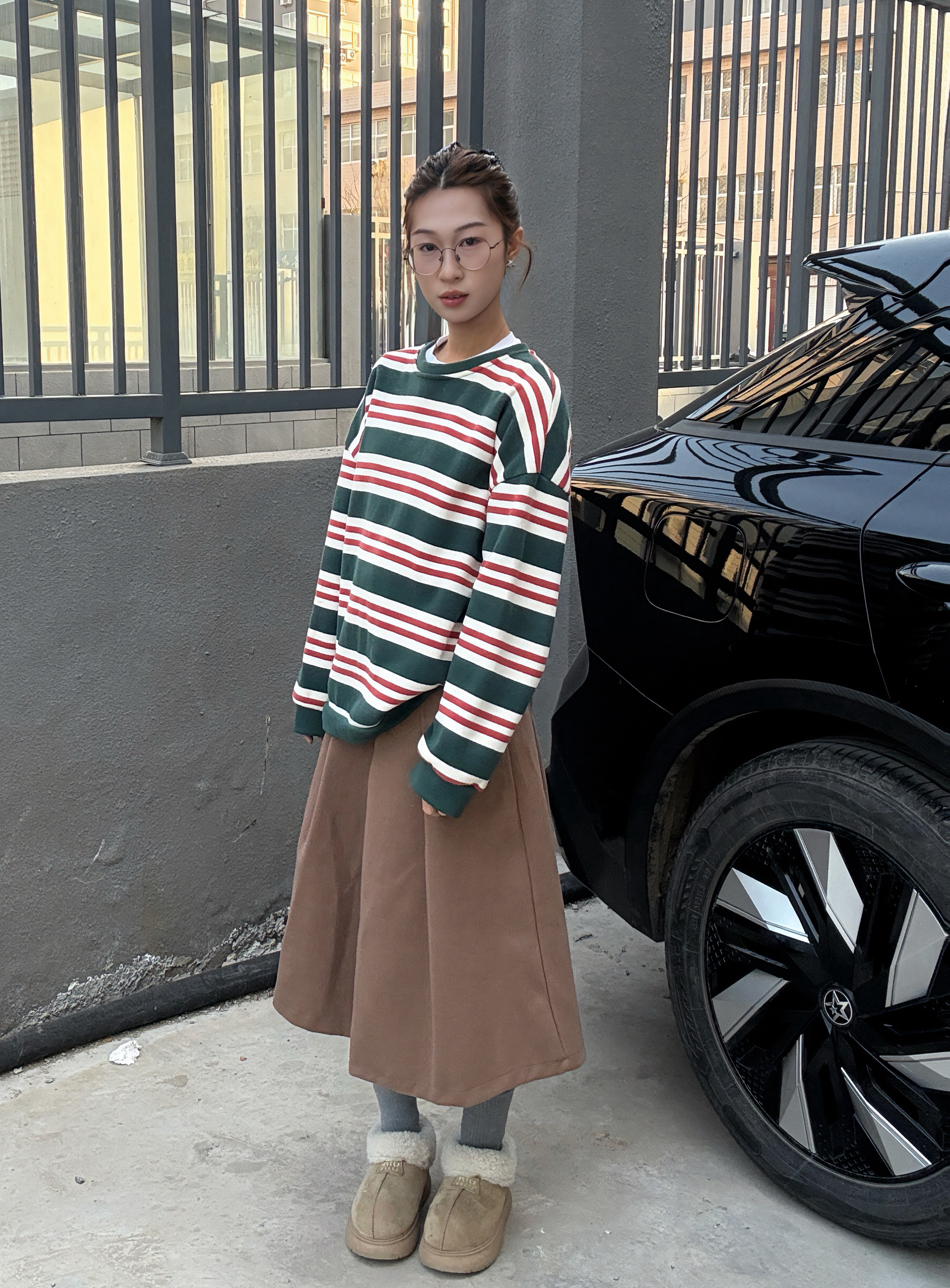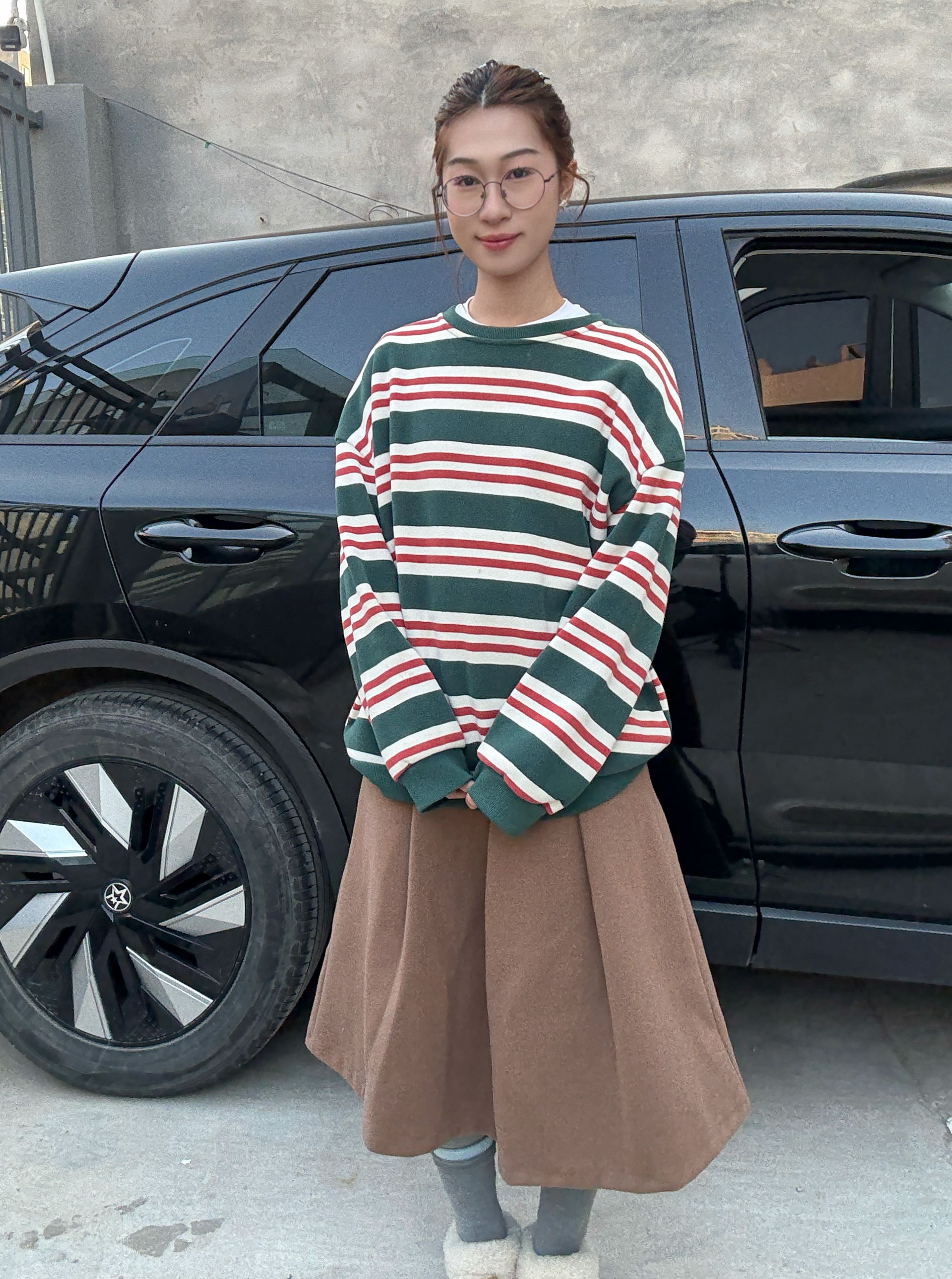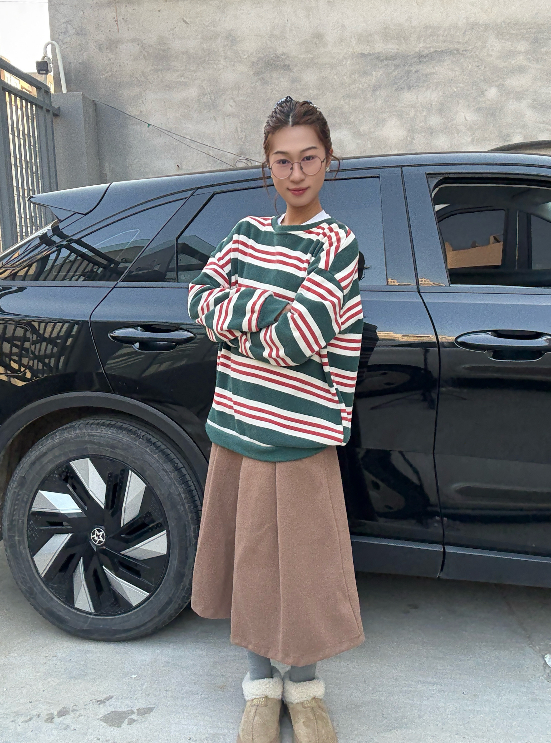 新入的撞色条纹毛衣也太有复古感了🥰,红绿条纹的配色很有春日的活力,宽松的版型对身材的包容度不错,贴身穿的柔软度也可以,不会有扎肤的情况。 搭配卡其色半身裙,再踩一双毛毛鞋,休闲中带着温柔的调调,在车旁随手拍都很出片📸。不管是日常出门逛街还是约会穿都合适,单穿或者叠搭外套都能穿出不同的感觉,春天的复古氛围感直接拿捏。 而且毛衣的面料洗了几次也没起球,细节做工也在线,条纹的印花也没有掉色的情况,喜...