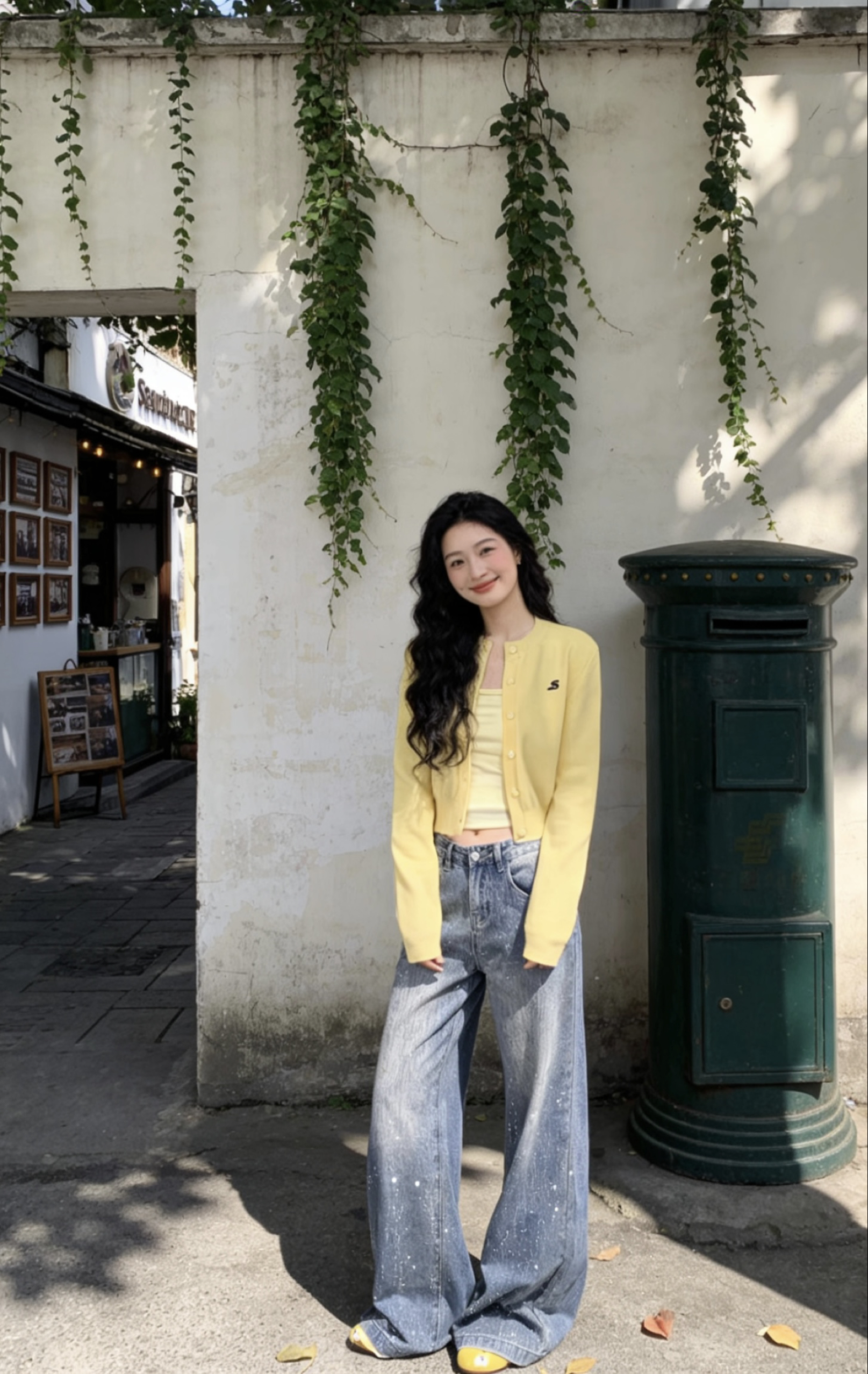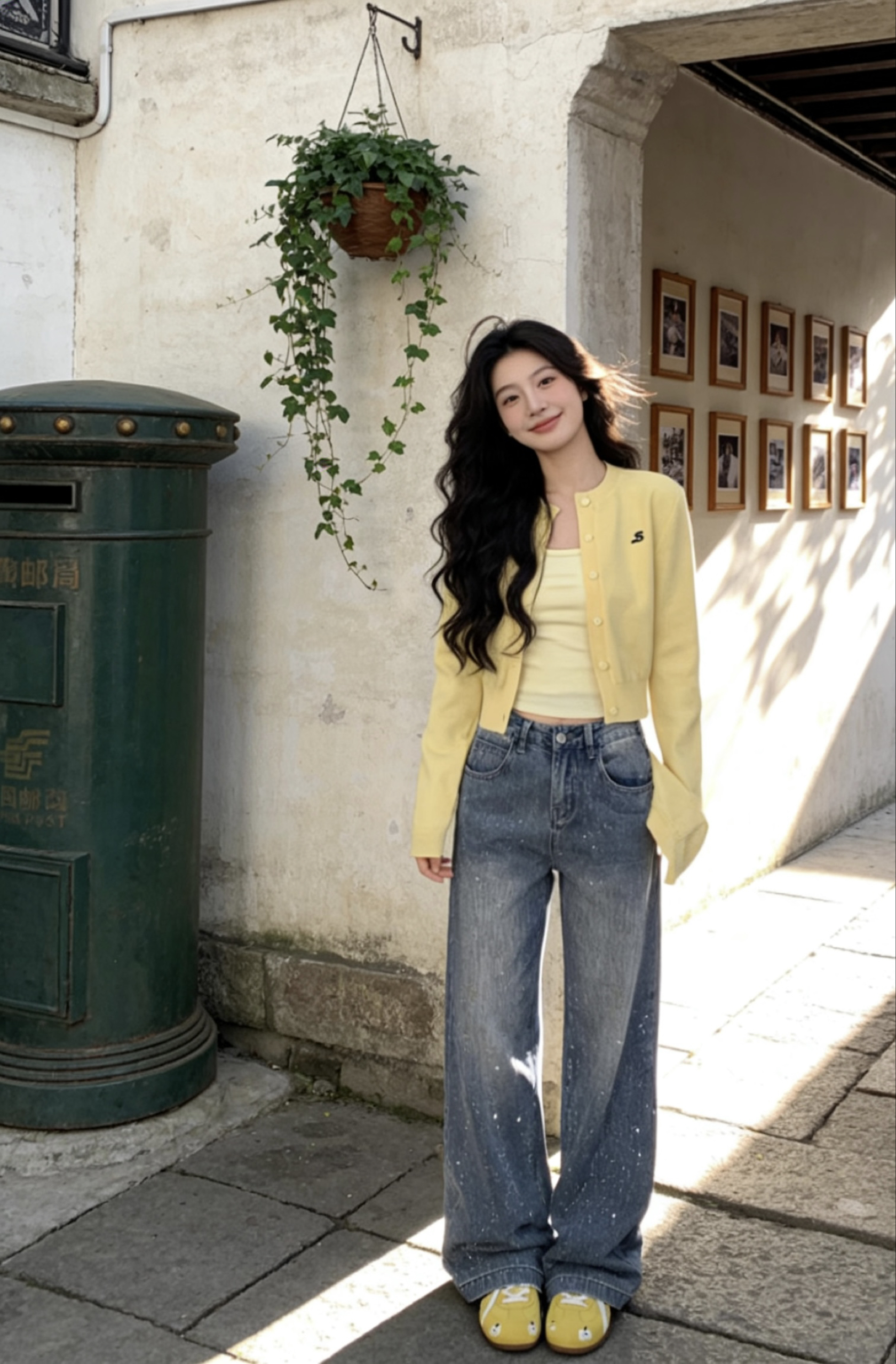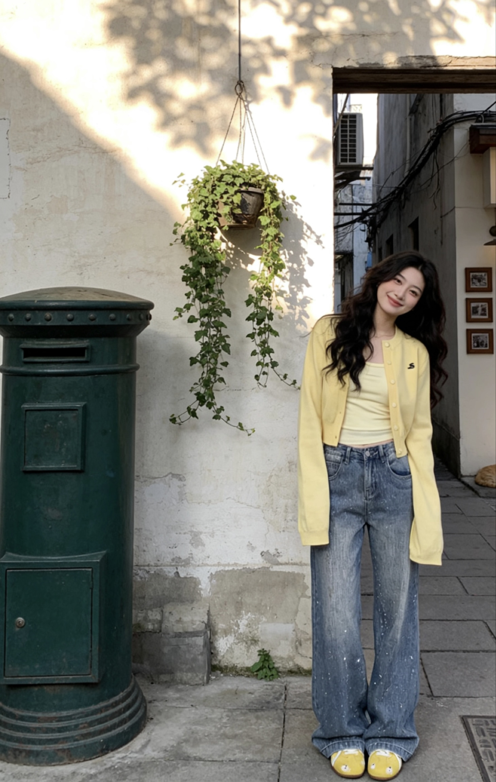 终于等到天气回暖啦!迫不及待穿上这套奶fufu的黄开衫出门逛老巷~ • 👕上衣:奶黄色短款针织开衫,软乎乎的面料超亲肤,单穿叠穿都好看,短款版型还能悄悄拉高腰线,小个子也能轻松驾驭! • 👖下装:渐变泼墨牛仔裤,宽松直筒版型藏肉又显瘦,裤身的细闪设计在阳光下blingbling的,细节感拉满! • 👟鞋子:同色系黄苹果德训鞋,软底舒服到想天天穿,和开衫的颜色呼应得刚刚好,整套look清爽又元...