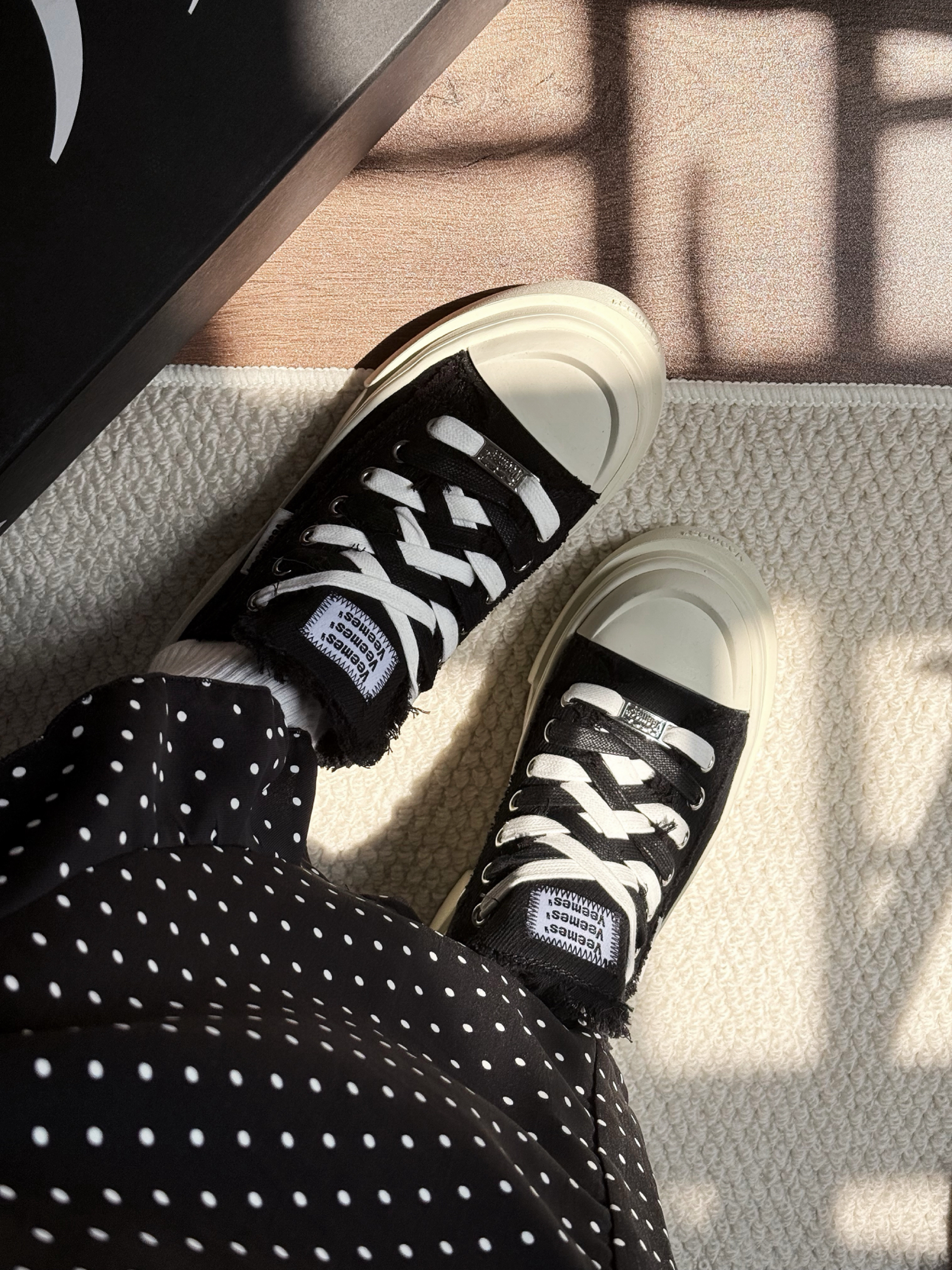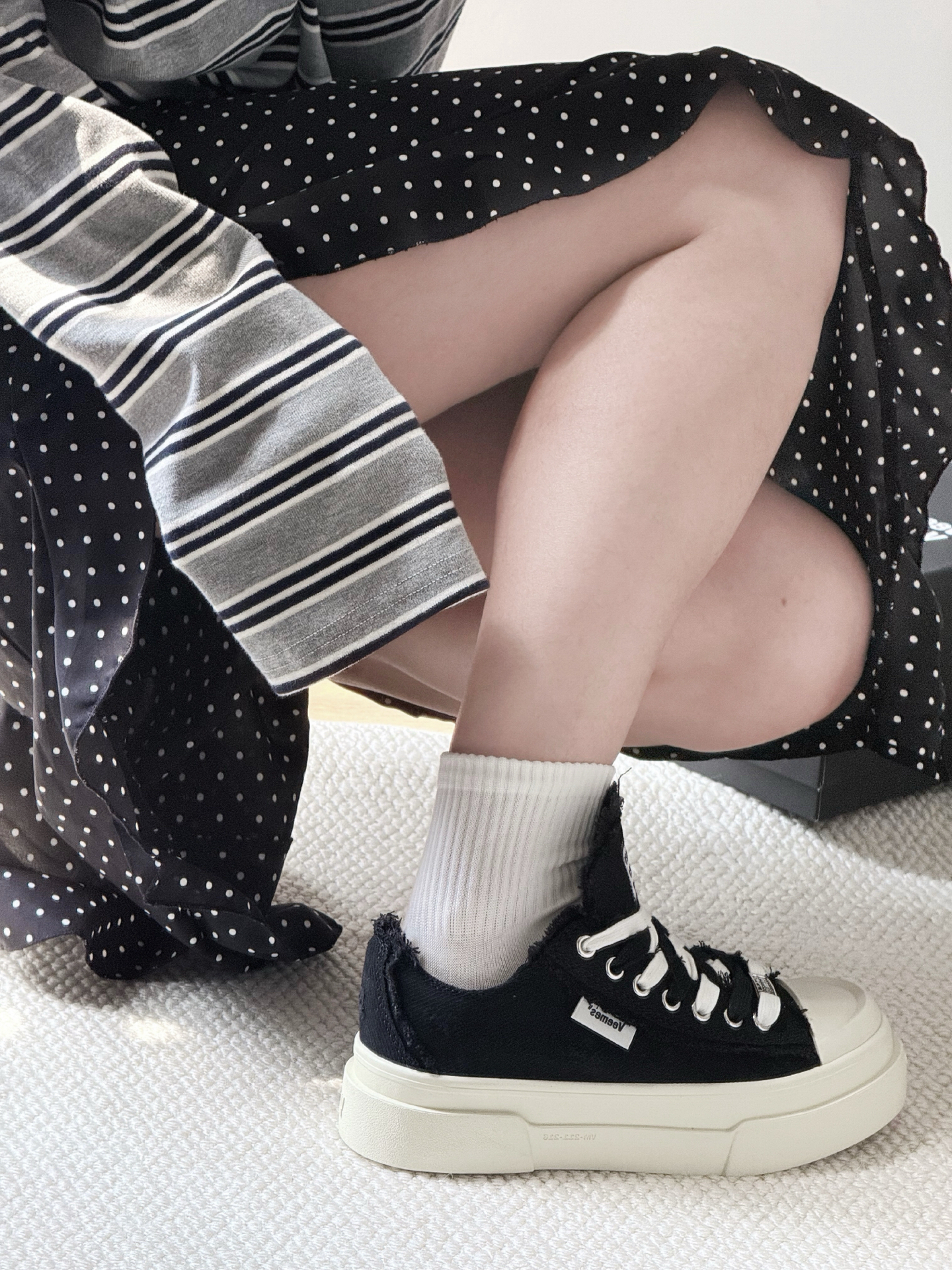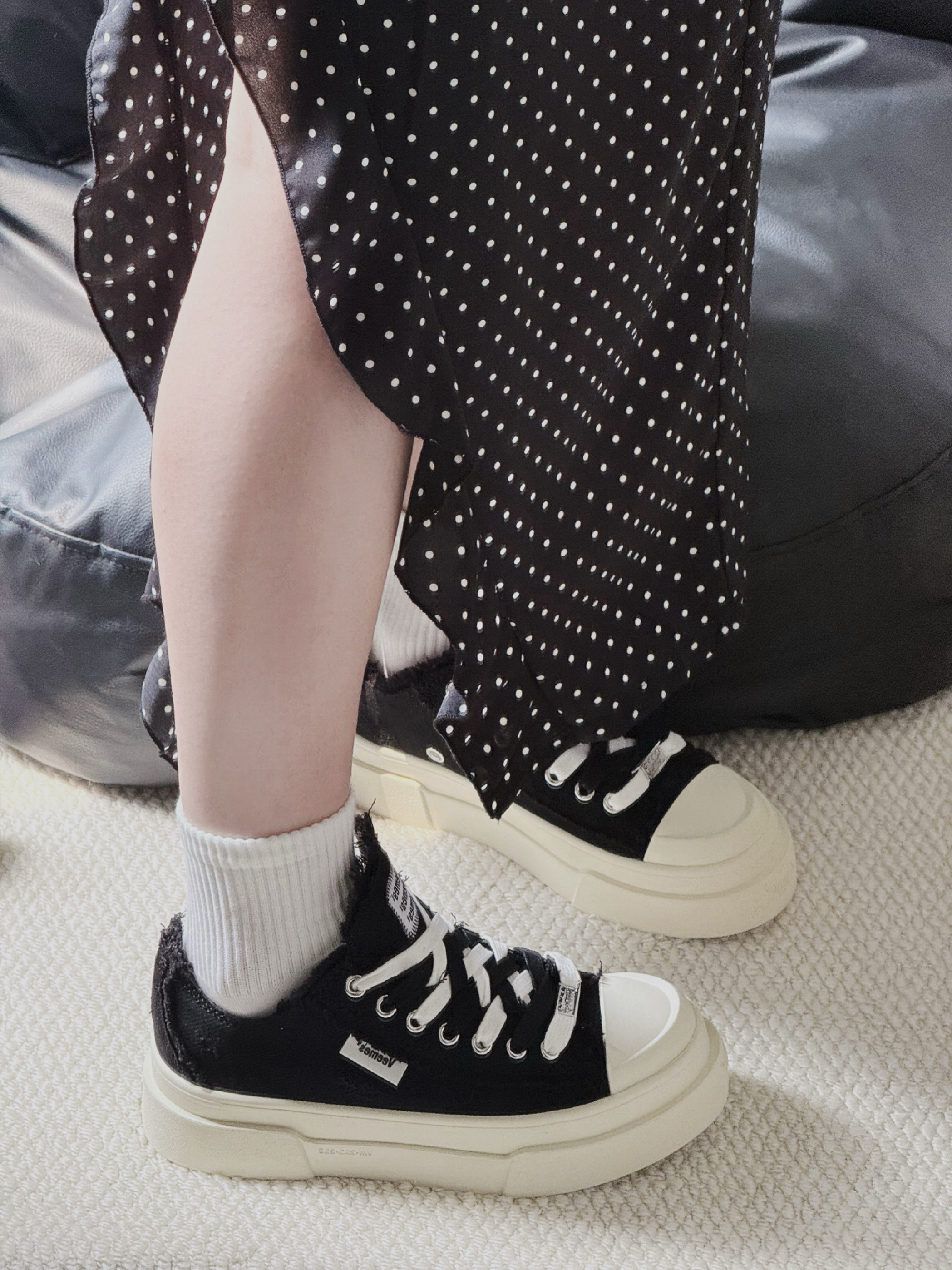 ▪️ 经典黑魂:哑光鞋面+纯白锯齿厚底,复古做旧质感拉满,自带增高显瘦buff; ▪️ 细节控狂喜:白色鞋带穿插点缀,鞋舌低调暗纹logo,搭配金属戒指与黄绿跳色美甲,不经意间流露精致态度; ▪️ 万能CP王:黑白条纹上衣×波点黑裙×白色中筒袜,轻松驾驭文艺慵懒风or甜酷街头范儿!
