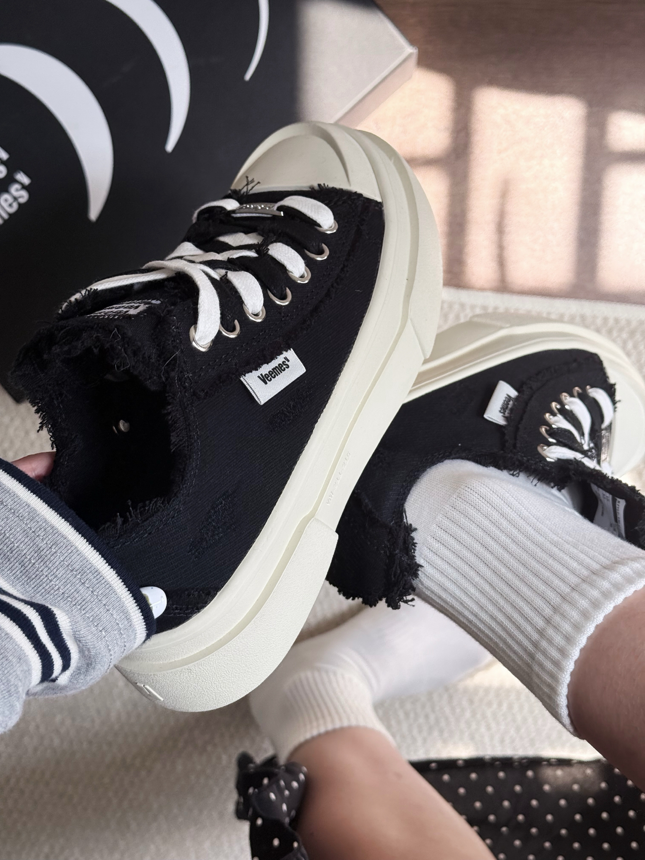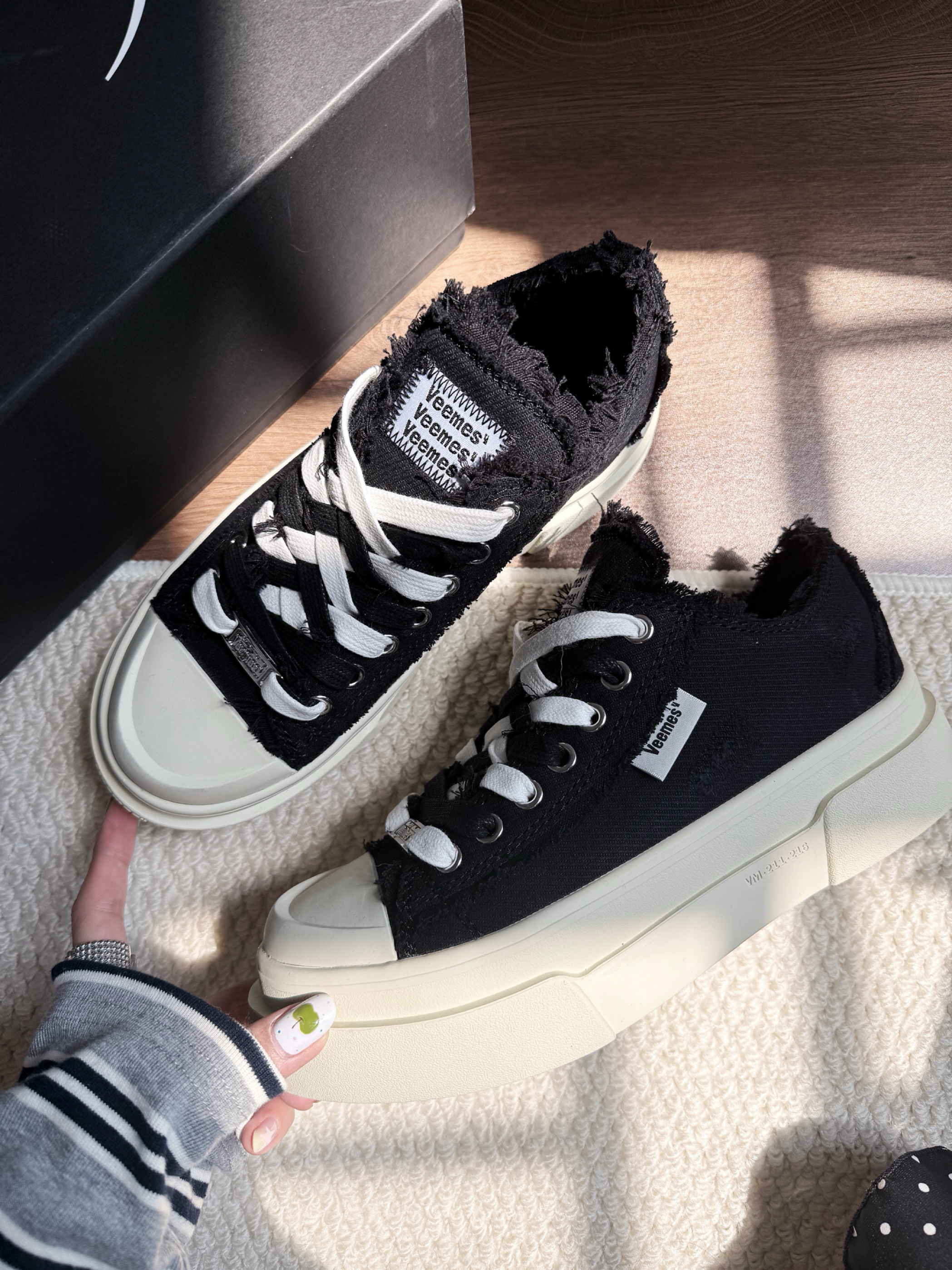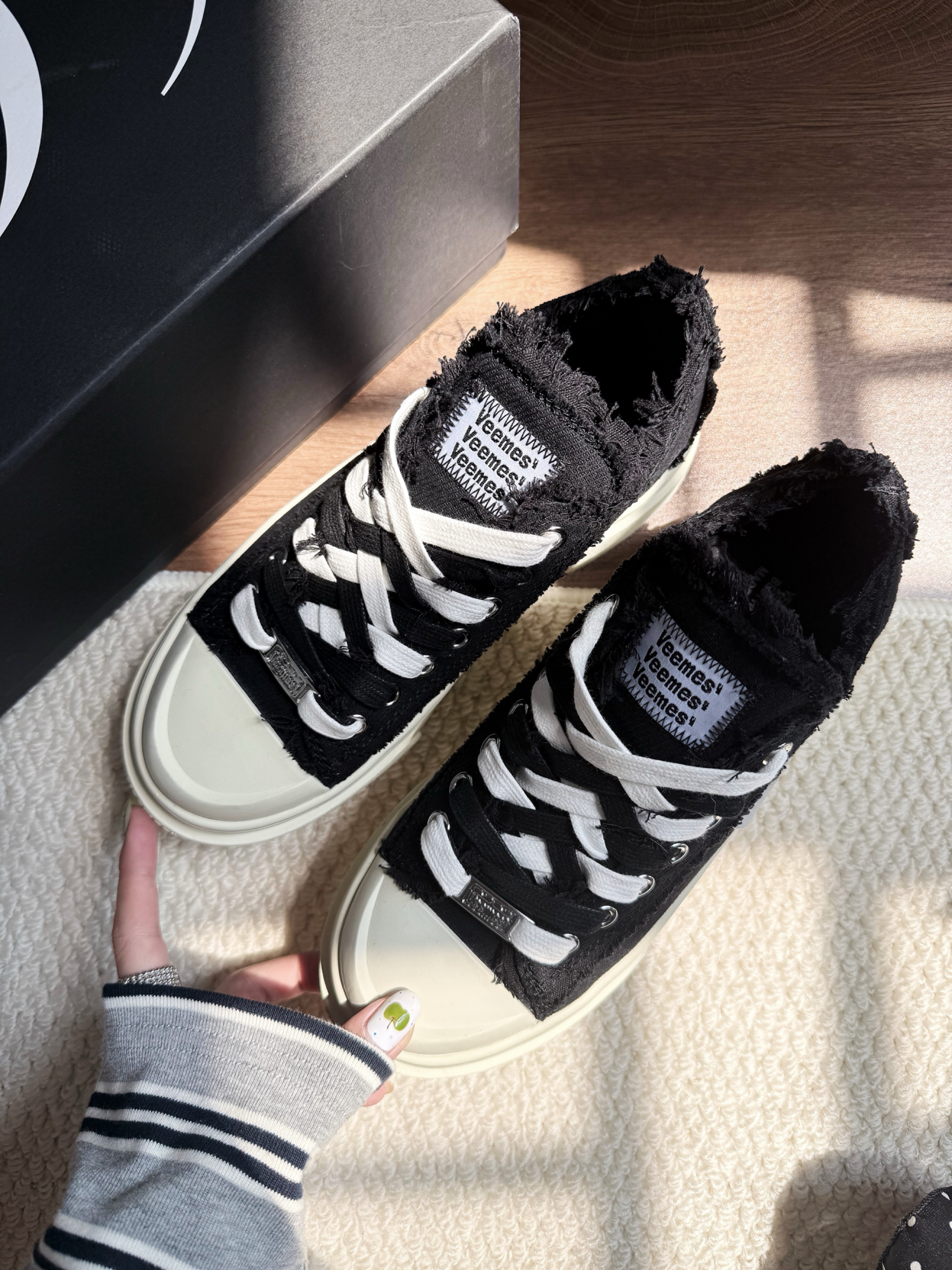 ▪️ 经典黑魂:哑光鞋面+纯白锯齿厚底,复古做旧质感拉满,自带增高显瘦buff; ▪️ 细节控狂喜:白色鞋带穿插点缀,鞋舌低调暗纹logo,搭配金属戒指与黄绿跳色美甲,不经意间流露精致态度; ▪️ 万能CP王:黑白条纹上衣×波点黑裙×白色中筒袜,轻松驾驭文艺慵懒风or甜酷街头范儿!