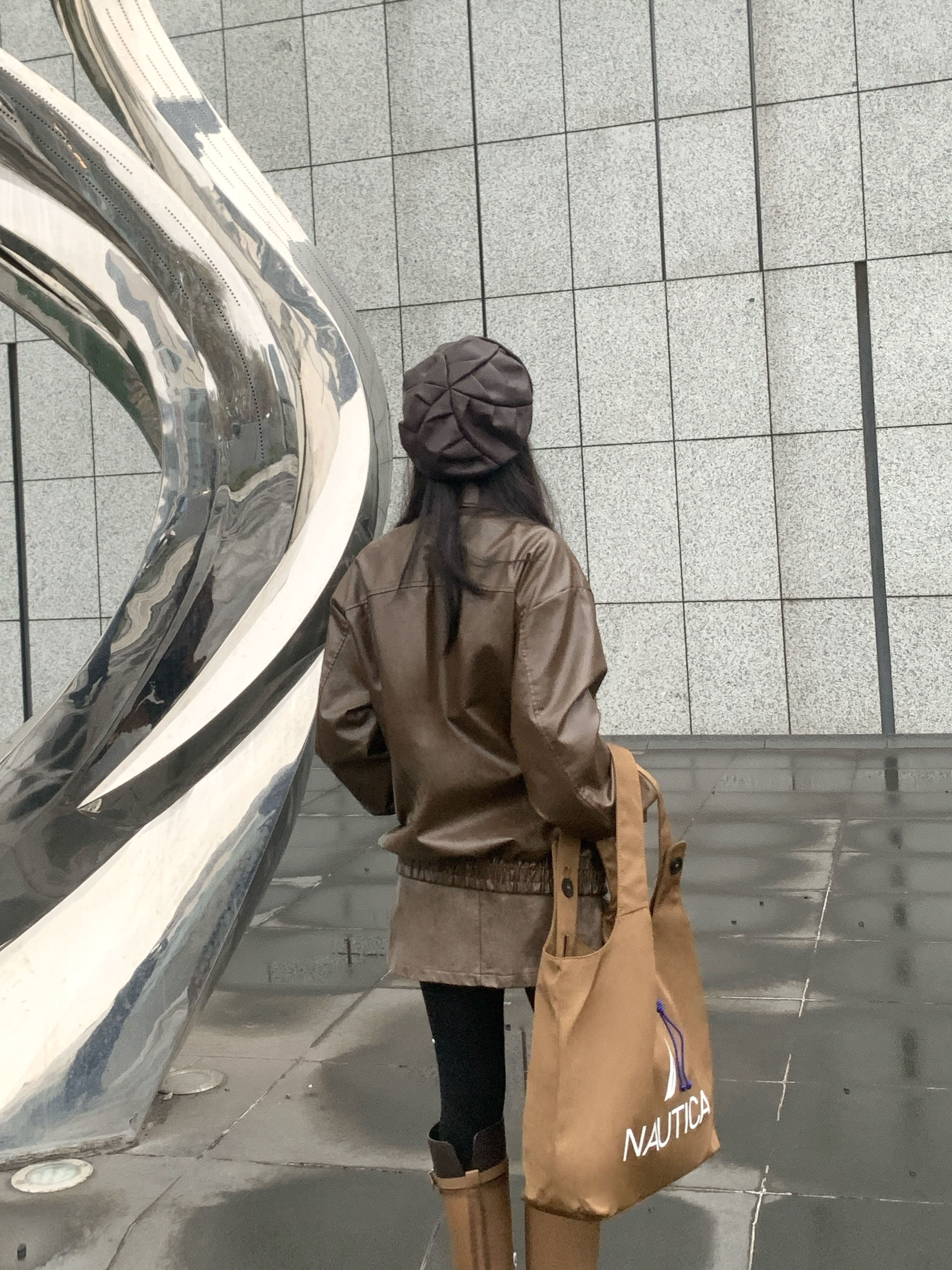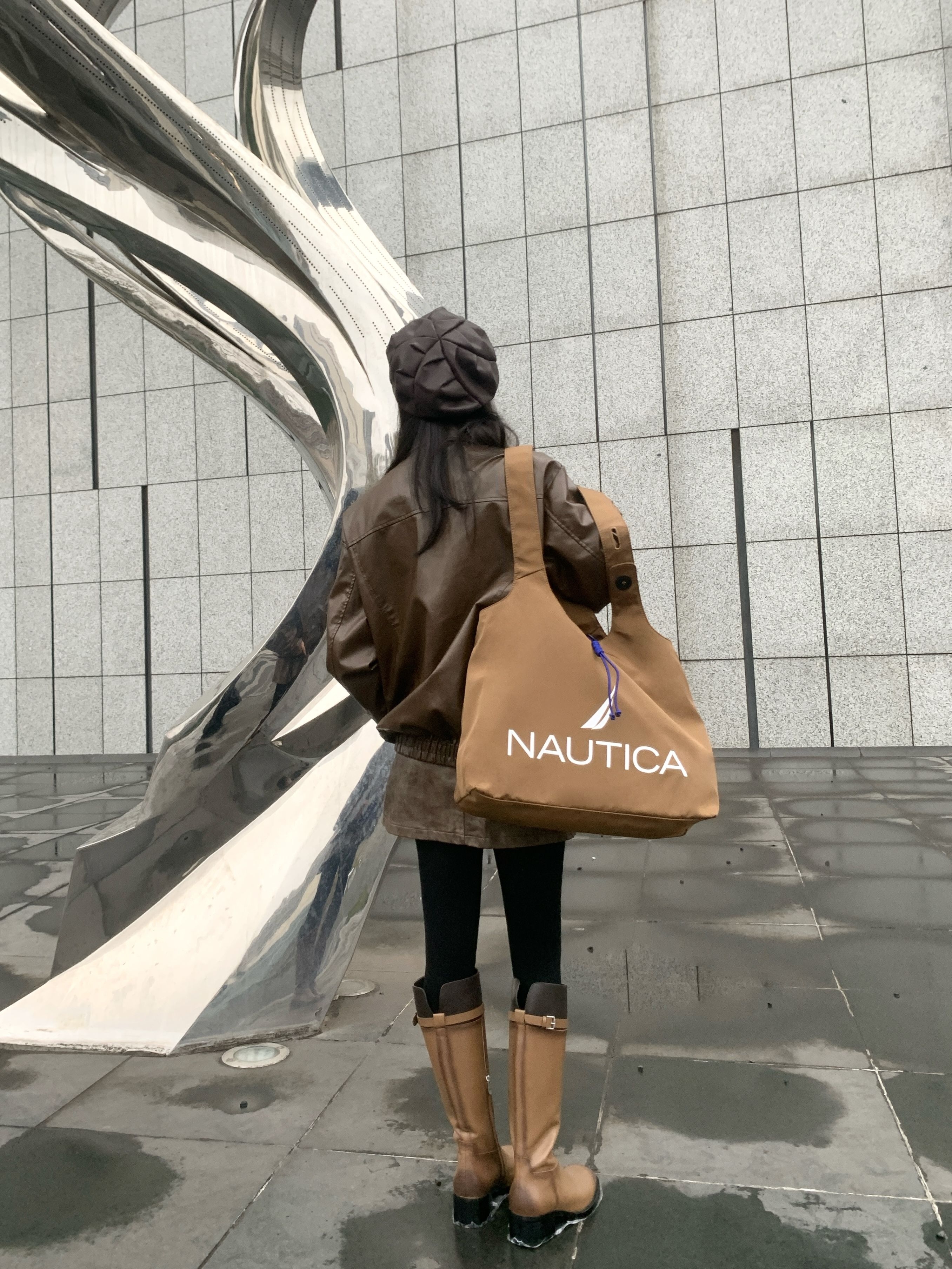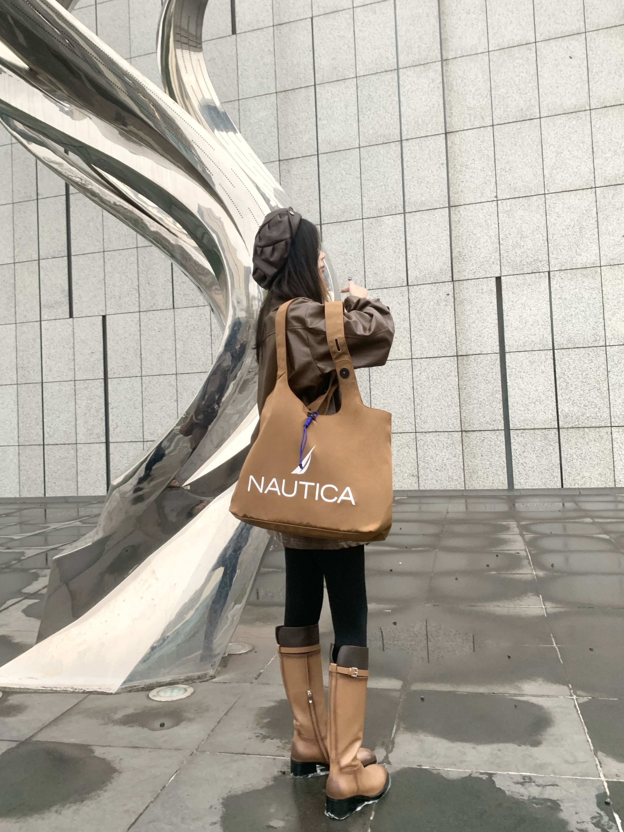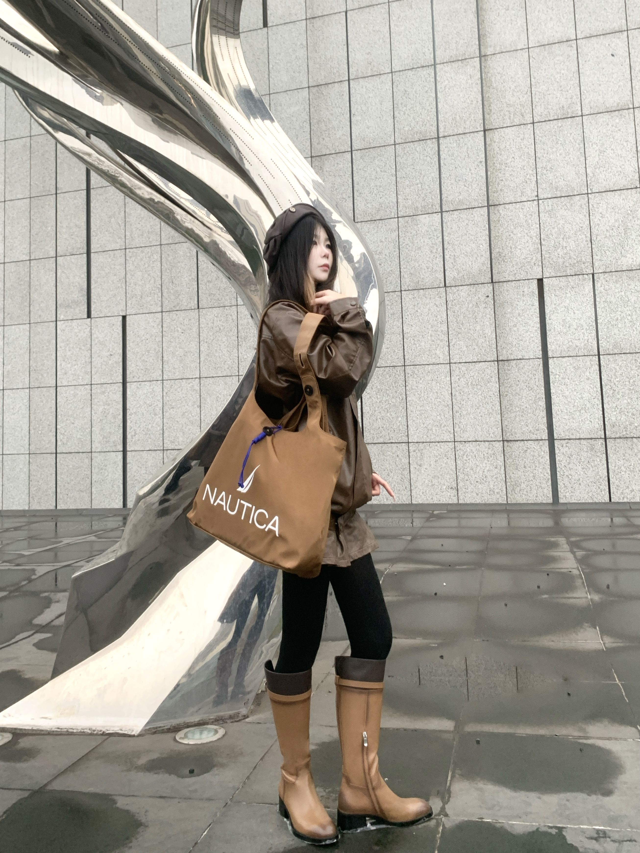 今日OOTD✌️✌️ 是比较美拉德风的一身穿搭,以棕色🤎为主 圆形帽子+宽松外套+短裙+骑士靴 再背上棕色尼龙托特包 一身穿搭美式又潮流☑️☑️ 包包设计简约又好看,上面有白色🤍印花,还有纽扣可以调节背带的长度,日常出行背挺方便的 而且容量也挺大的,我出去逛街,往里面放充电宝、手机、雨伞等都🉑以~
