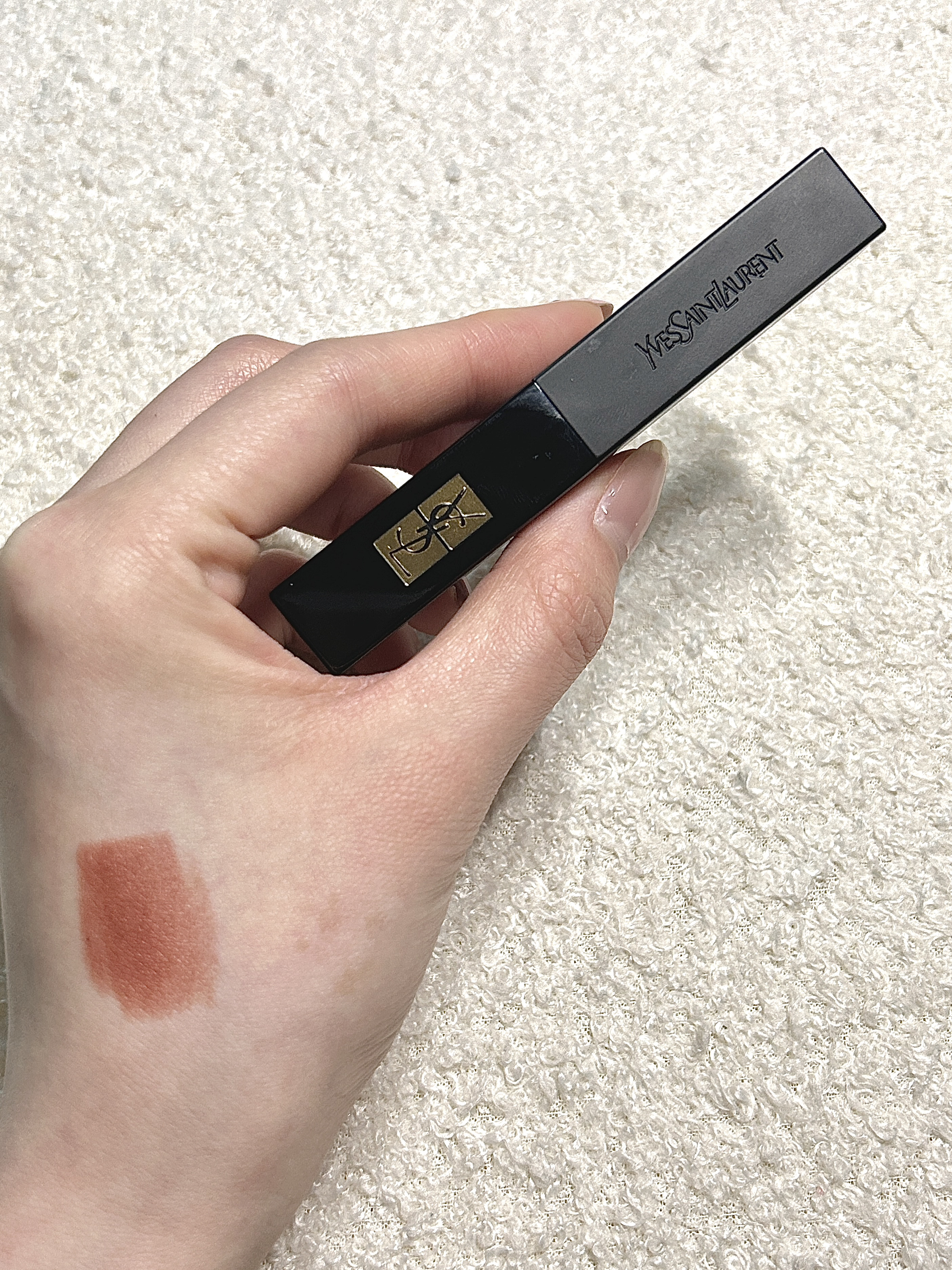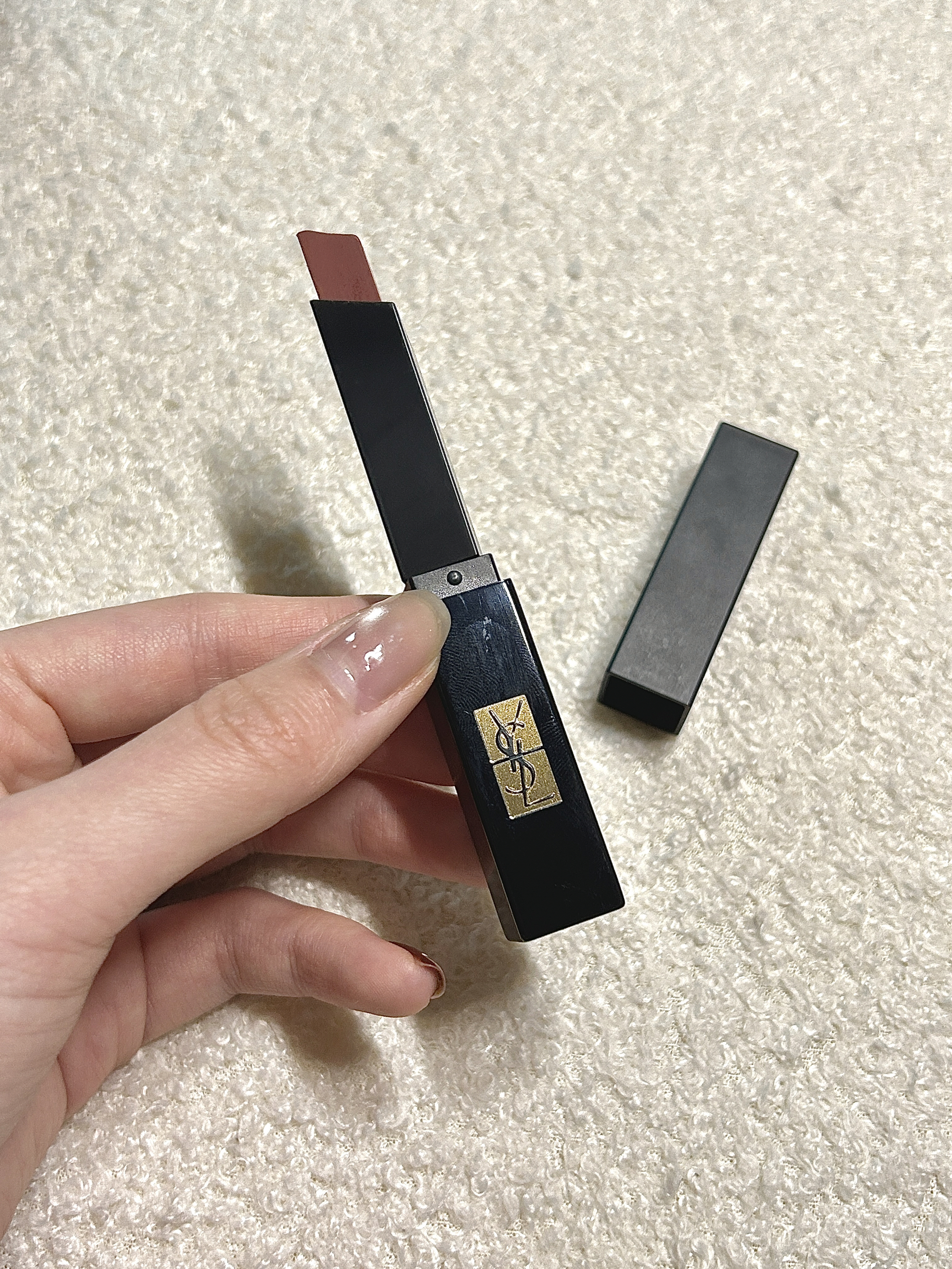 人生第一支大牌口红之一必须有YSL小黑条314一席之地 磨砂黑管拿在手里,精致的刻字,外壳就非常大气 这支偏冷调红棕,是我春日通勤的作弊神器,薄涂提气色,厚涂气场全开 虽然是哑光质地但丝滑不挑唇部状态,随手一涂就很显贵。