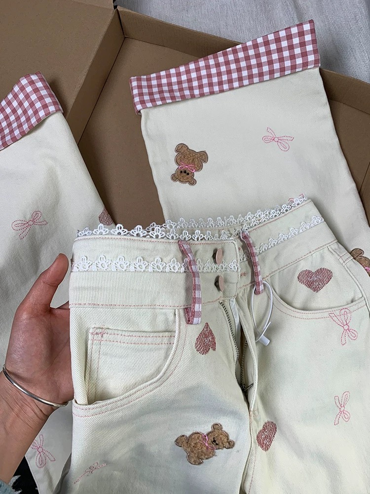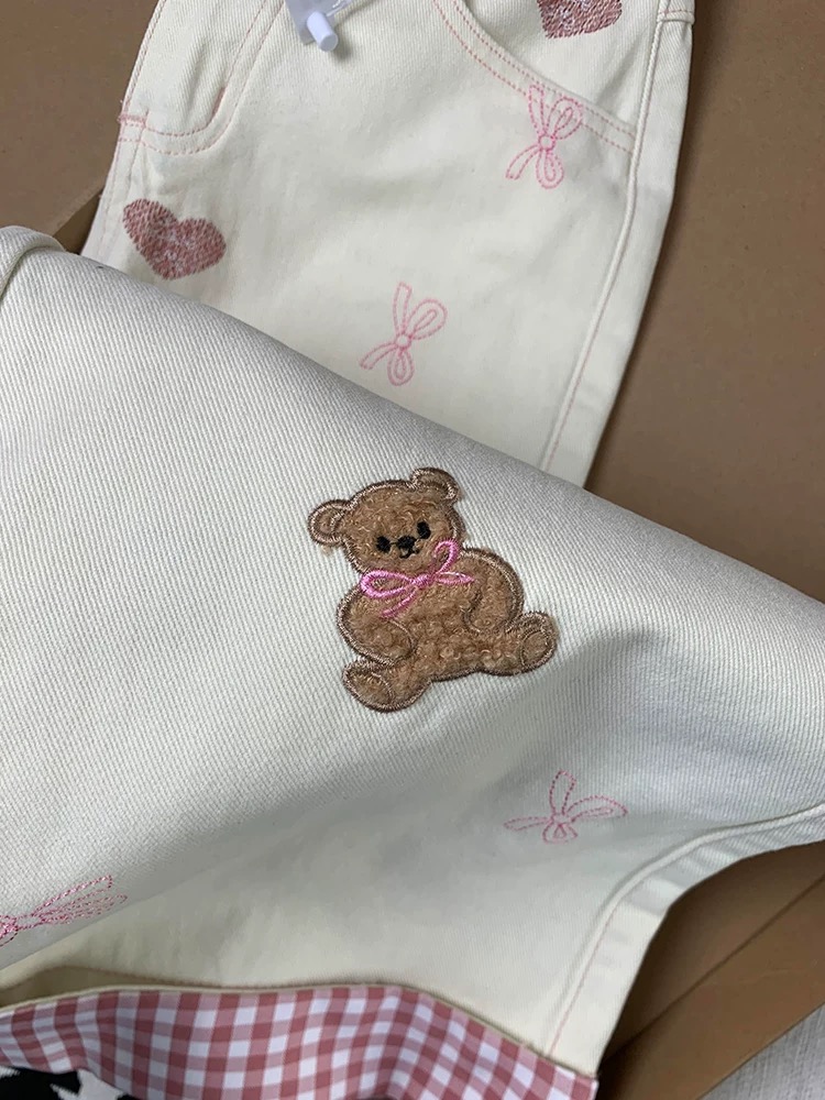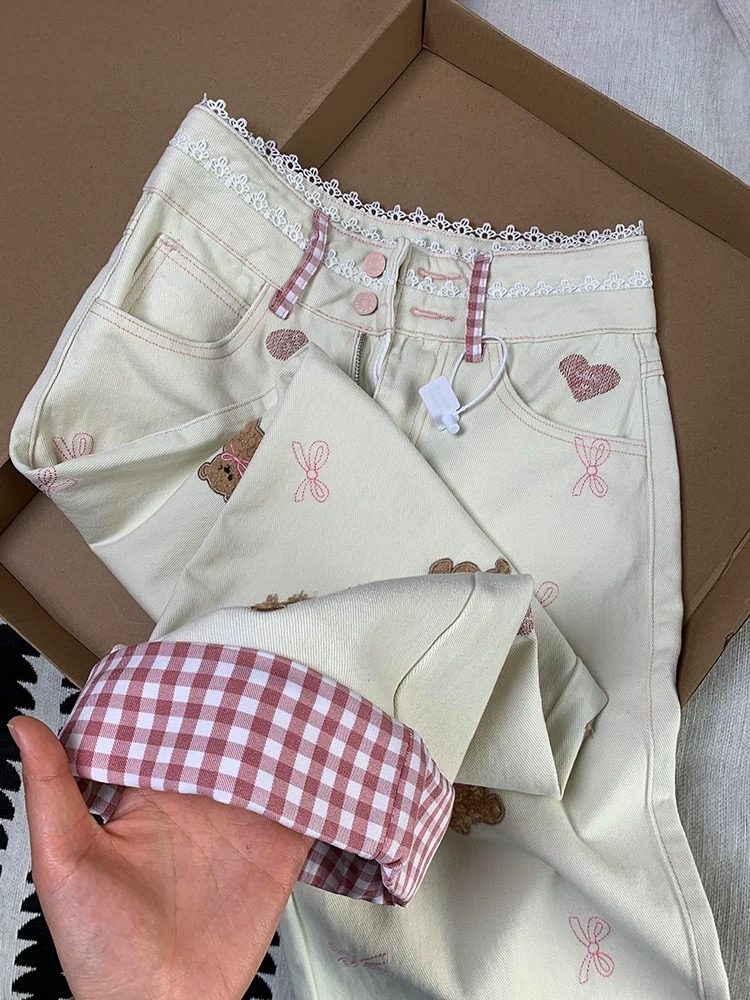 奶fufu的米白色裤身,像裹了一层温柔的奶油~ 裤脚翻边露出粉白格纹,甜妹感直接拉满✨ 爱心刺绣和小熊图案藏着小心机,腰头蕾丝花边+抽绳设计,软萌又显瘦,搭配卫衣或T恤都超元气,是春天约会、日常出街的宝藏单品!