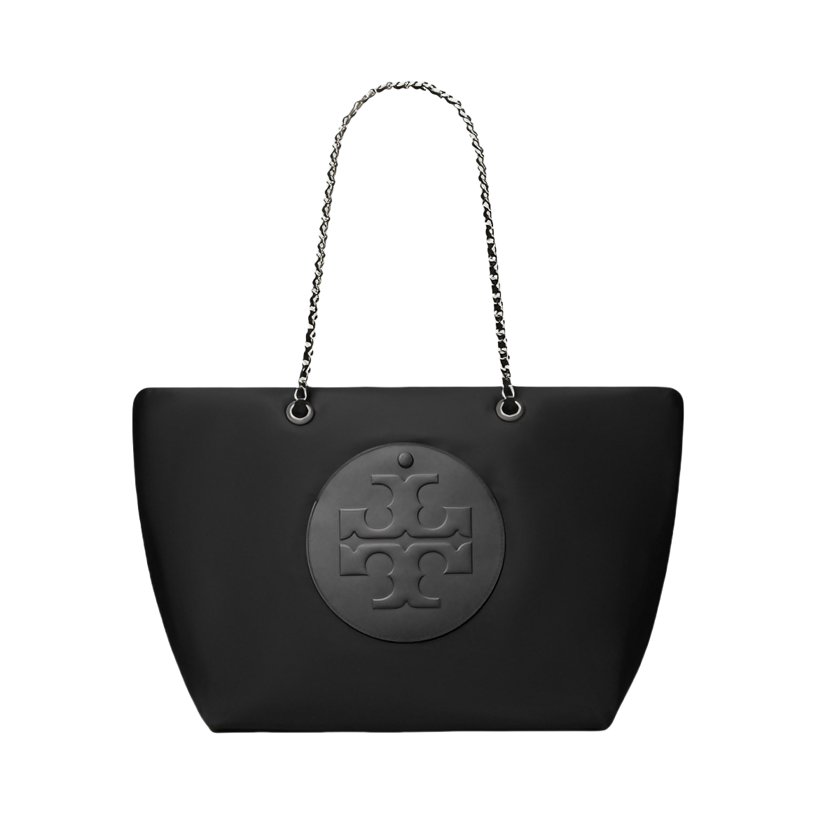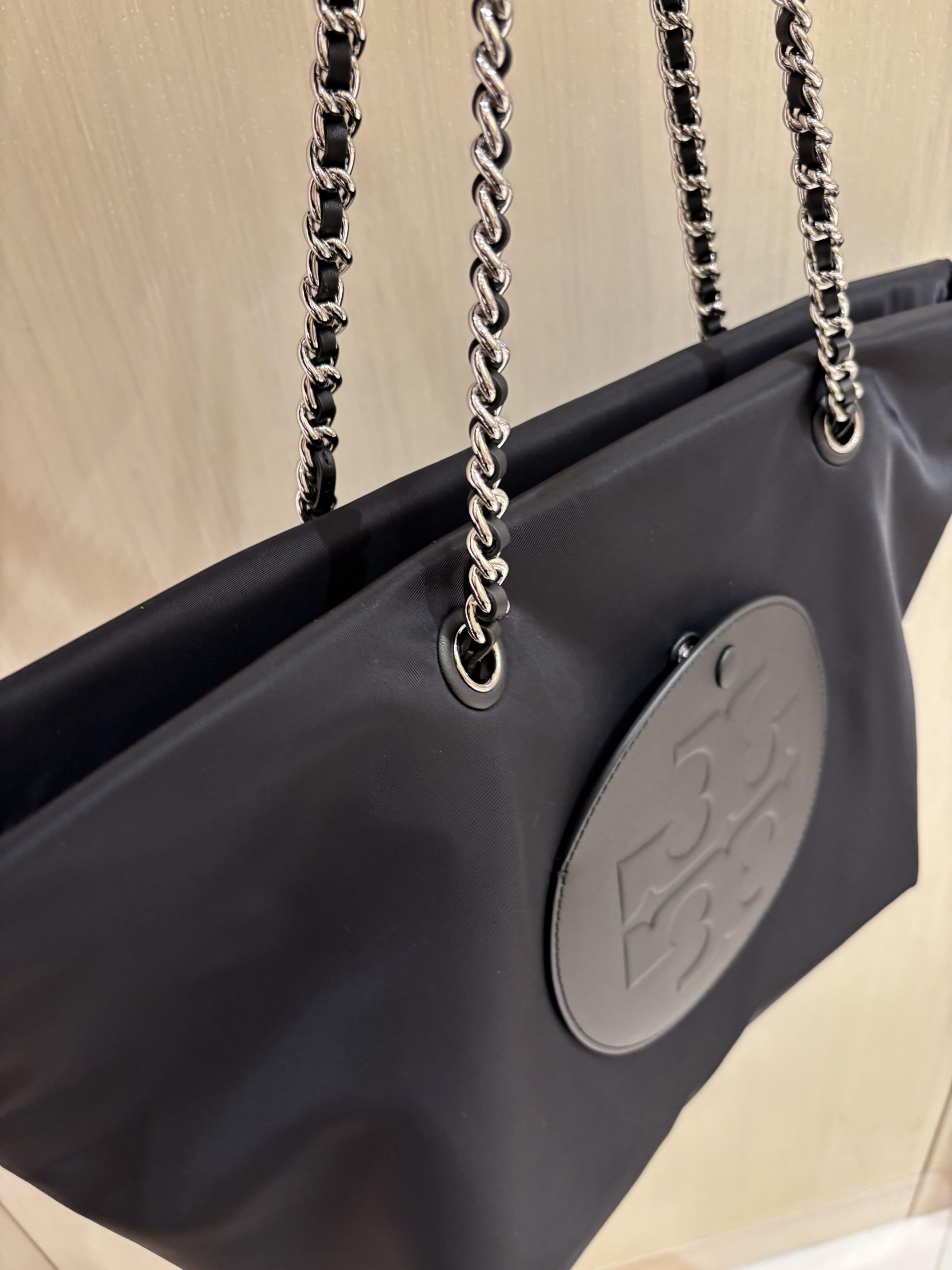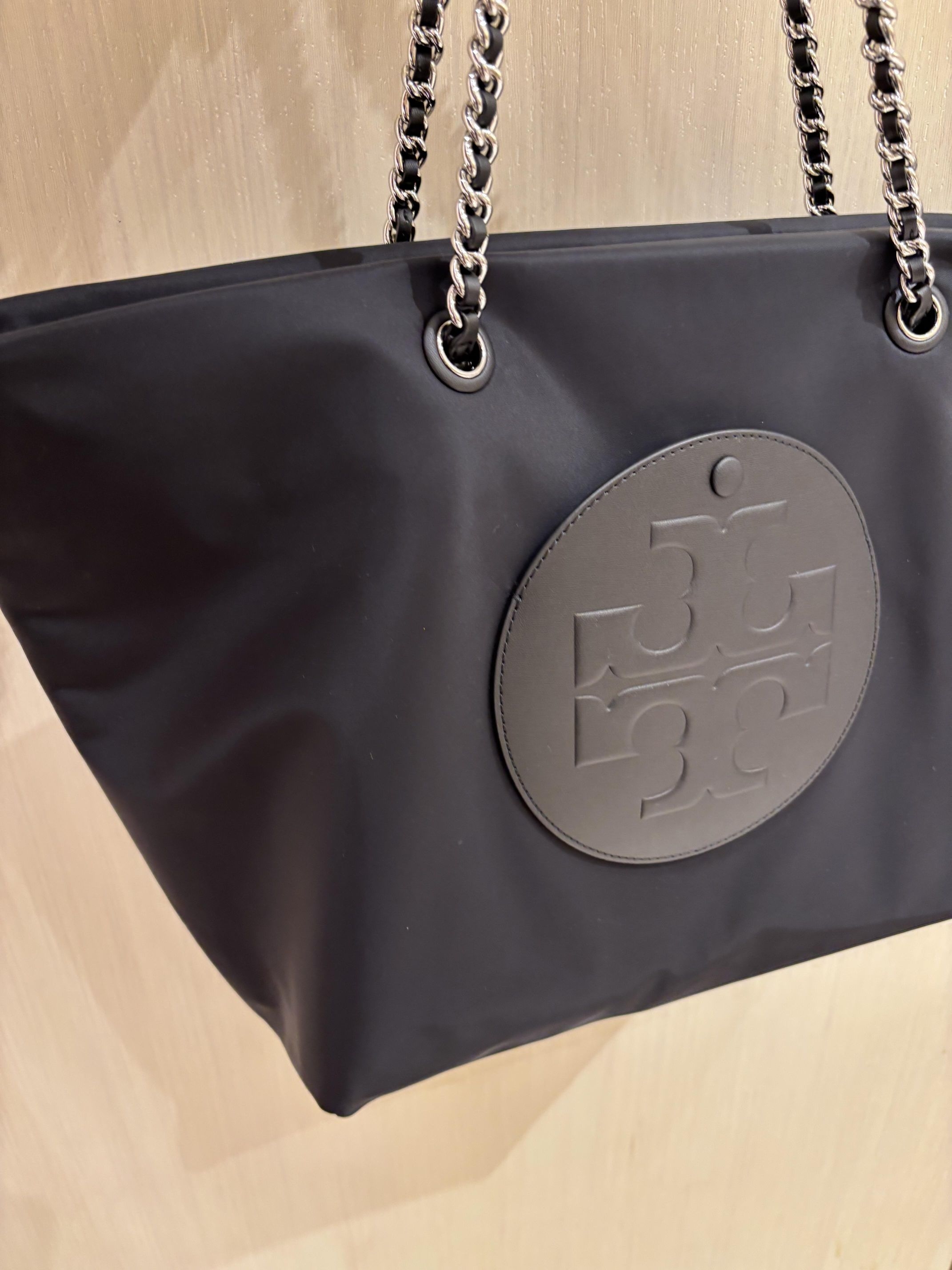 Tory Burch新款Elle托特也太会了吧! 米白/黑色两个色都戳中审美👇 ▪️轻量尼龙材质,通勤装电脑完全没负担 ▪️链条肩带+圆形TB标,休闲里带点精致感 ▪️可搭配草莓挂饰(偷偷说:挂饰是隐藏彩蛋!) 容量巨能装,日常补妆包/笔记本/水杯全塞得下 通勤+逛街一包搞定,早八人狂喜!