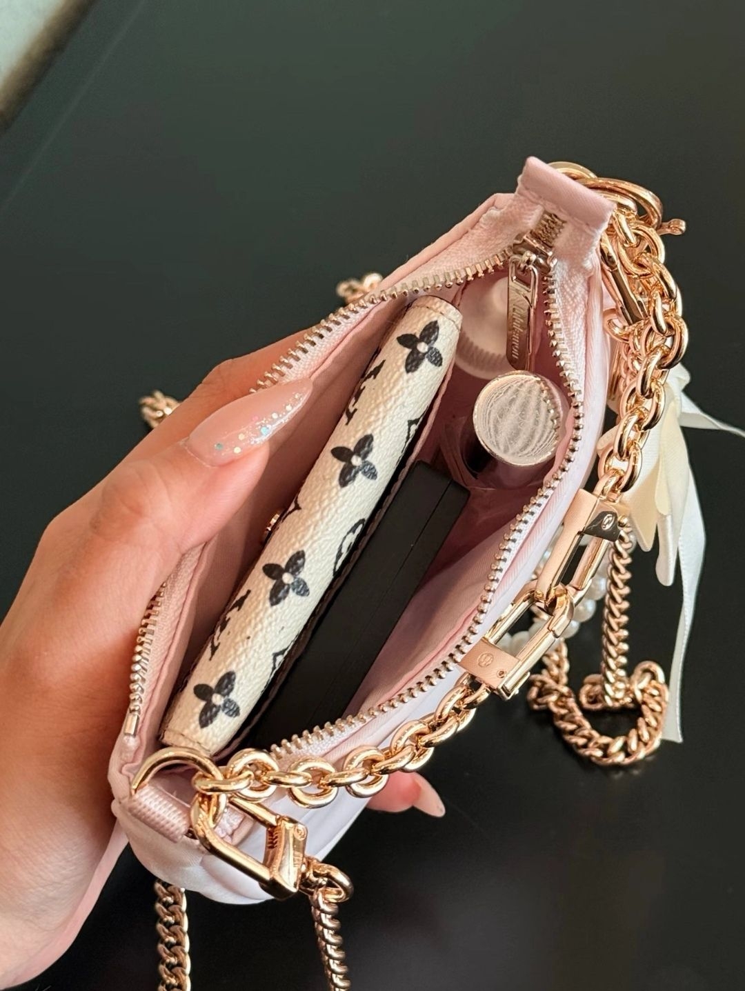 肩带改造后手提变斜挎 单肩背着逛街完全不累 链条和原装扣环完美匹配 挂上蝴蝶结更显小巧思 现在它是我使用率最高的小包 改造完真的越用越爱!