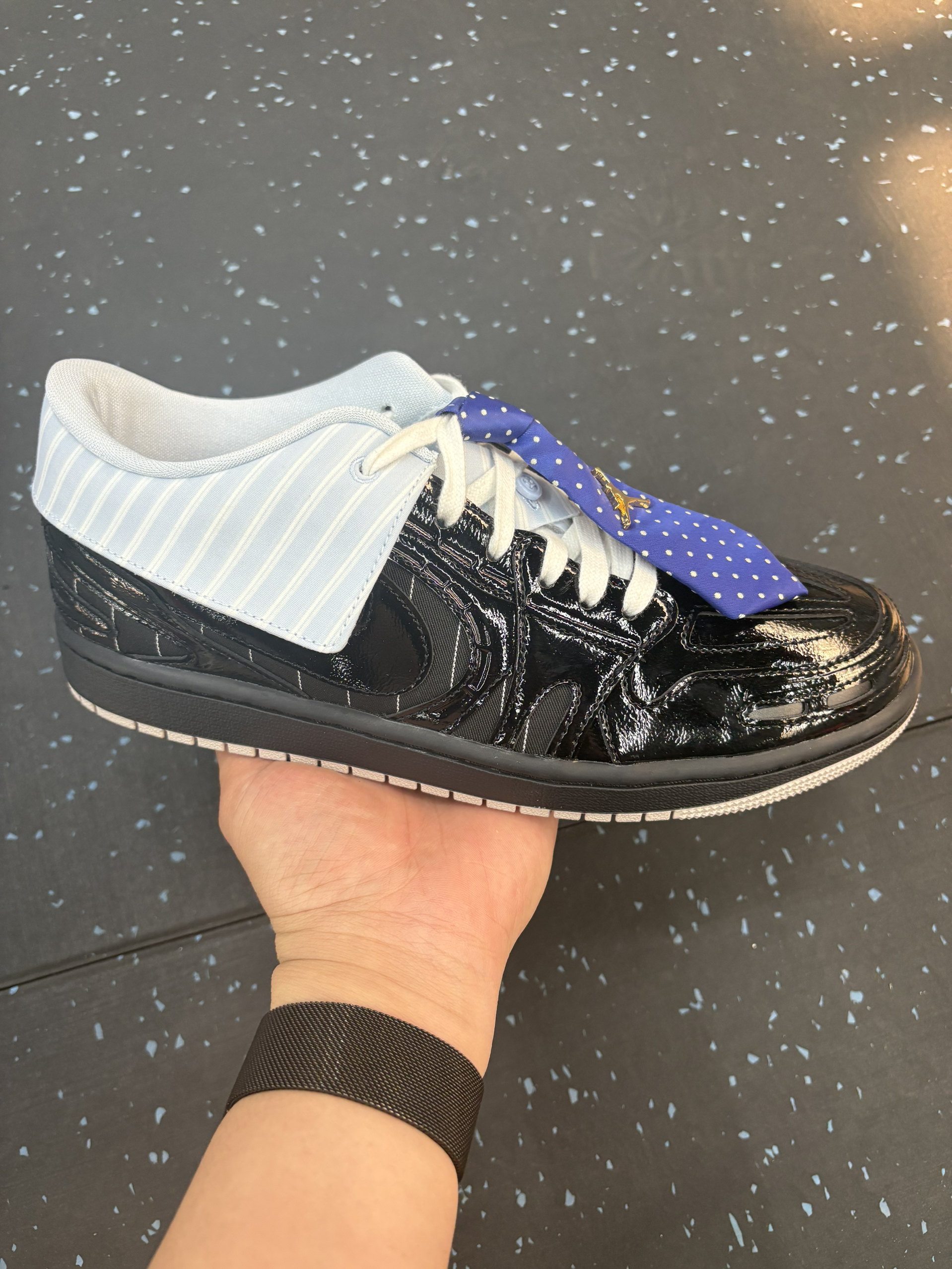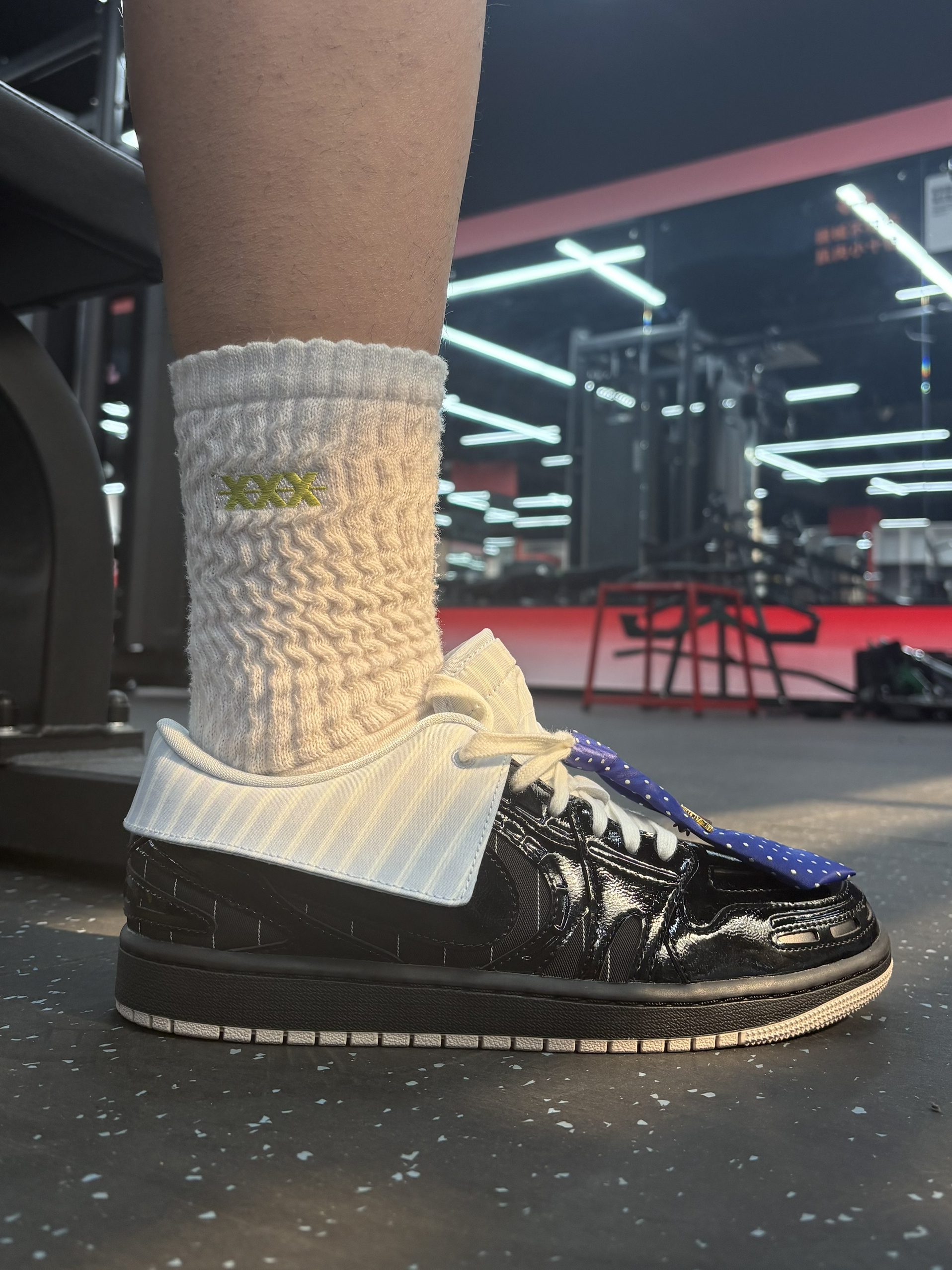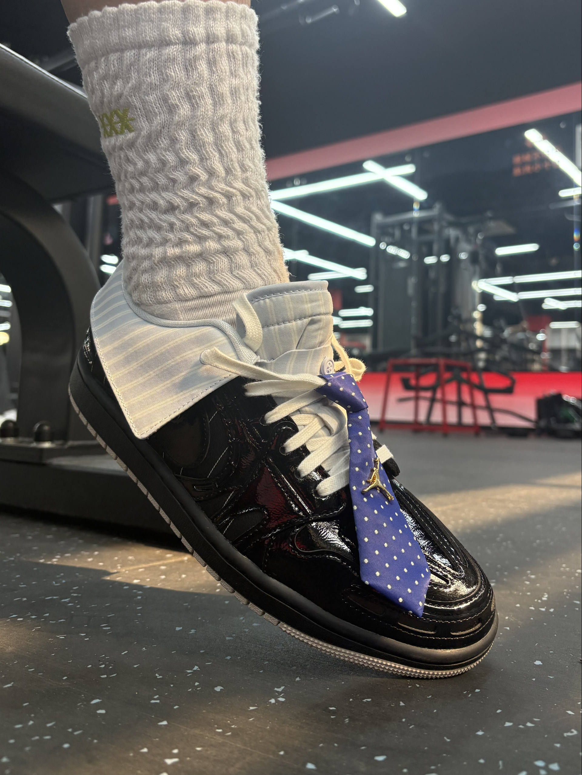 在健身房做西装暴徒🤪 上脚这一双最近入手的西装领带AJ1,别说真的有点东西,真的很有设计感也特别吸睛👀 就是不好穿脱,需要松鞋带 鞋口覆面和领带都是可拆卸的,算得上一鞋两穿 拆掉更百搭,不拆更时尚