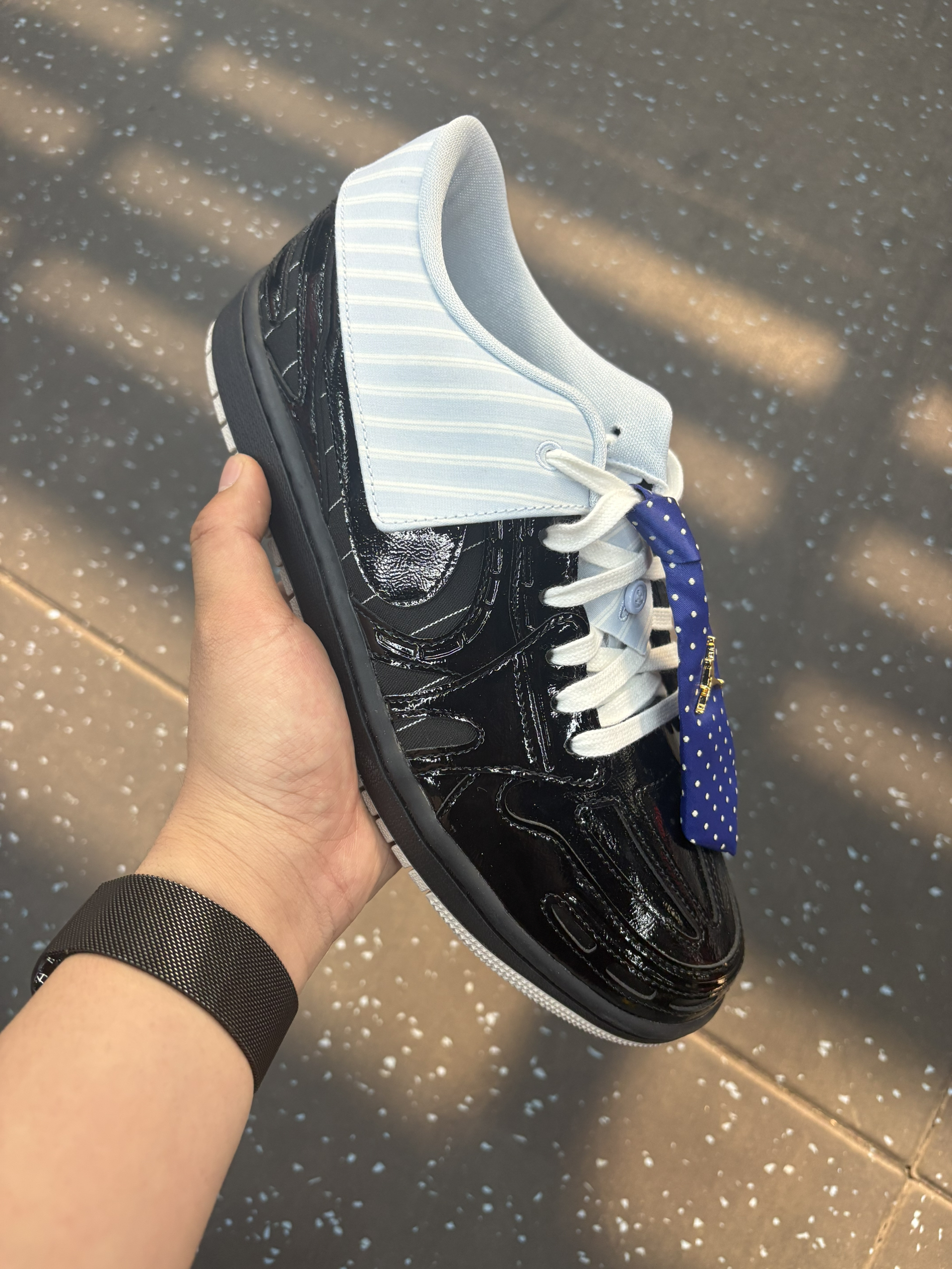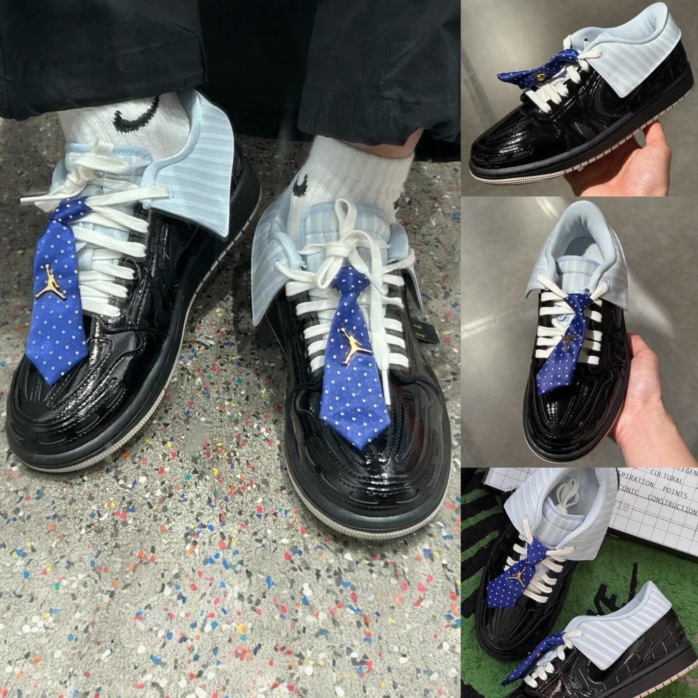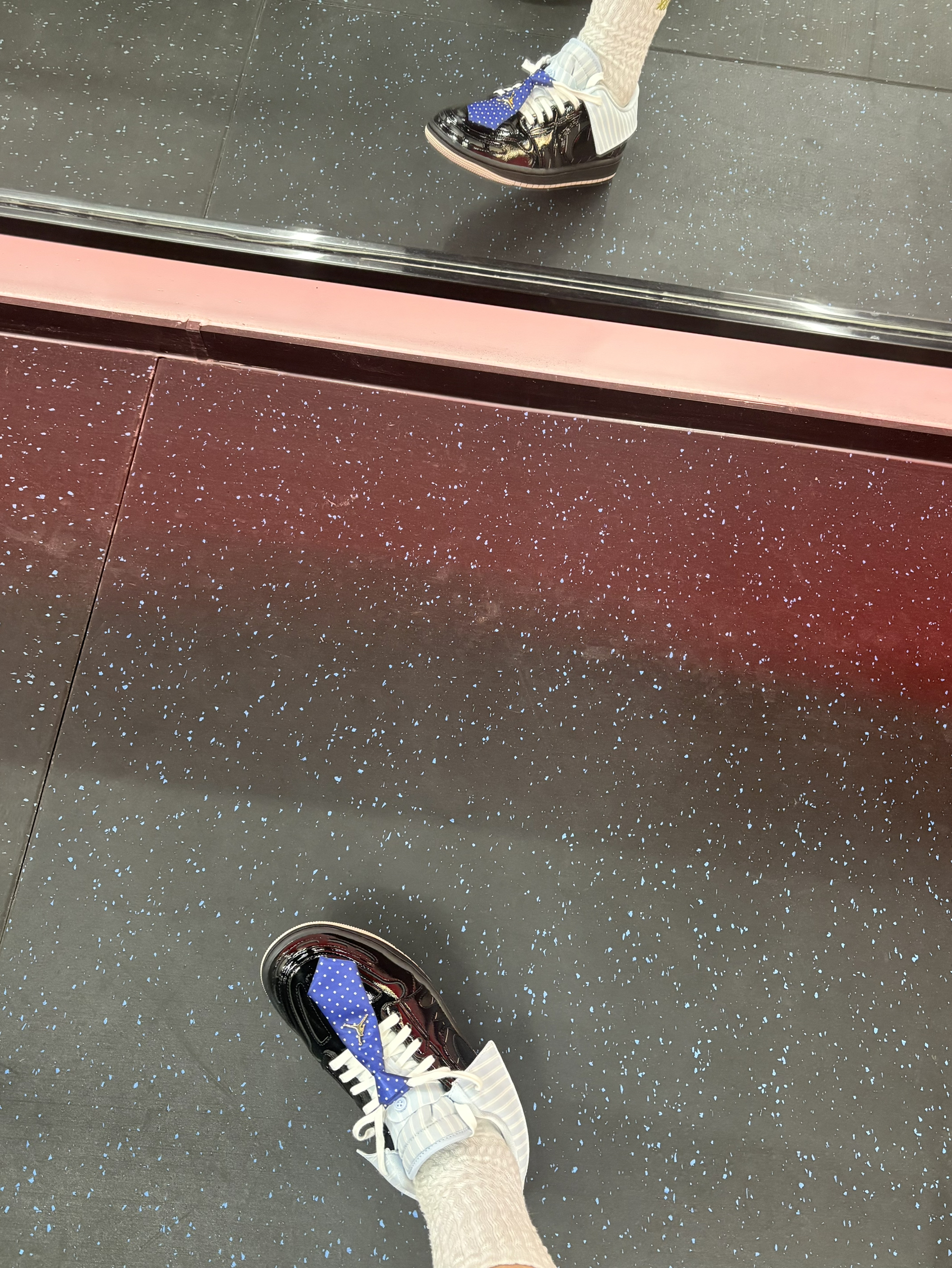 在健身房做西装暴徒🤪 上脚这一双最近入手的西装领带AJ1,别说真的有点东西,真的很有设计感也特别吸睛👀 就是不好穿脱,需要松鞋带 鞋口覆面和领带都是可拆卸的,算得上一鞋两穿 拆掉更百搭,不拆更时尚