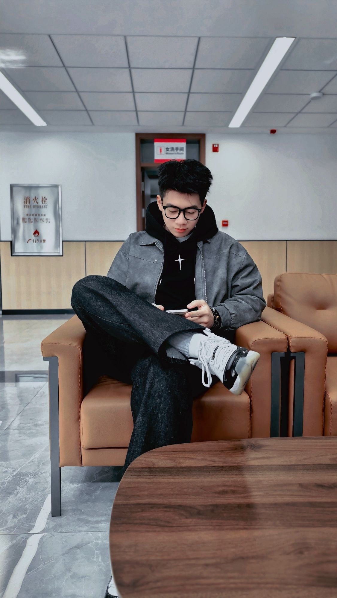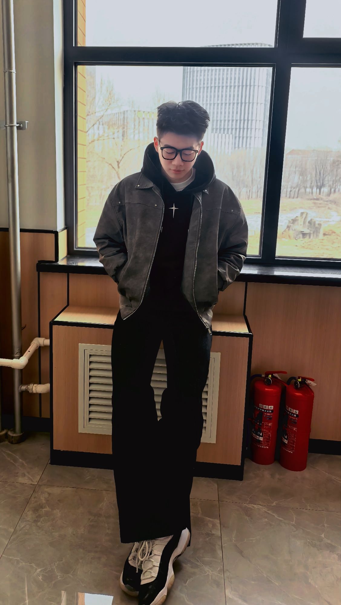 一件黑灰皮衣夹克,内搭黑卫衣,下身配牛仔裤,简单干净,痞帅感拿捏得刚刚好, 不用费心搭配,套上就走的帅气,硬挺版型显肩宽,随性又有型,男生穿真的很加分。