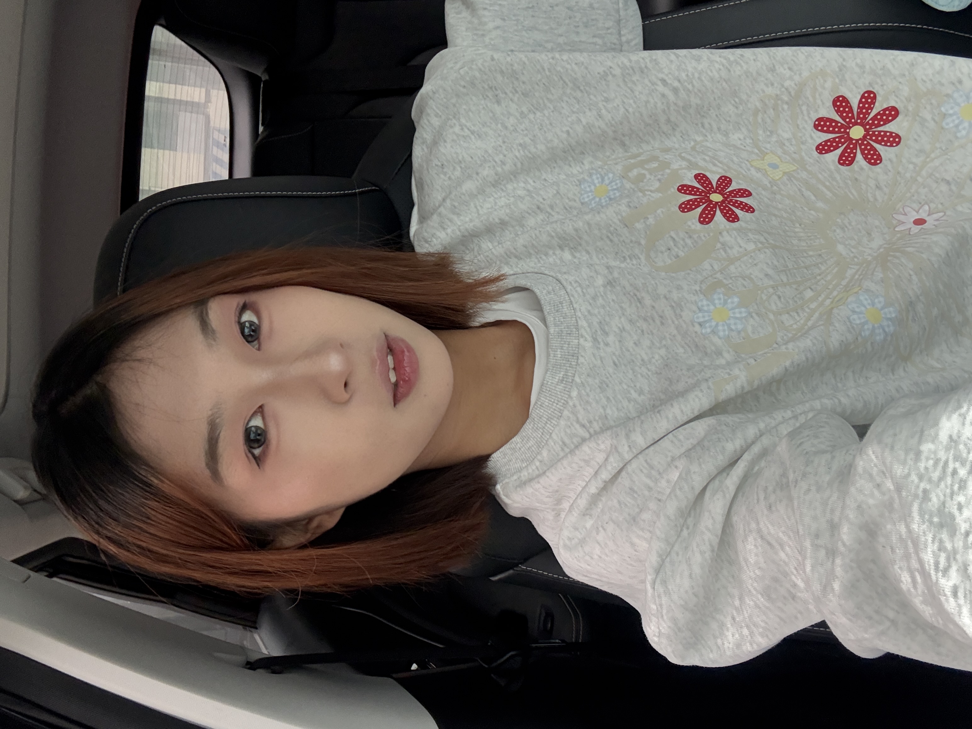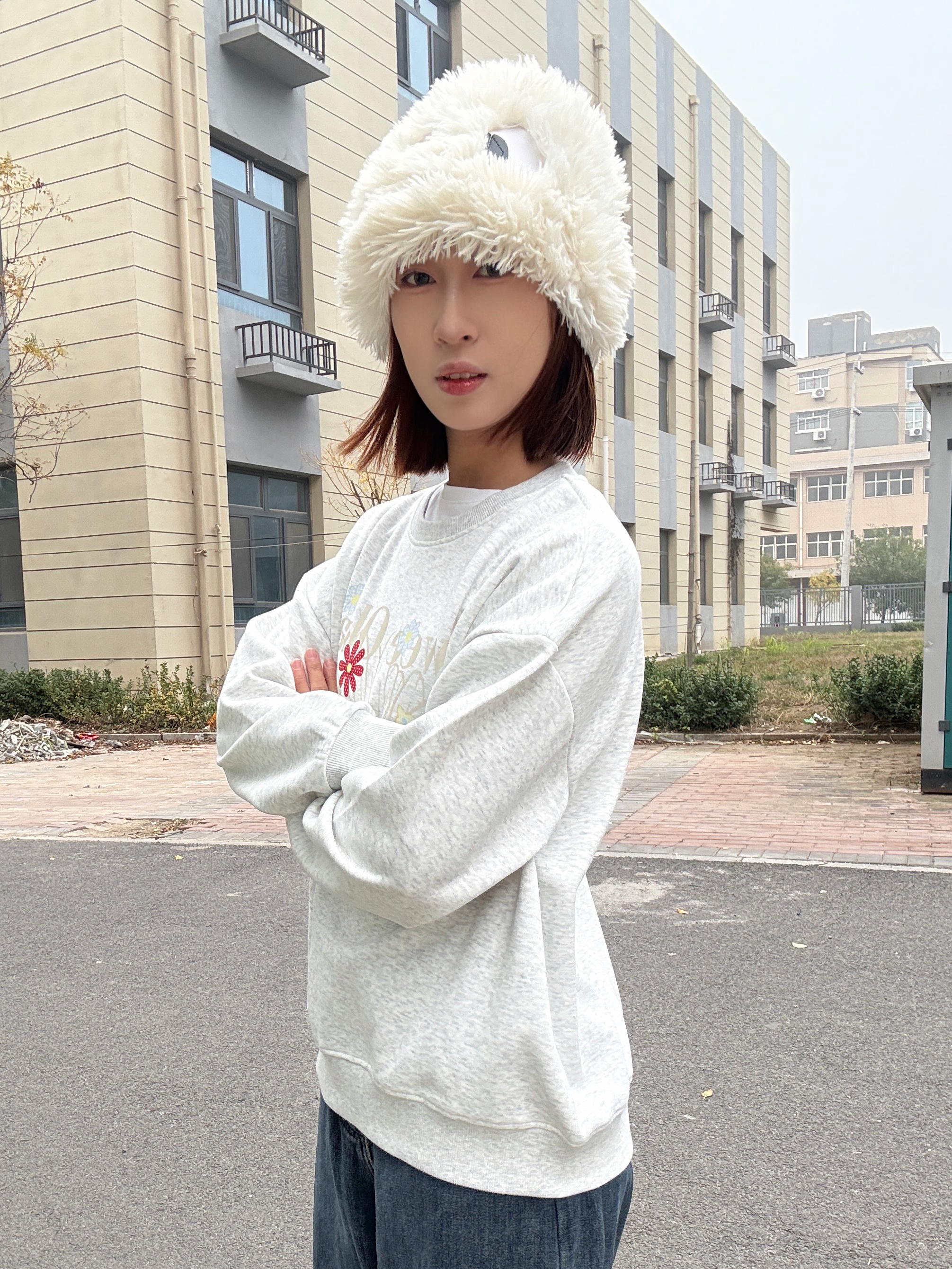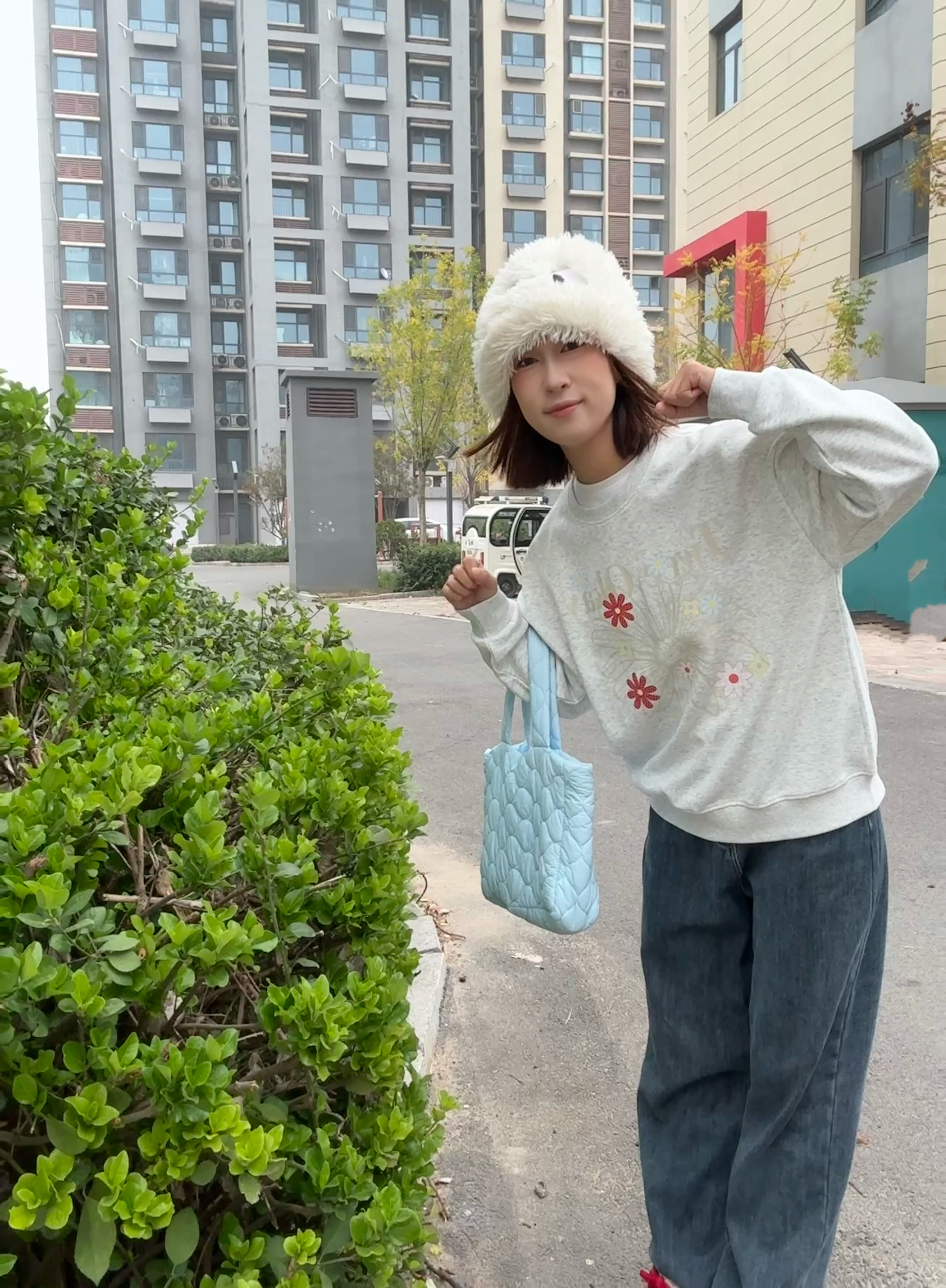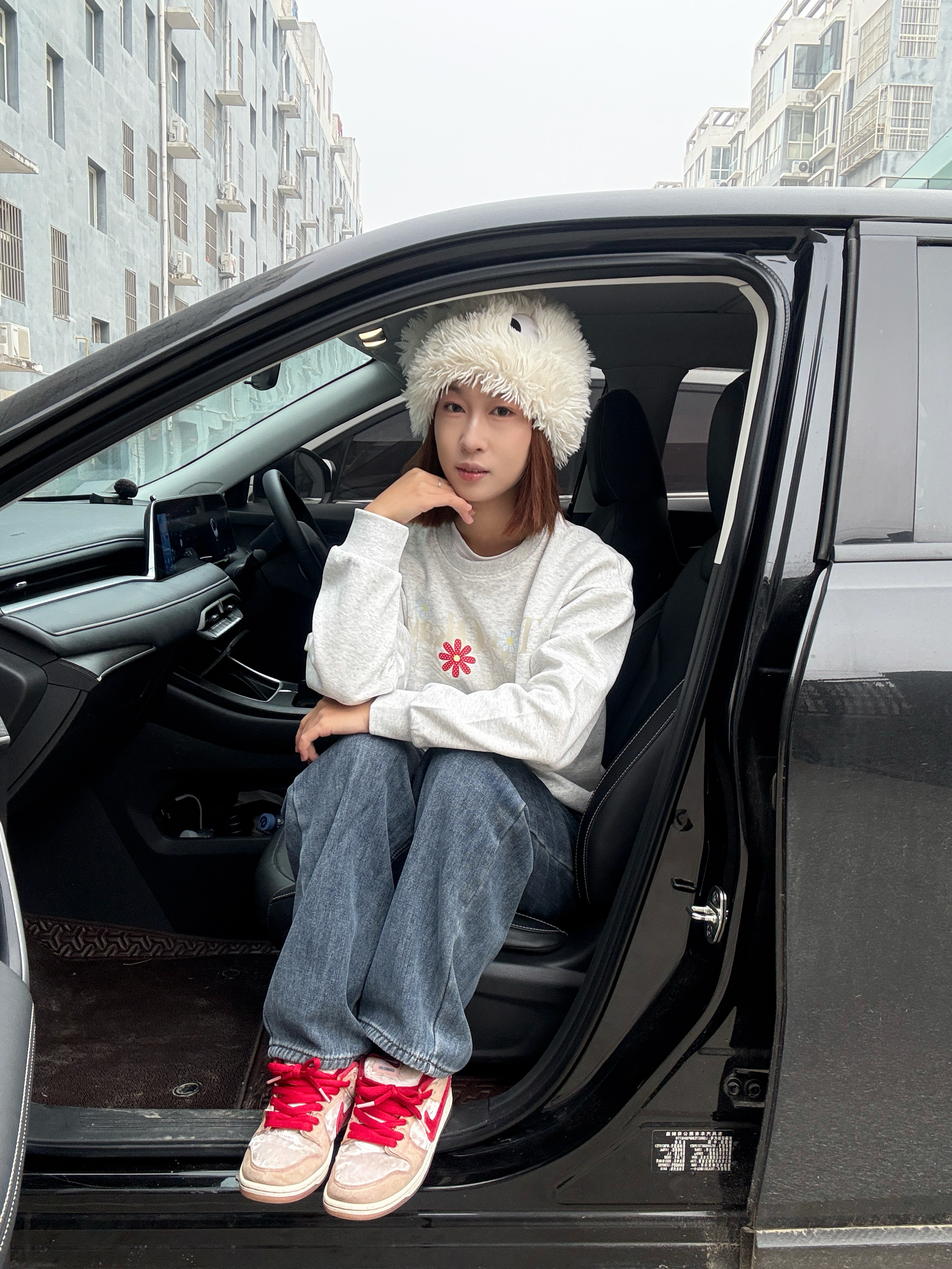 浅灰色卫衣选了带小花图案的款,中和了休闲装的单调,阔腿牛仔裤的垂坠感让造型更松弛,毛绒帽的蓬松感和卫衣的柔软质感呼应,红鞋带的板鞋是整体穿搭的点睛之笔,坐在车内拍出来的画面,满是随性的日常氛围感。