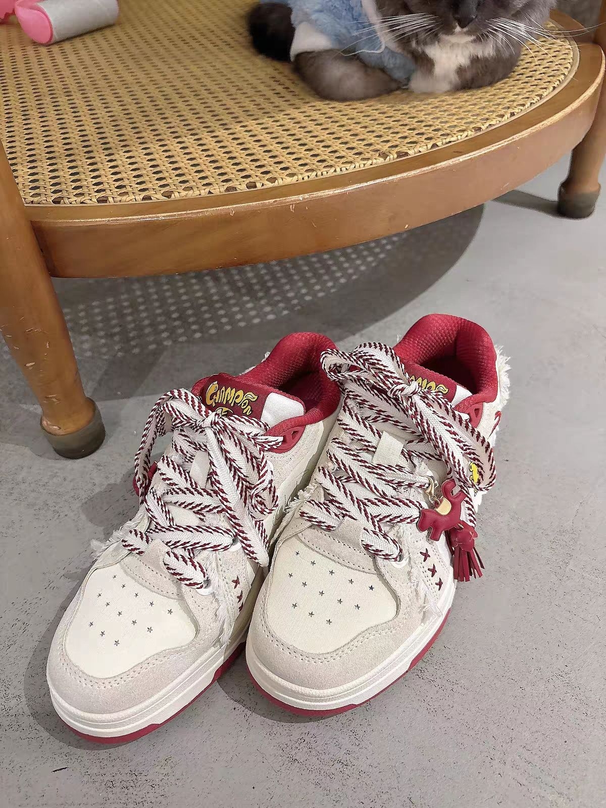 这双红白撞色樱桃板鞋真的太会了!奶白+酒红的配色,温柔又显白,毛边设计自带慵懒氛围感,红白编织鞋带一系,复古感直接拉满~ 上脚软乎乎的,走路久了也不磨脚,配牛仔裤、百褶裙都超绝,甜妹和酷妹都能轻松hold住!鞋柜里缺一双百搭神鞋的姐妹,闭眼冲就对了✨