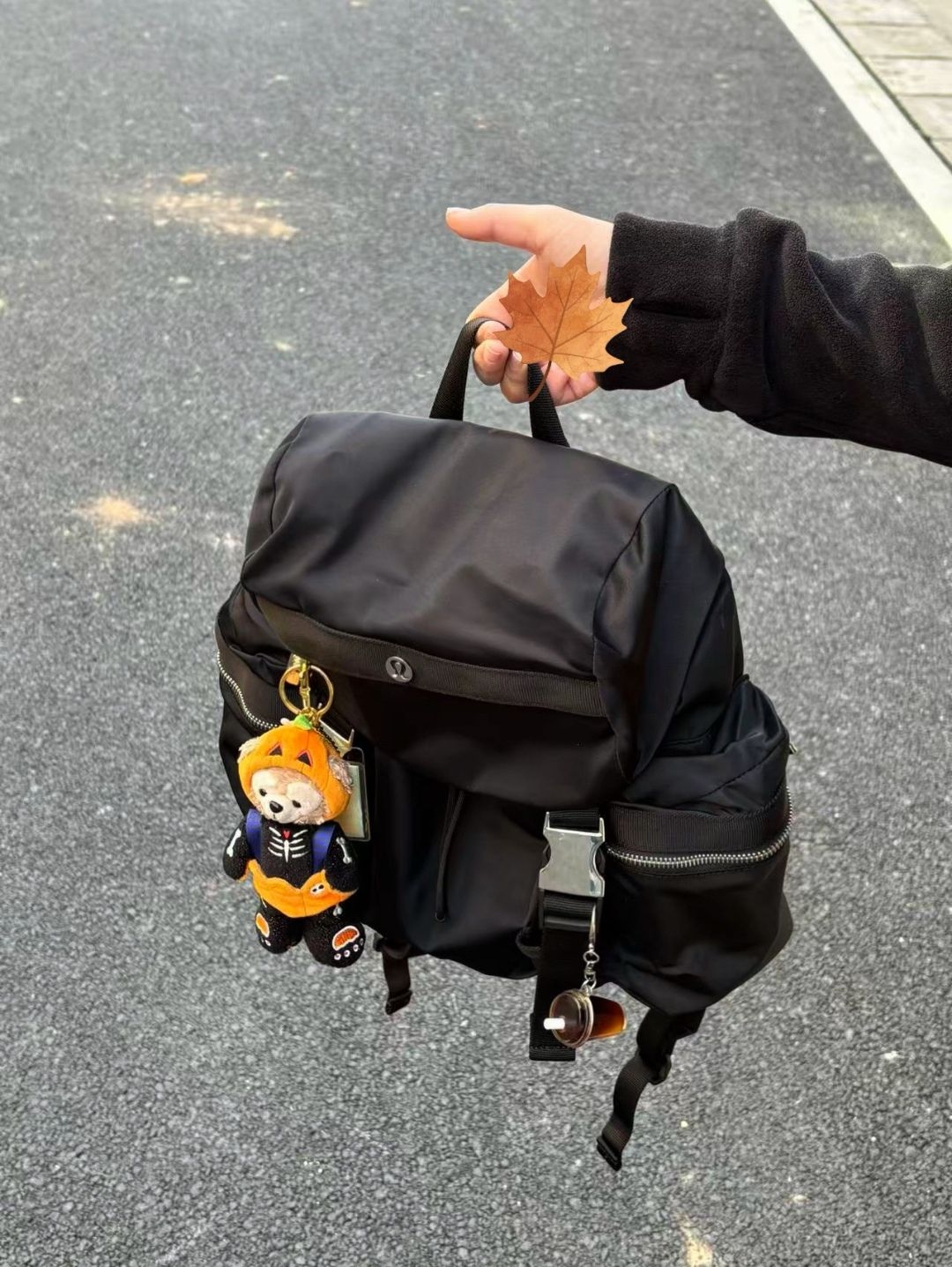 我家里的挂件们终于有用武之地了 炸药包真的很适合挂挂件! 虽然是mini款,但是也很能装东西 主要是颜值真的很高,而且百搭~ 对于大学生来说想追求品质,又买不起太贵的,lululemon这款真的很适合✌️真的是我最爱的双肩包了