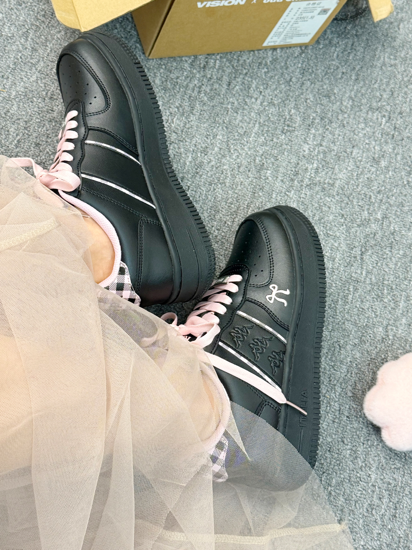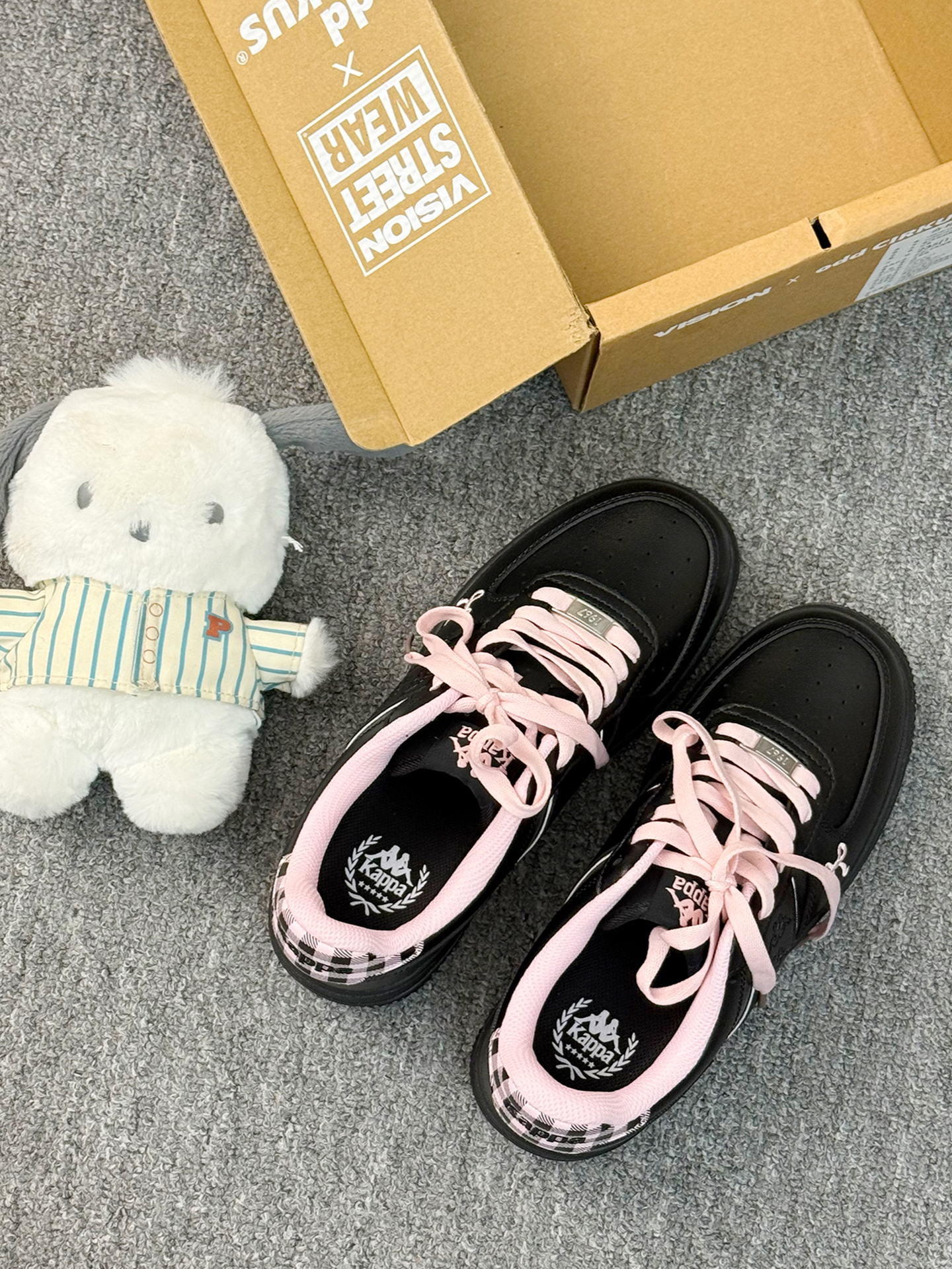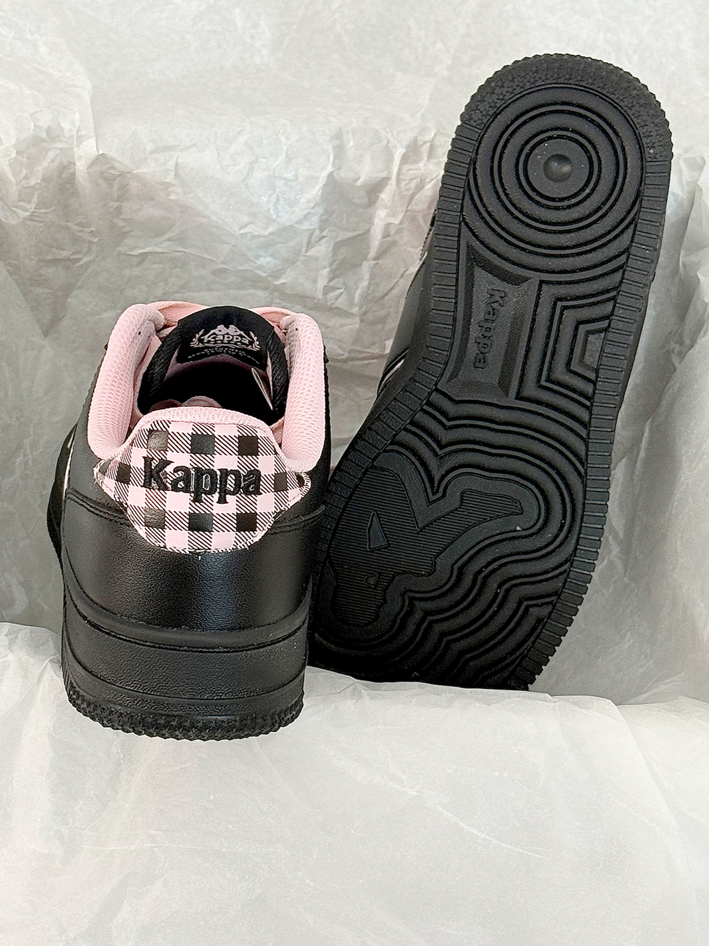 这双 Kappa 黑粉拼色板鞋设计甜酷,粉格纹细节点缀,搭直筒牛仔裤打造随性休闲感。 通勤配垂感西裤干练利落🖤,约会搭纱裙温柔灵动🎀,逛街配束脚卫裤随性洒脱,适配多种日常场景。 偏爱的甜酷日常款搭配,搭配同色系发圈,整体氛围更协调柔和。