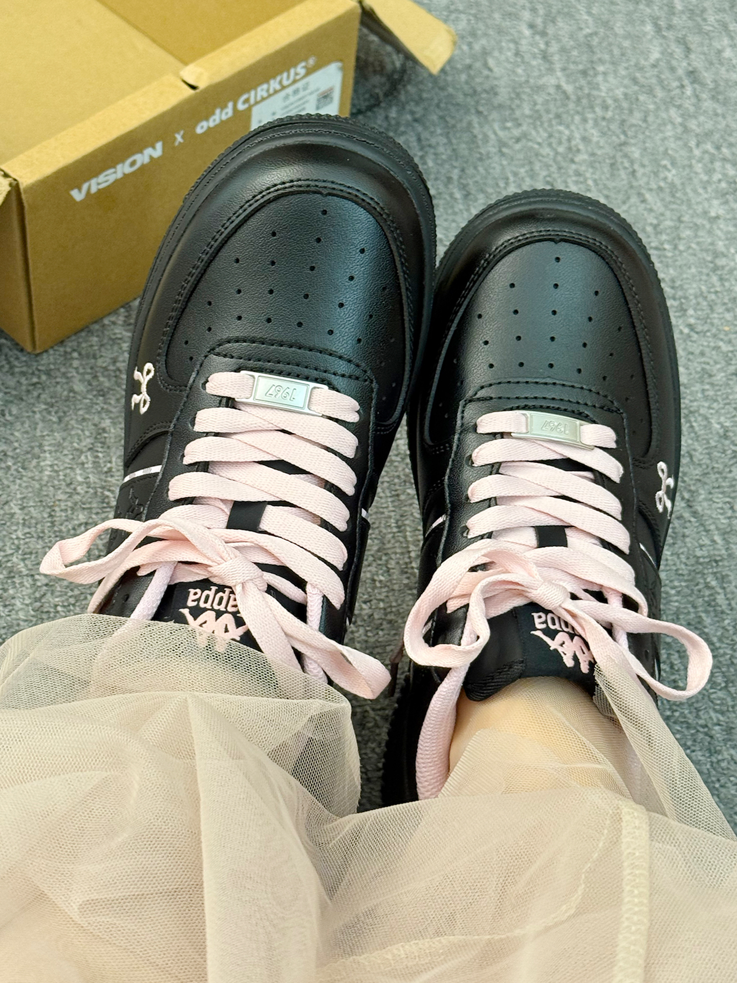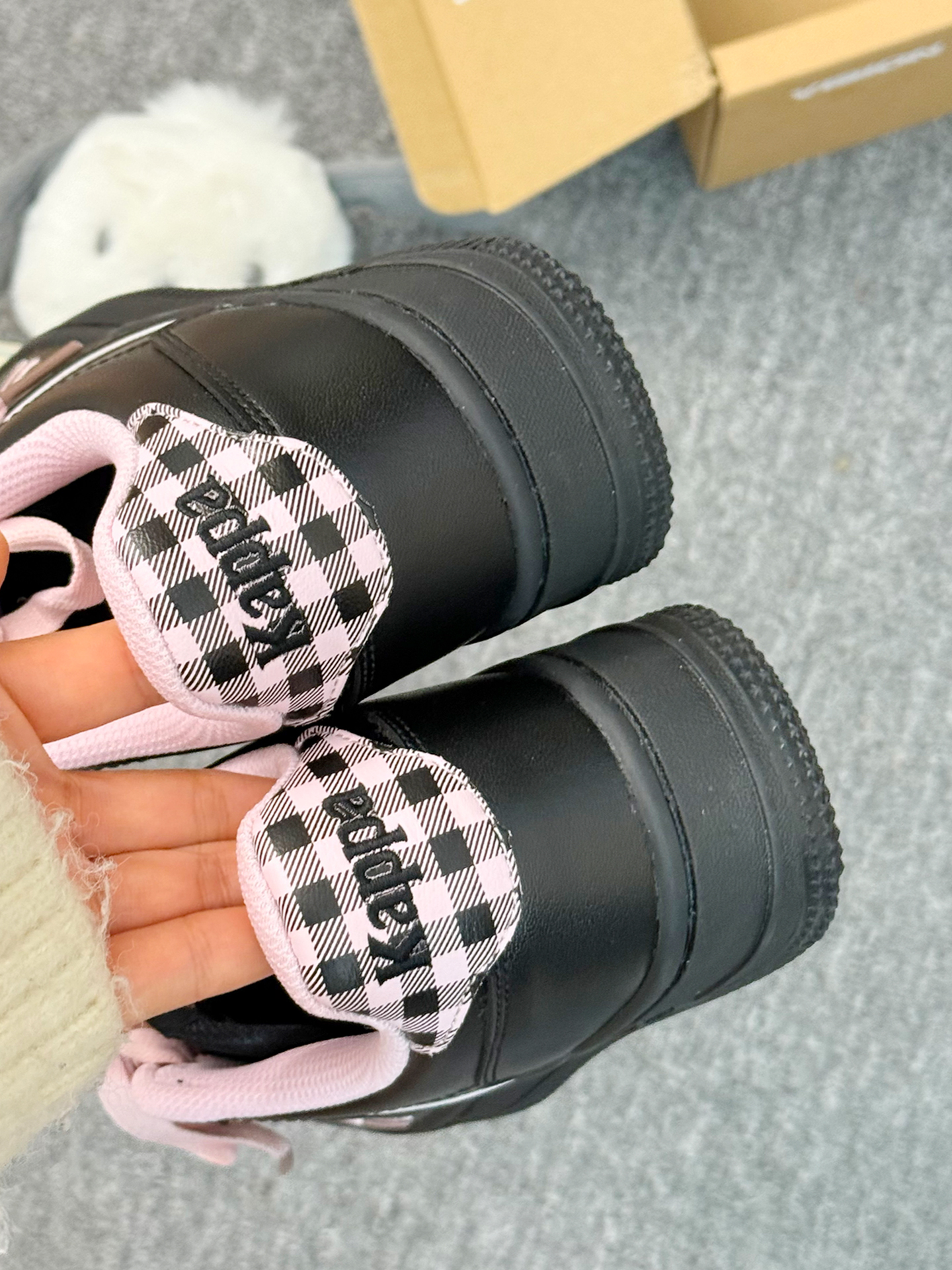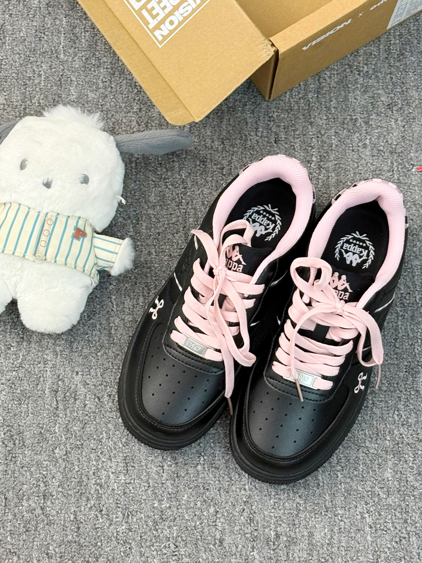 这双 Kappa 黑粉拼色板鞋设计甜酷,粉格纹细节点缀,搭直筒牛仔裤打造随性休闲感。 通勤配垂感西裤干练利落🖤,约会搭纱裙温柔灵动🎀,逛街配束脚卫裤随性洒脱,适配多种日常场景。 偏爱的甜酷日常款搭配,搭配同色系发圈,整体氛围更协调柔和。
