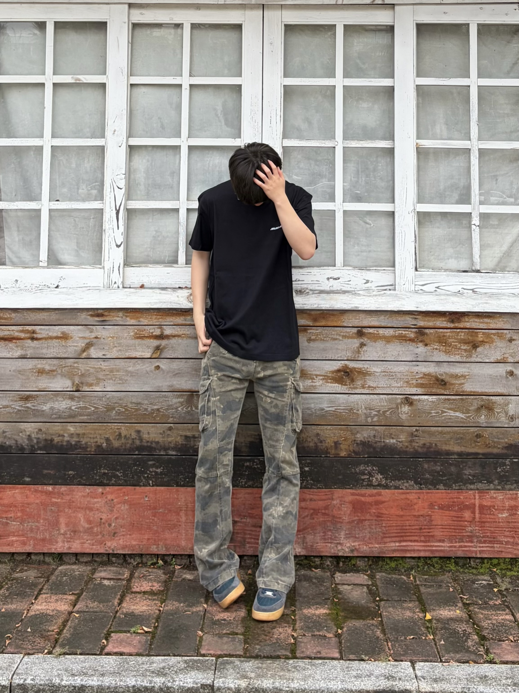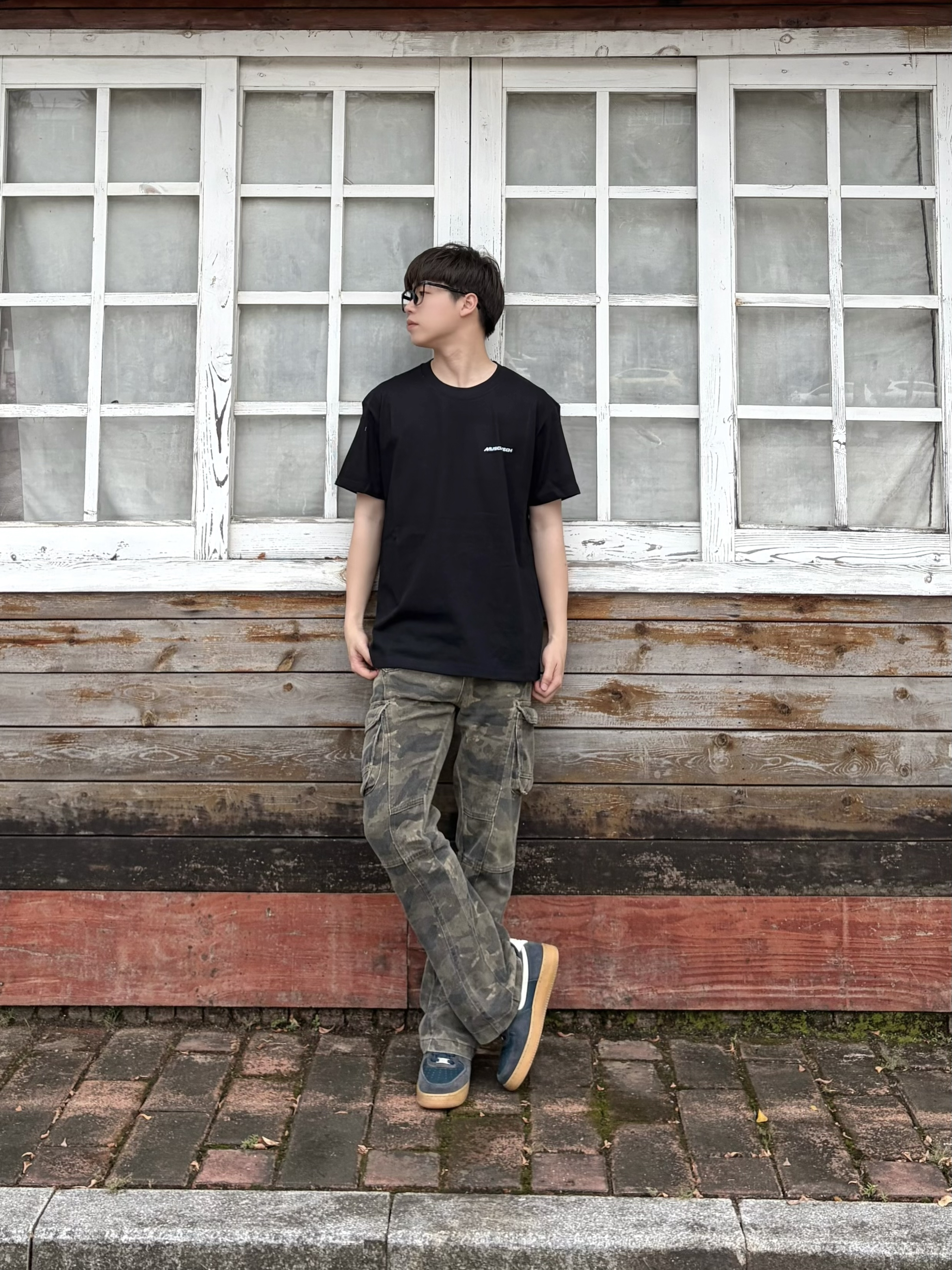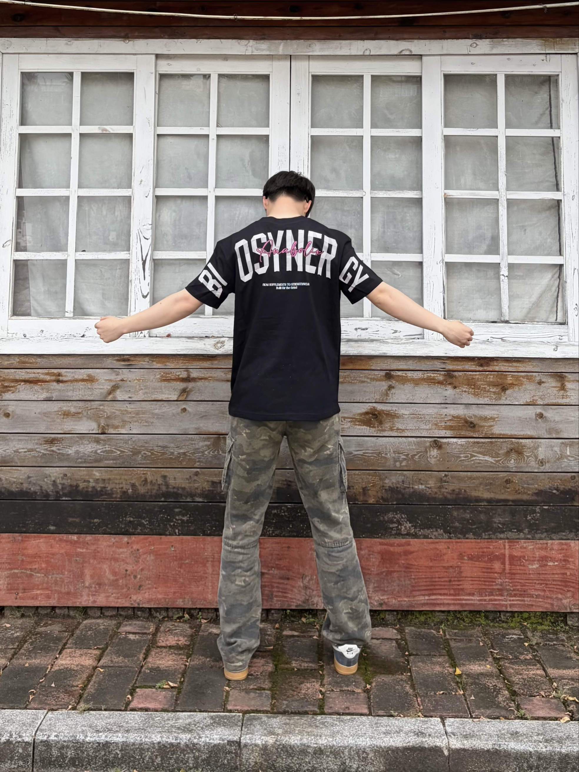 早春的阳光落在旧木屋的木墙上 上身了 MUSCLETECH 这件黑T恤👔 后背胶带字母印花很有美式街头感 粉色手写字体点缀得恰到好处✅ 纯棉面料亲肤透气🌬️ 落肩版型上身宽松又自在 搭配迷彩工装裤👖和德训鞋👟 出行简约中带着街头腔调🚶