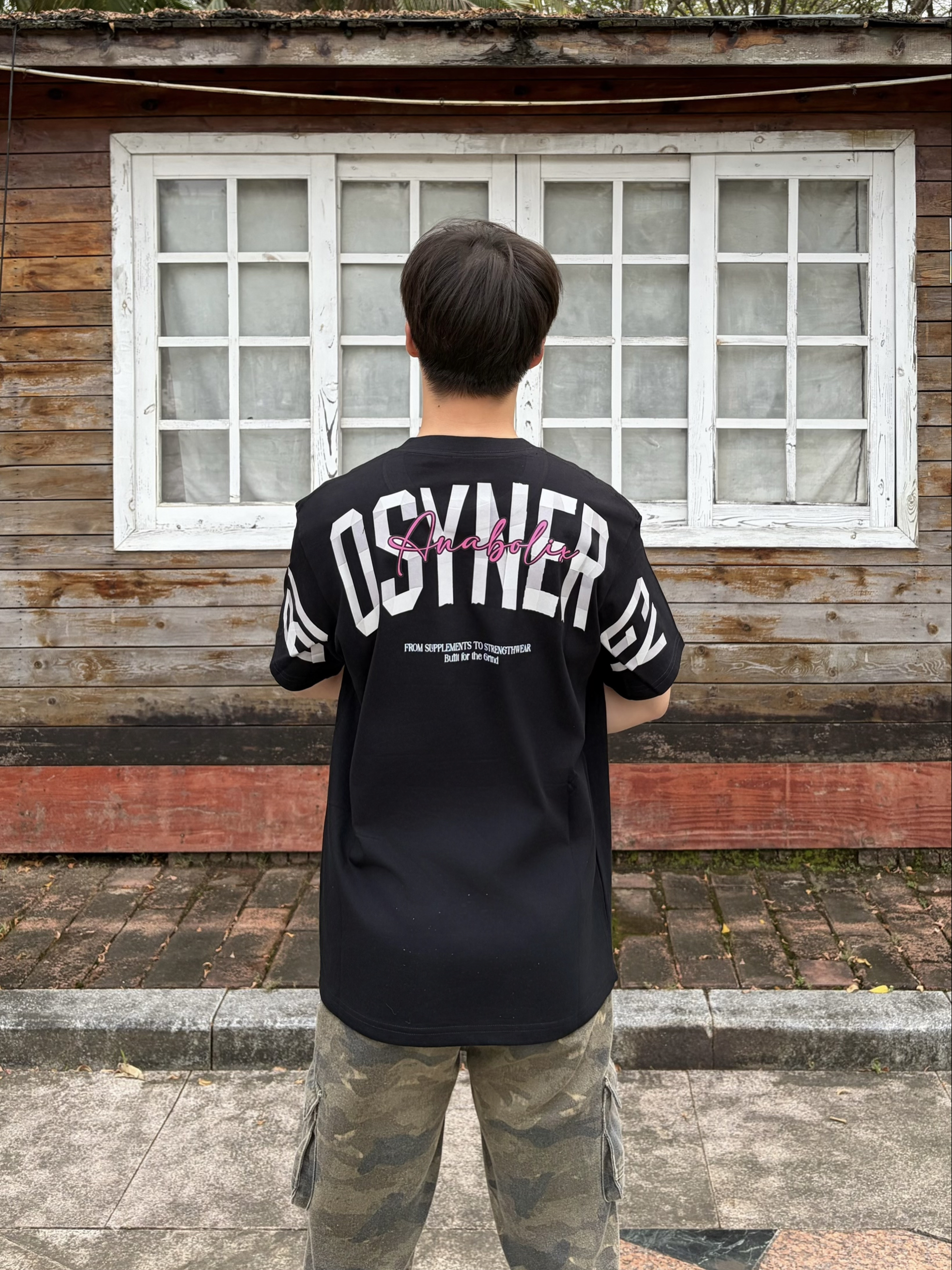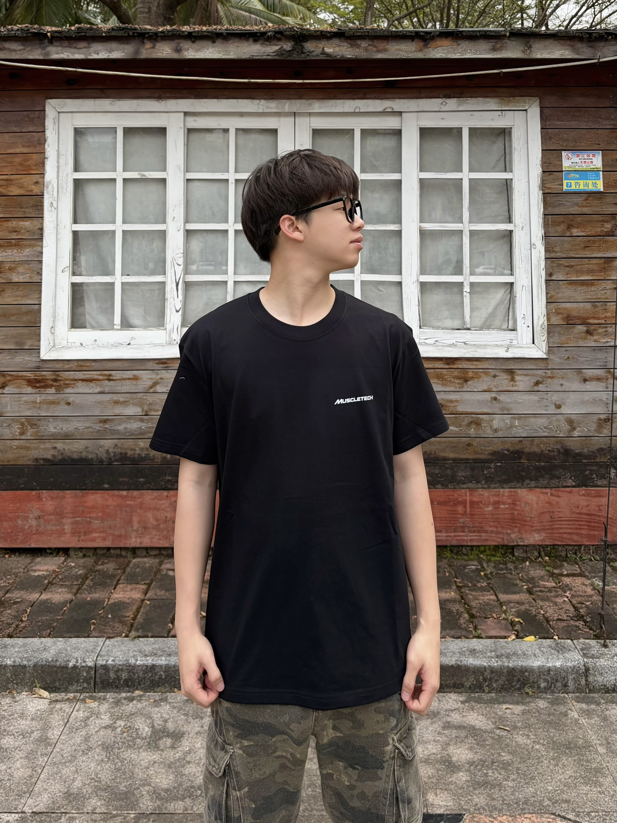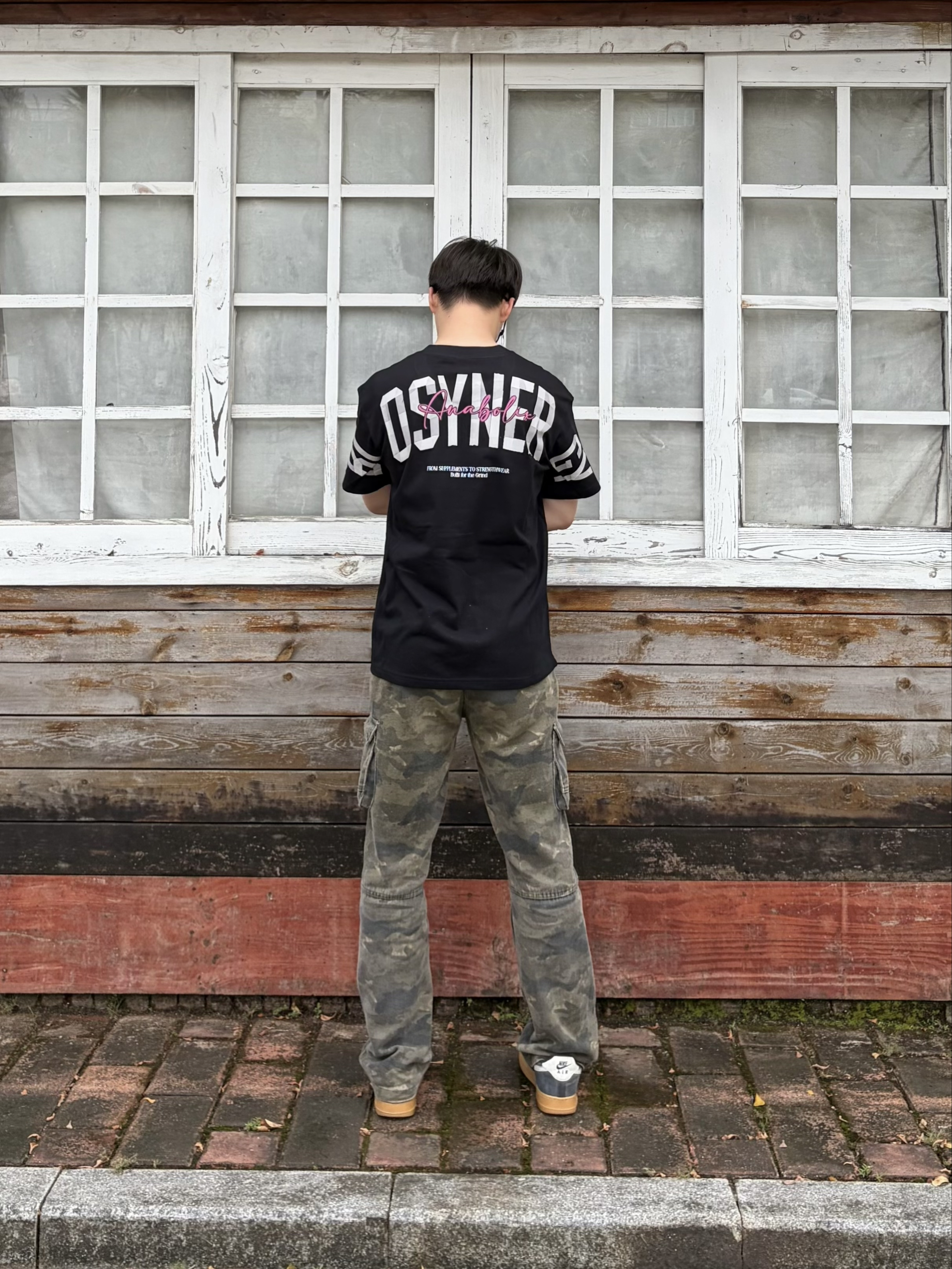 早春的阳光落在旧木屋的木墙上 上身了 MUSCLETECH 这件黑T恤👔 后背胶带字母印花很有美式街头感 粉色手写字体点缀得恰到好处✅ 纯棉面料亲肤透气🌬️ 落肩版型上身宽松又自在 搭配迷彩工装裤👖和德训鞋👟 出行简约中带着街头腔调🚶