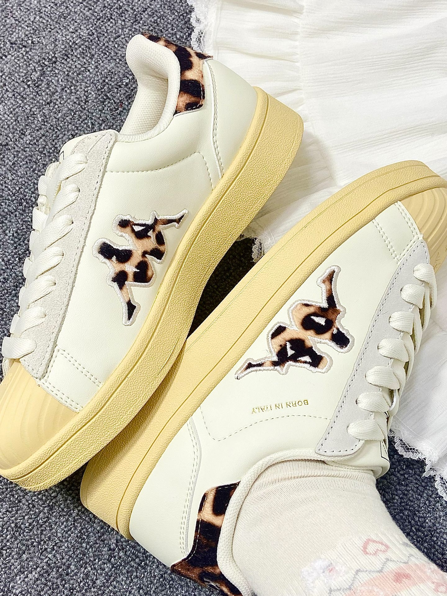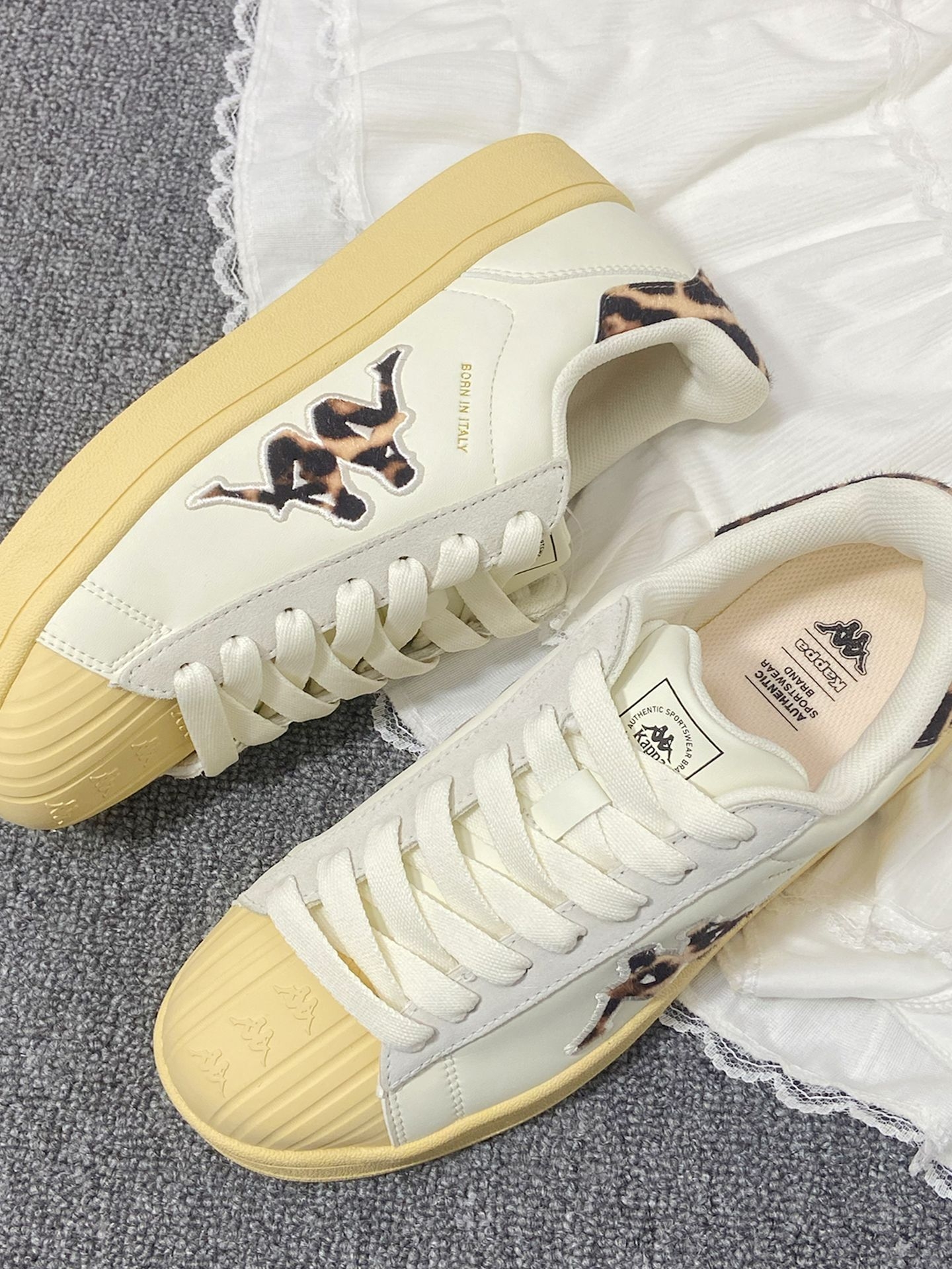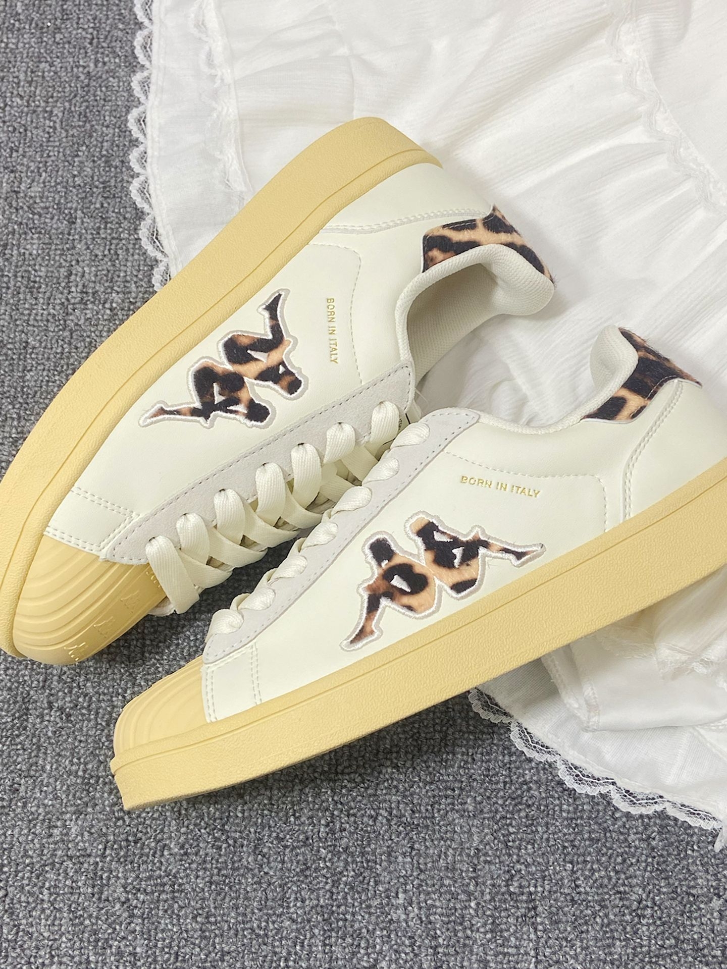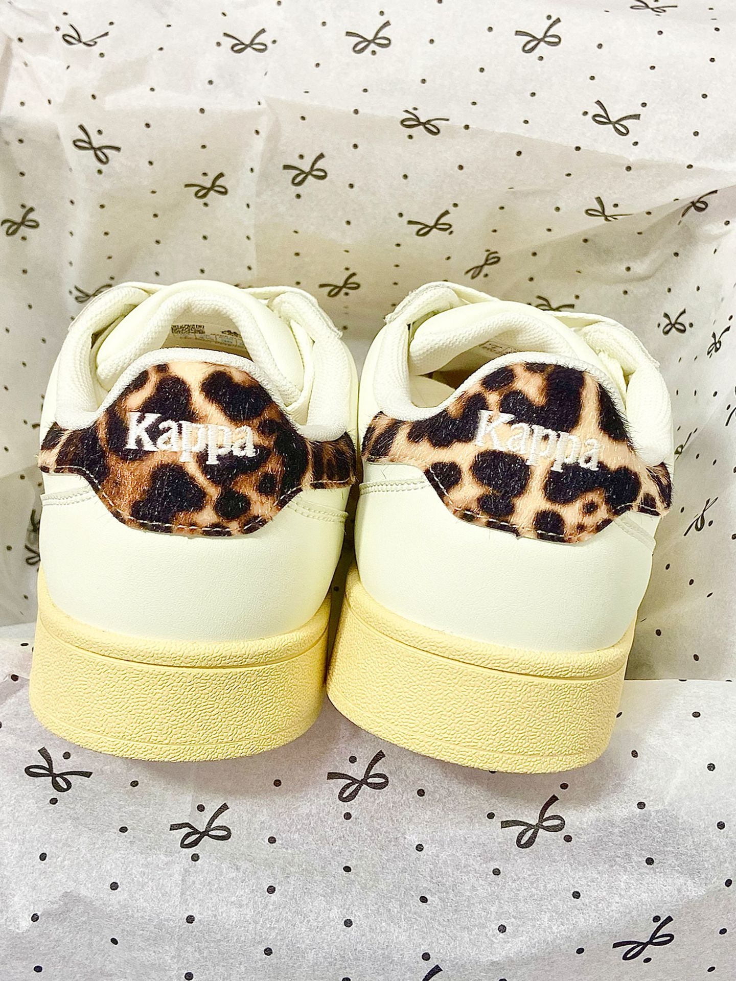 这双 Kappa 奶白豹纹板鞋设计俏皮,毛绒豹纹点缀贝壳头,搭直筒牛仔裤打造随性休闲感。 通勤配垂感西裤干练利落🐆,约会搭纱裙温柔灵动🎀,逛街配束脚卫裤随性洒脱,适配多种日常场景。 偏爱的甜酷日常款搭配,搭配同色系发圈,整体氛围更协调柔和。