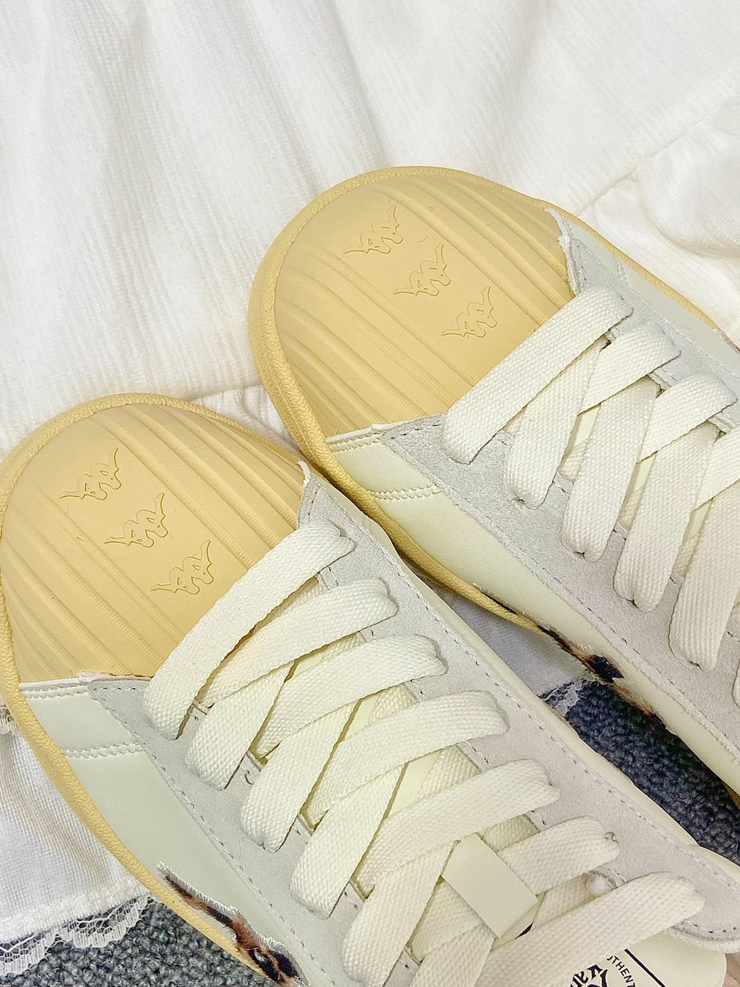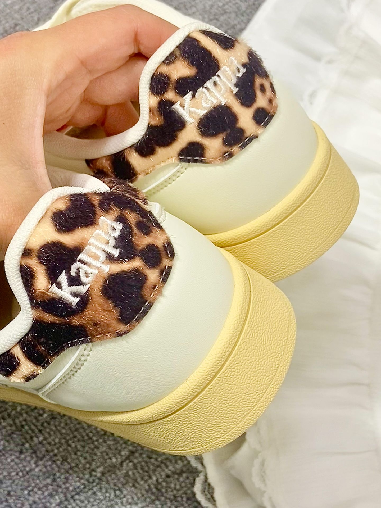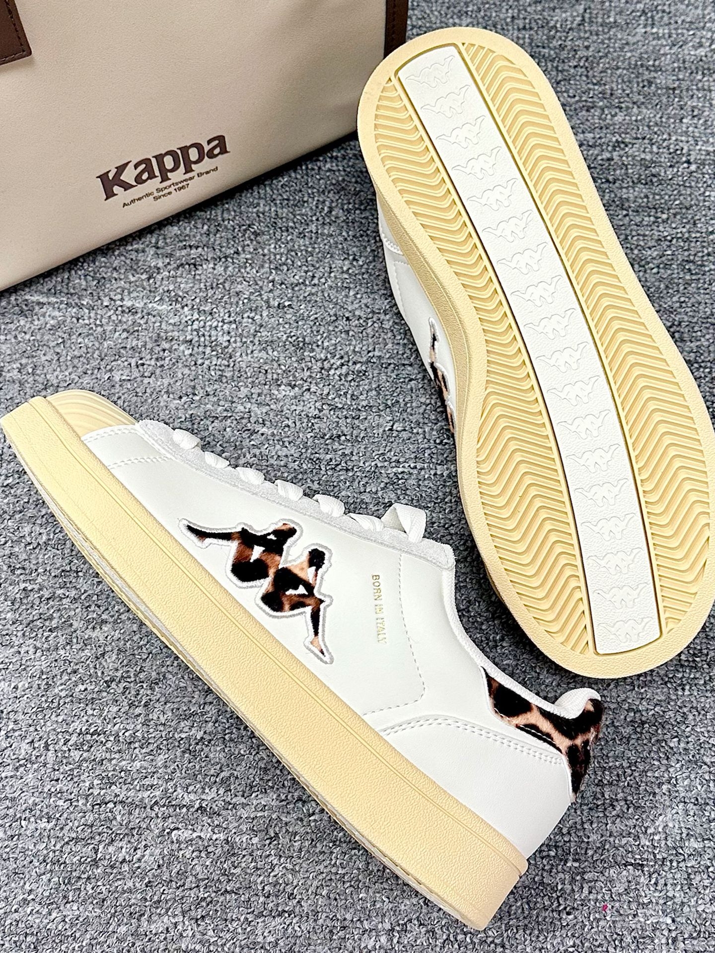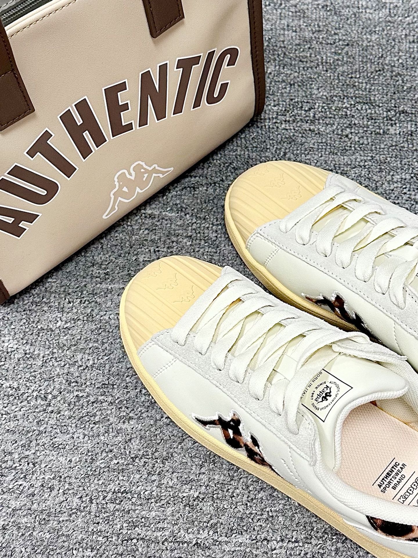 这双 Kappa 奶白豹纹板鞋设计俏皮,毛绒豹纹点缀贝壳头,搭直筒牛仔裤打造随性休闲感。 通勤配垂感西裤干练利落🐆,约会搭纱裙温柔灵动🎀,逛街配束脚卫裤随性洒脱,适配多种日常场景。 偏爱的甜酷日常款搭配,搭配同色系发圈,整体氛围更协调柔和。