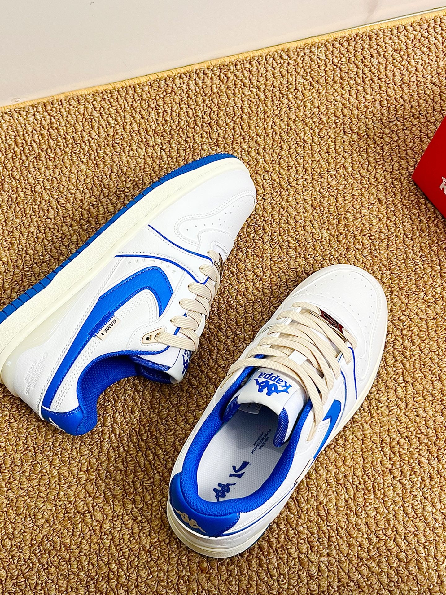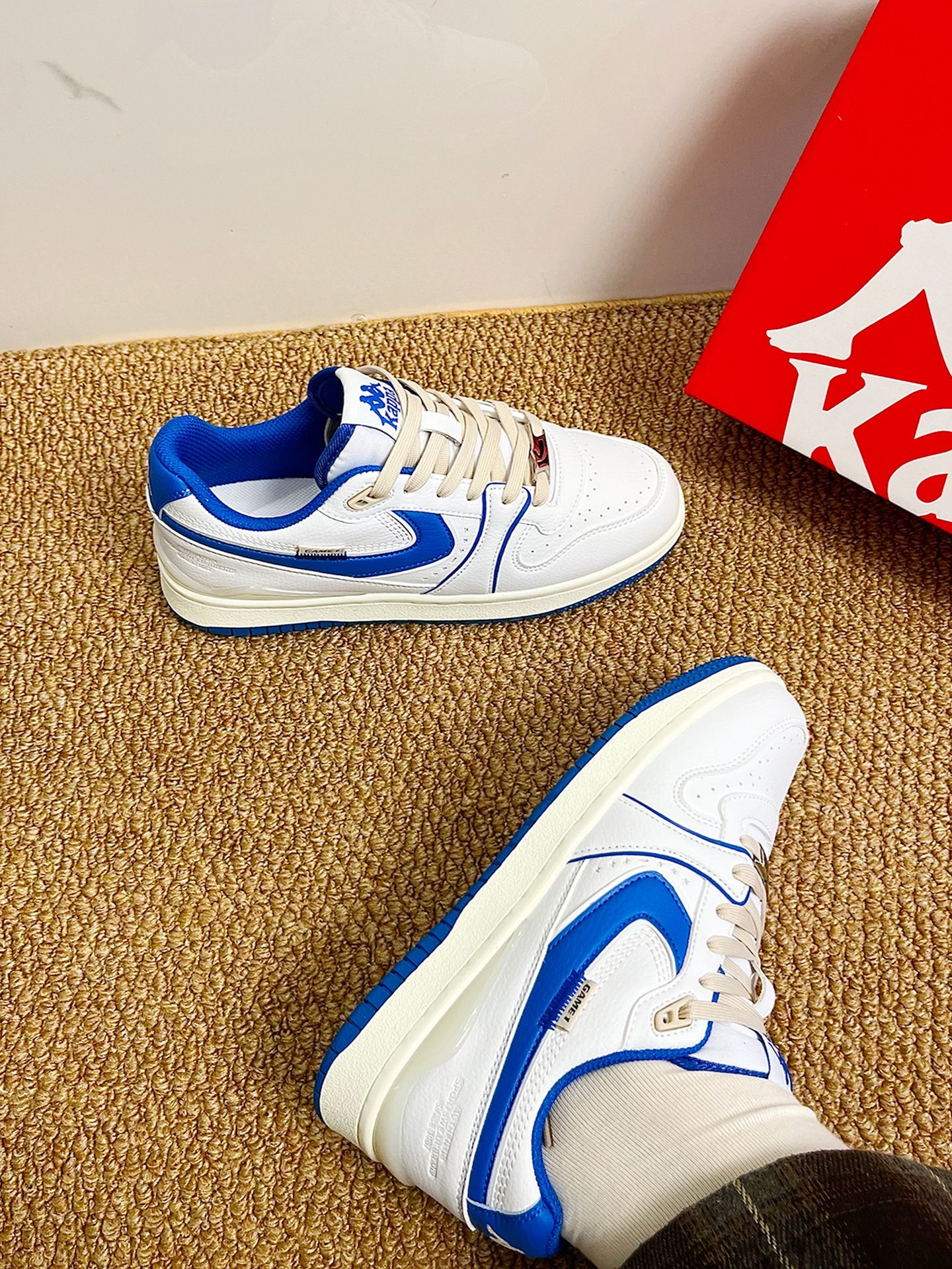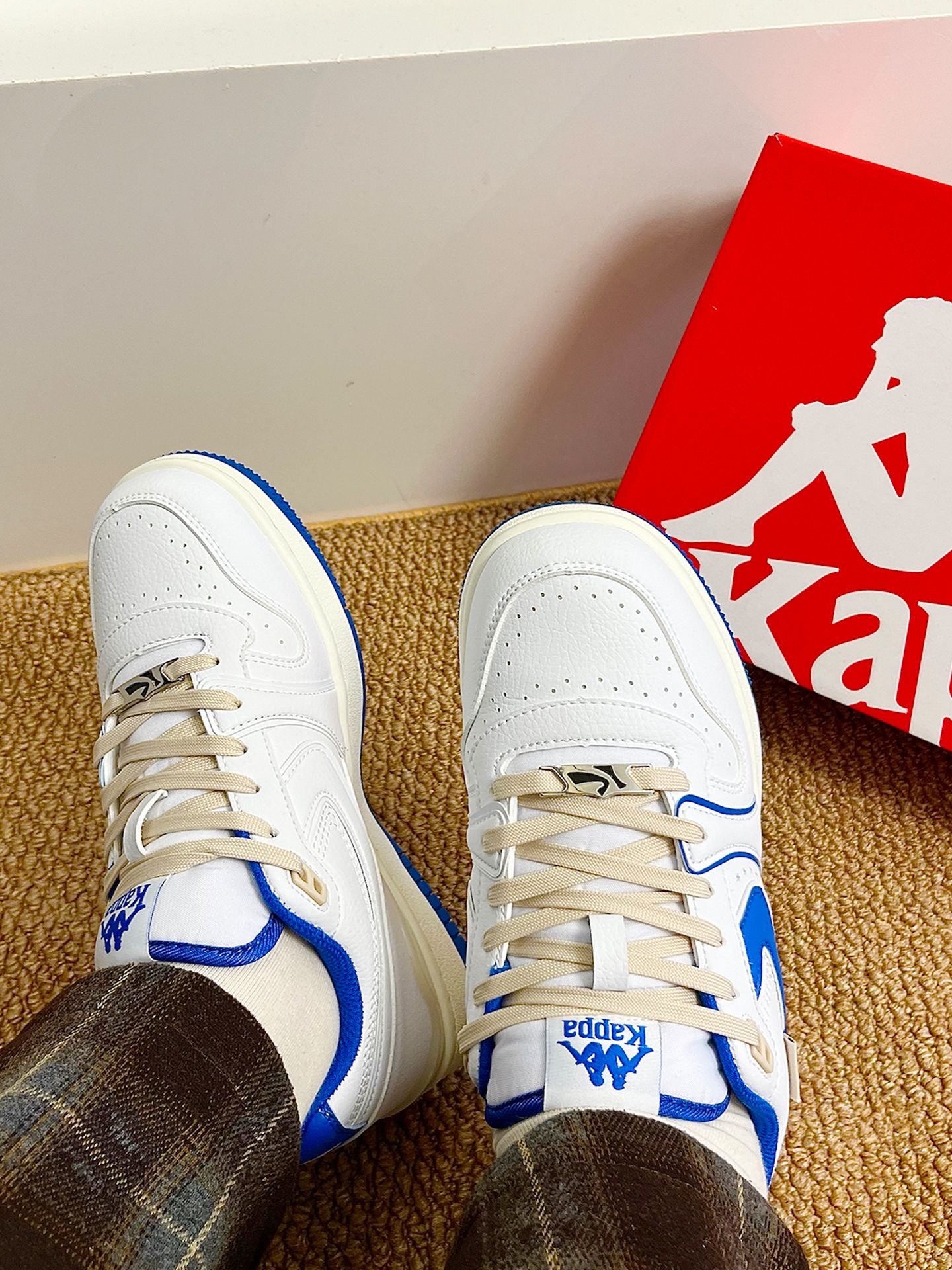 这双 Kappa 白蓝撞色板鞋自带清新滤镜,荔枝纹皮革拼接奶白厚底,浅卡其鞋带中和撞色,搭直筒牛仔裤打造随性休闲感。 通勤配垂感西裤干练利落💙,约会搭碎花半裙甜酷交织🤍,逛街配束脚卫裤随性洒脱,适配多种日常场景。 偏爱的清新日常款搭配,搭配同色系棒球帽,整体氛围更协调利落。
