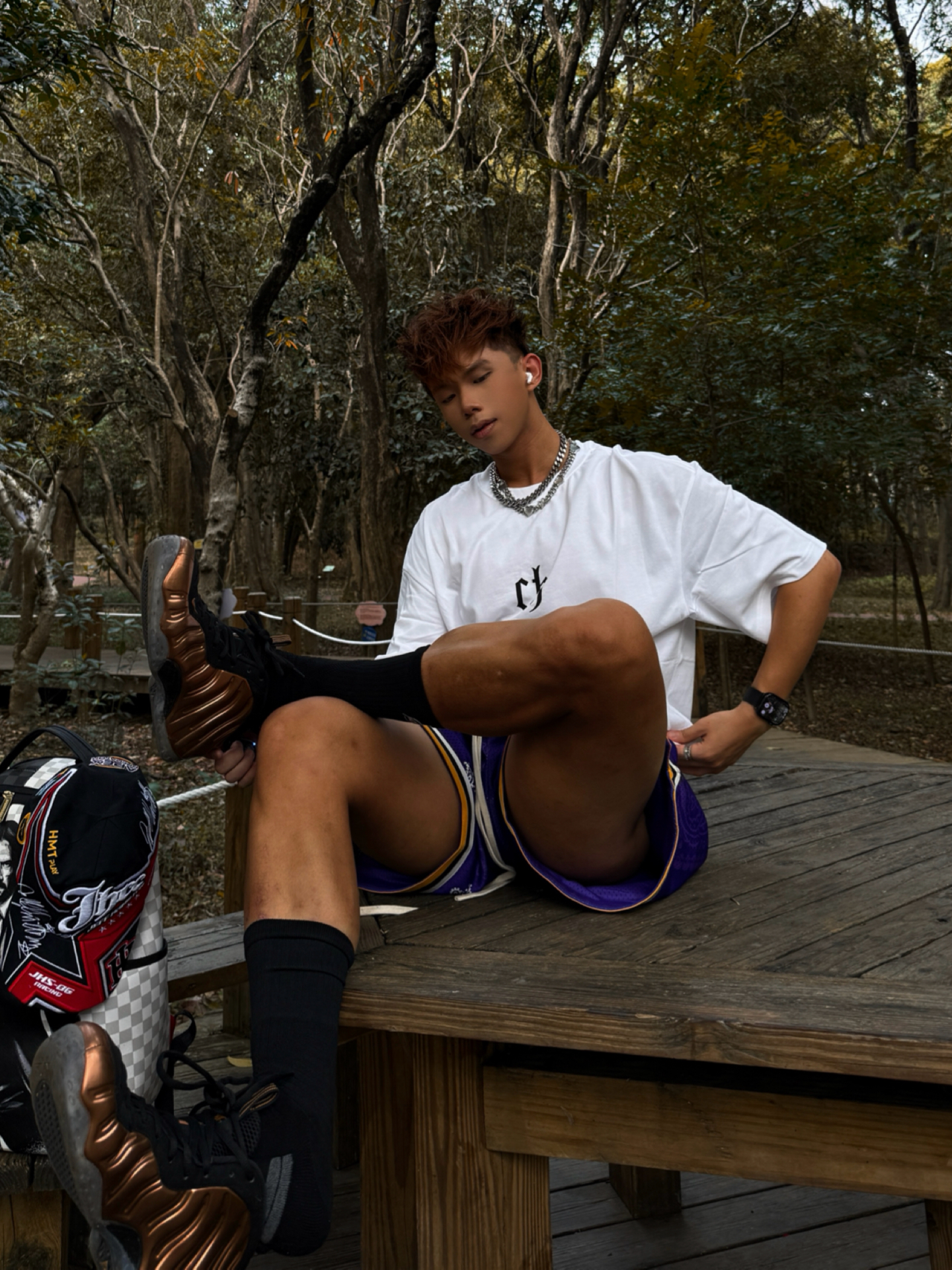 篮球党的宿舍ootd 初中生嘉豪式宿舍穿搭分享 一件宽松的大T美式街区OG感觉 搭配九分裤上宽松下窄 灰白色百搭也帅 一双科比9em湖人队配色 一颗篮球蓝红色确实帅