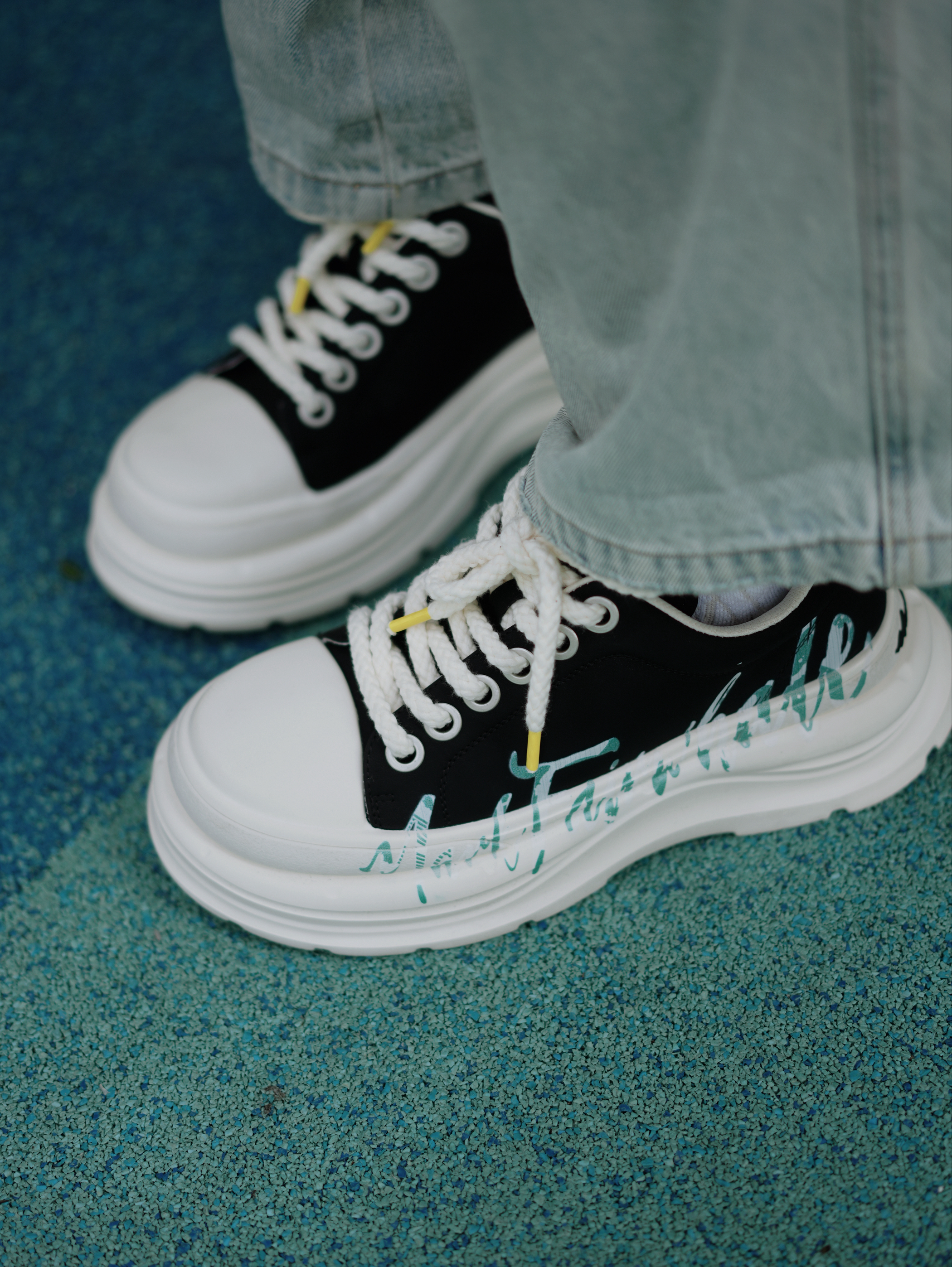 灰卫衣+破洞牛仔裤,是春天的松弛感公式! 踩上这双黑白涂鸦厚底鞋,直接把街头氛围拉满 增高又显腿细,鞋侧的涂鸦设计很有个性 粗麻绳鞋带细节感拉满,搭配整套oversize穿搭 随性又有态度,日常出门舒服又很吸睛!