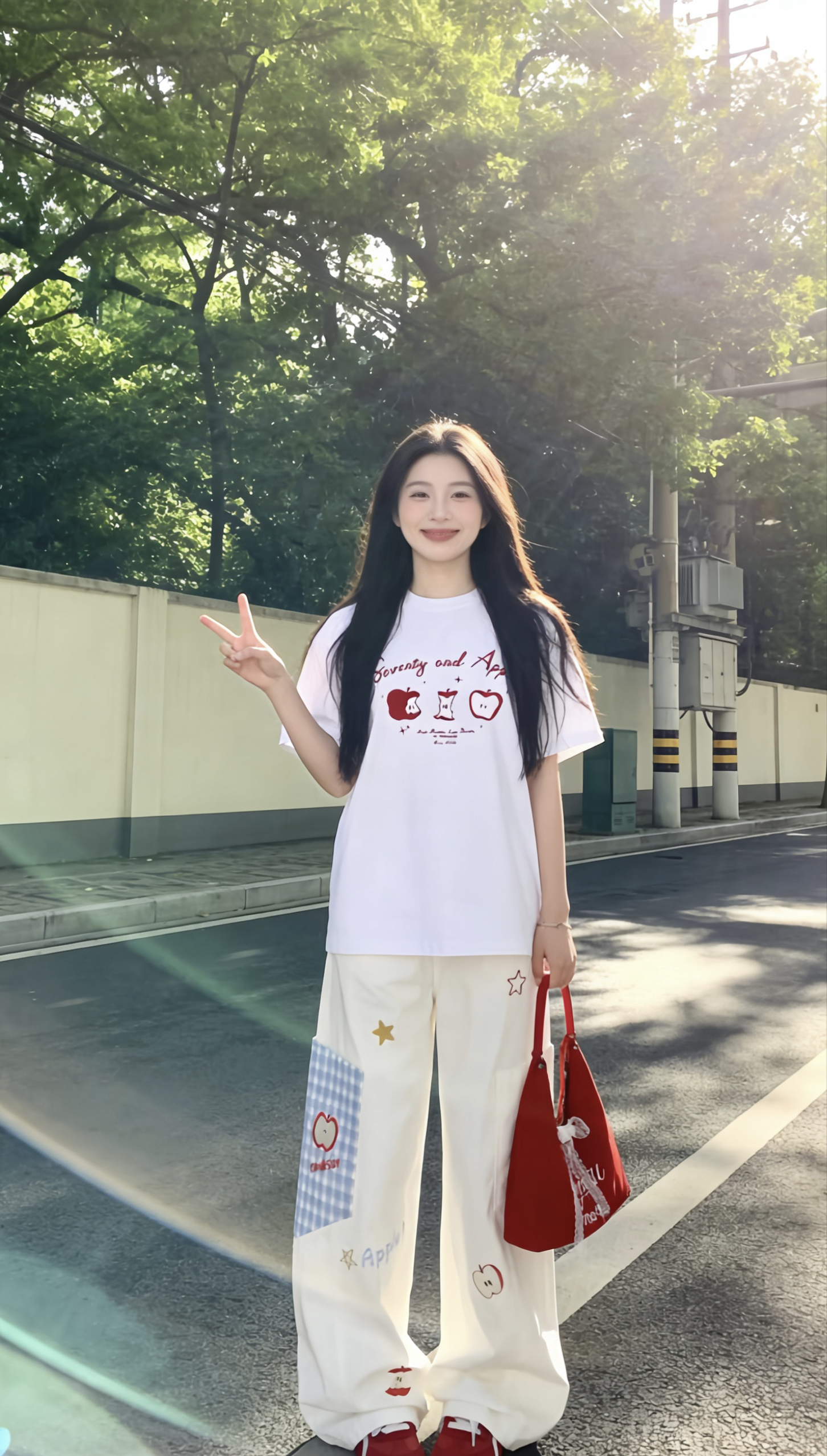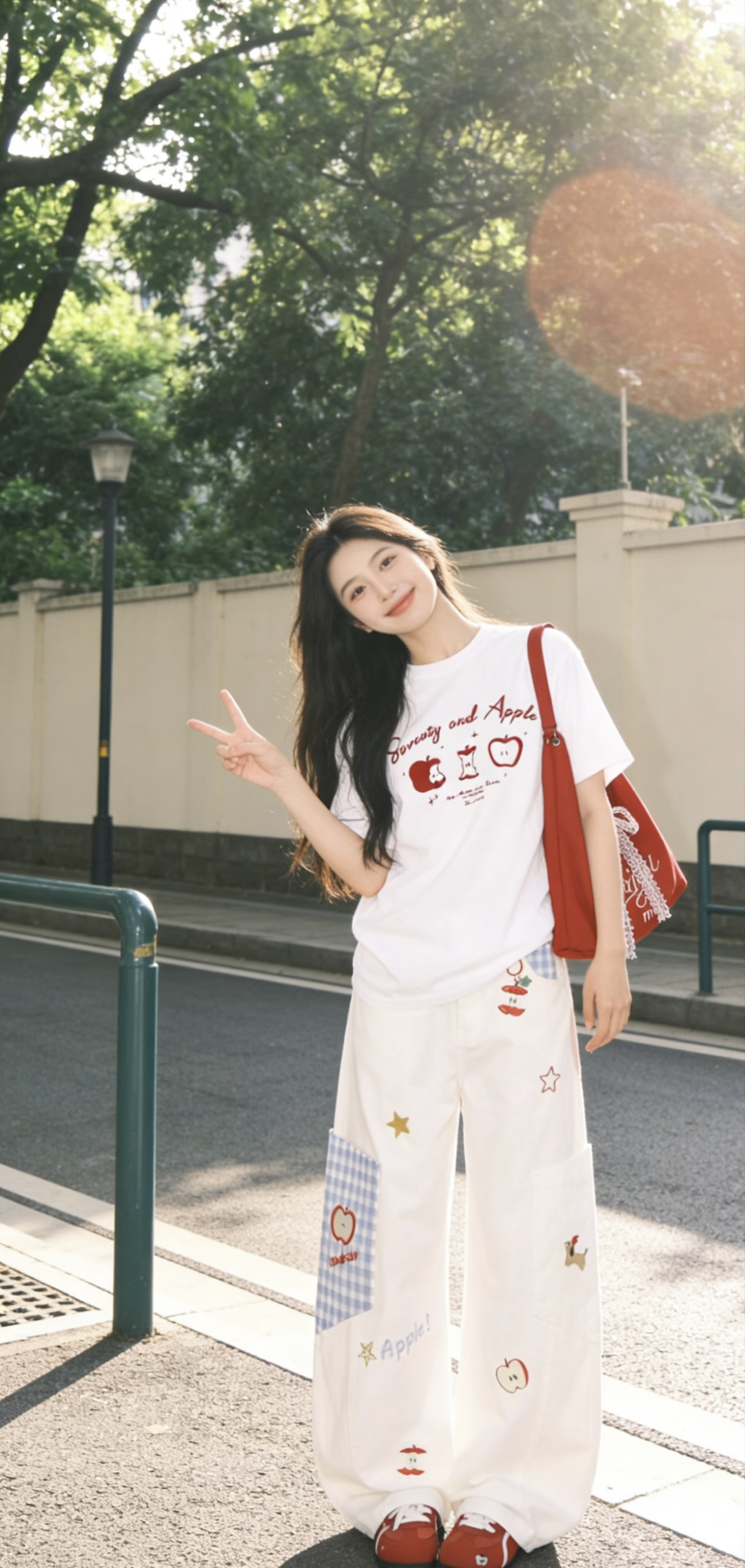 hi 姐妹们👋 挖到一套早春甜妹专属穿搭! 红白撞色+苹果元素,走在绿意街道上回头率直接爆表,青春感溢出屏幕~ ✅ 上衣:苹果印花纯棉白T 软乎乎的纯棉材质,贴身穿超舒服!红底苹果印花+手写体字母,简约又有细节,单穿叠穿都好看,春天穿干净又清爽~ ✅ 下装:苹果刺绣白色牛仔裤 高腰阔腿版型,藏肉又显腿长!满印的苹果、小狗、星星刺绣太可爱了,蓝格补丁设计增加了韩系慵懒感,和白T搭在一起,清新感直...