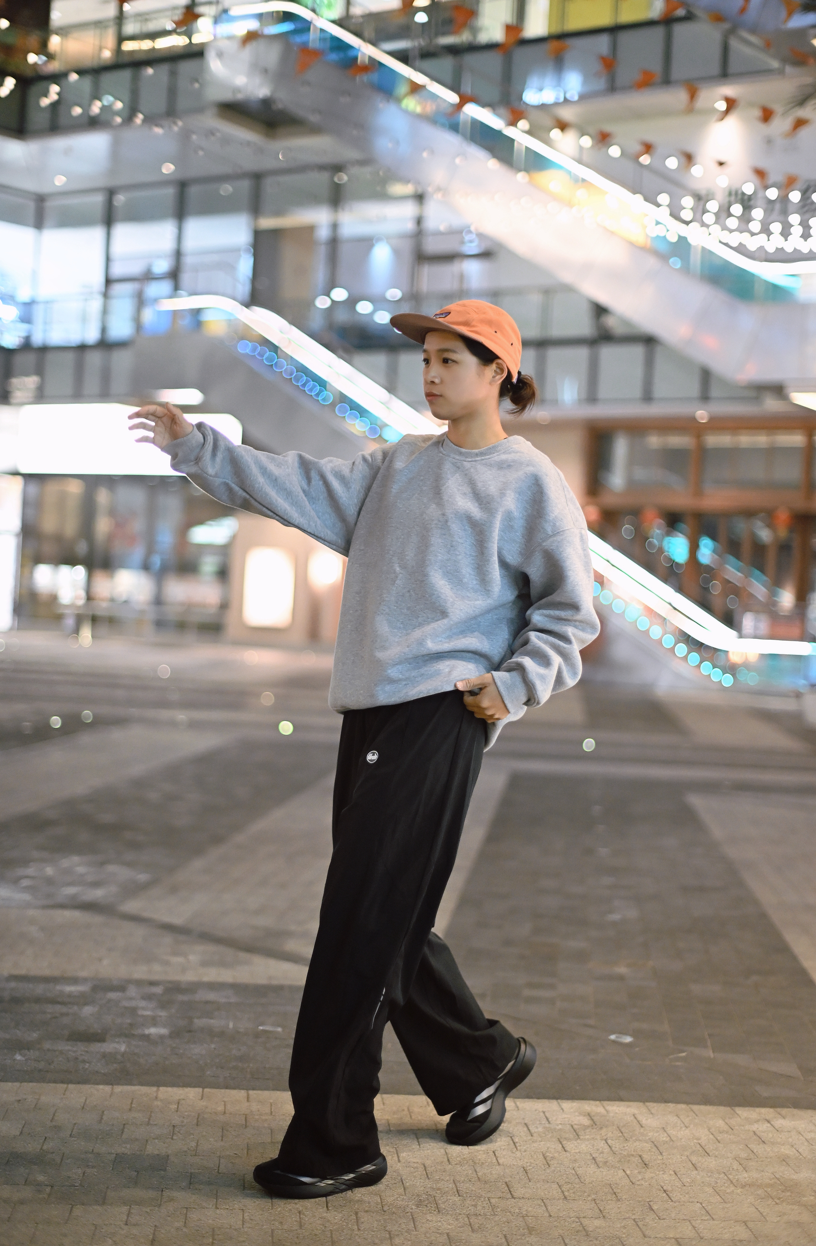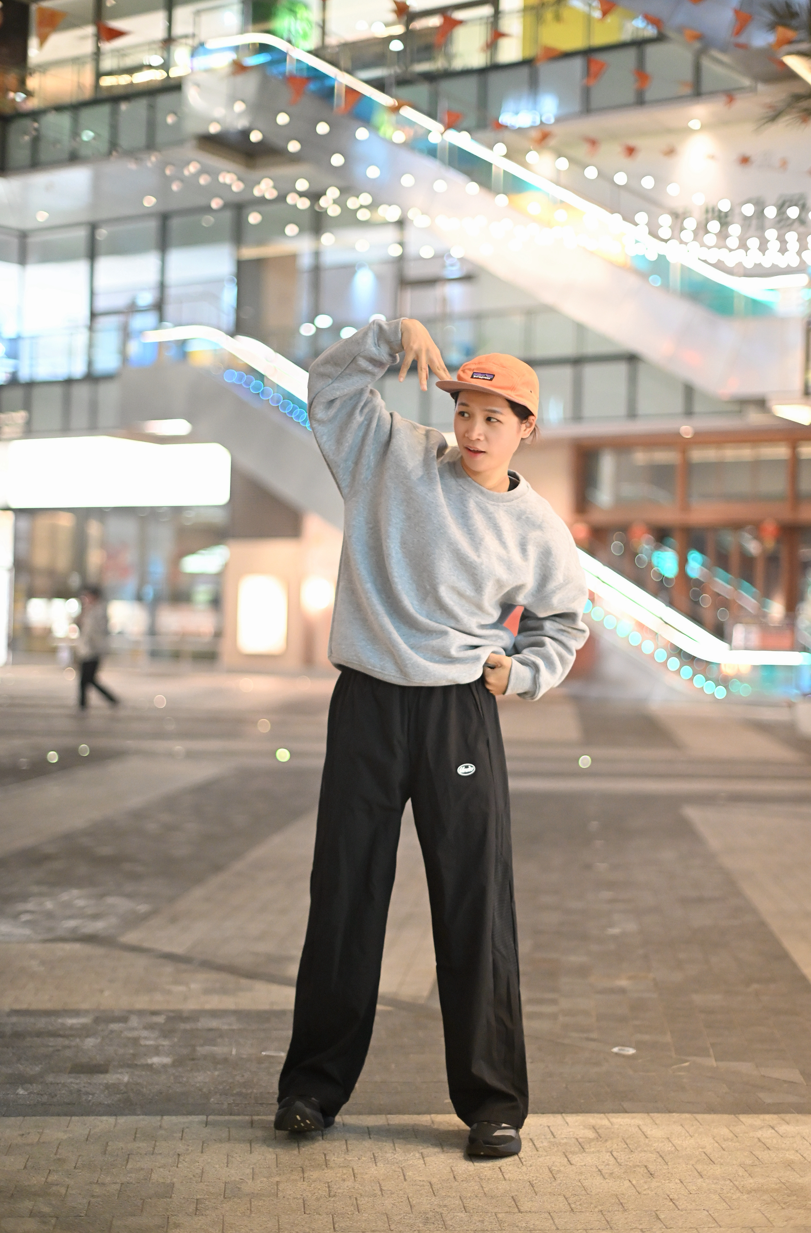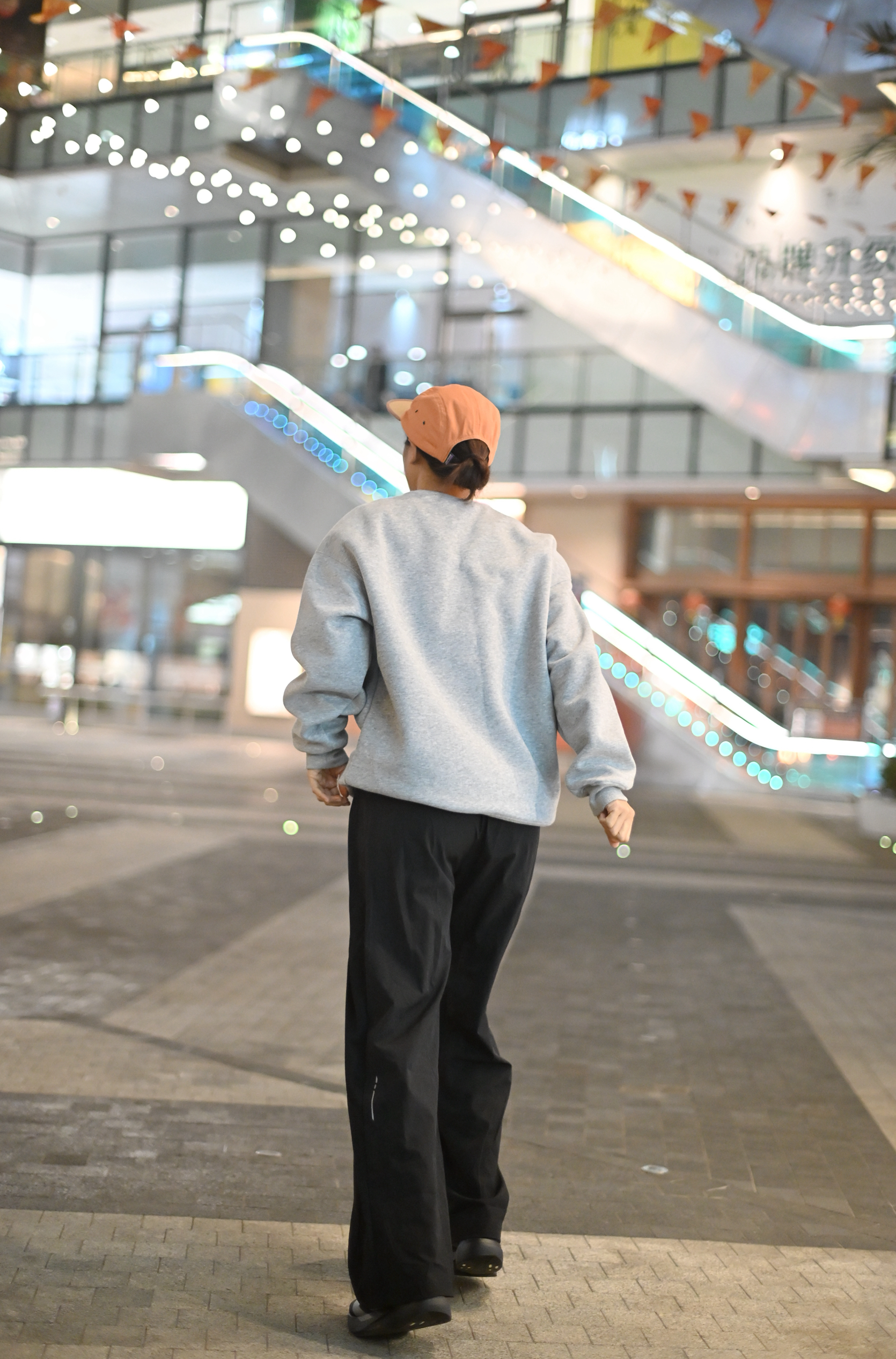 只是想出门散步消消食 那就以舒适为主 灰色简约长袖T 黑色运动直筒休闲裤 一双可跑可走的运动鞋 一顶帽子就出门~