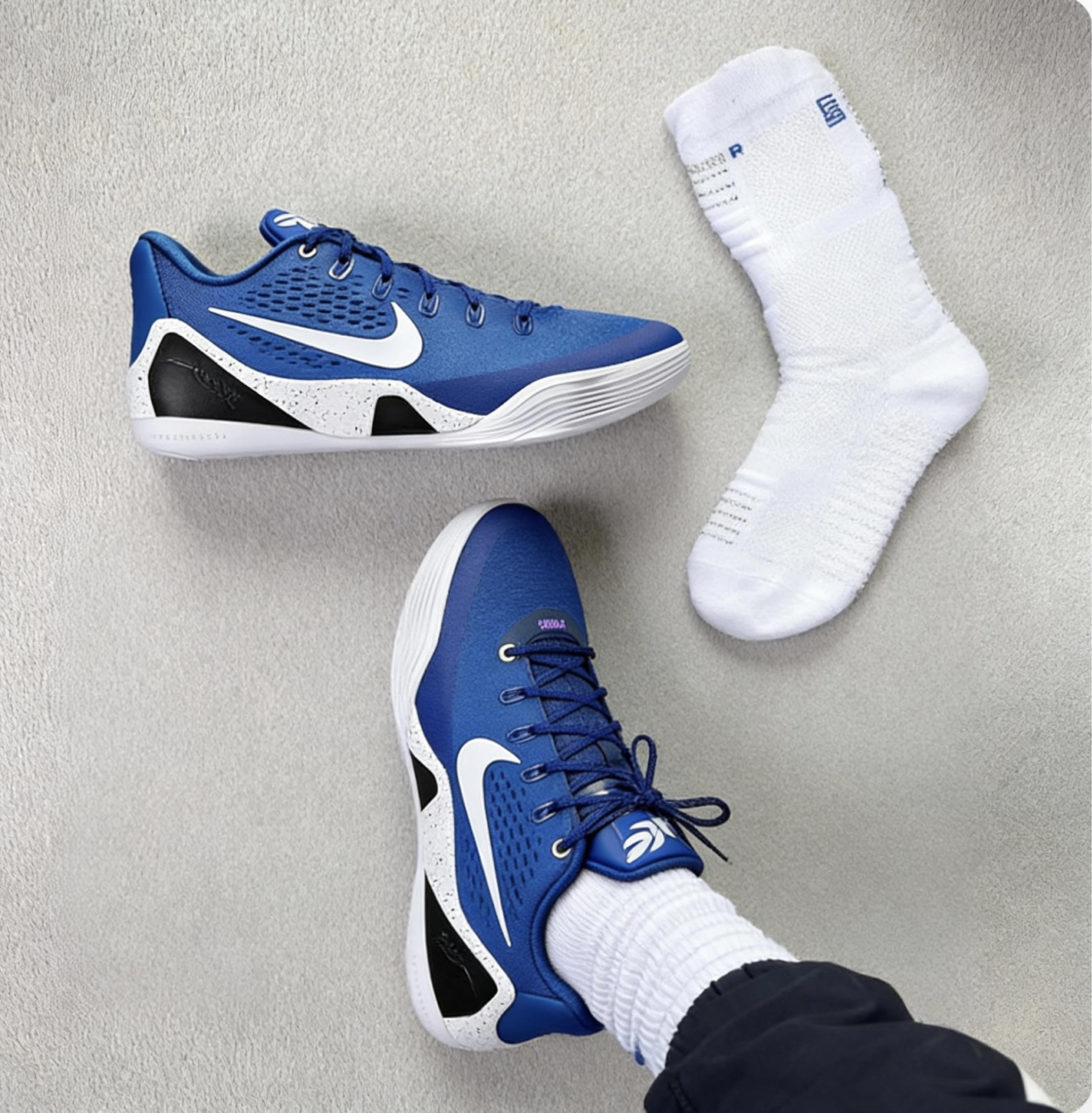这双Nike Kobe 9的蓝白配色真的太戳我了! 网眼鞋面透气又利落,后跟的科比签名细节拉满, 上脚就是复古又利落的球场气质, 不管是实战还是日常出街都很能打, 老科密看到直接梦回巅峰时刻✨