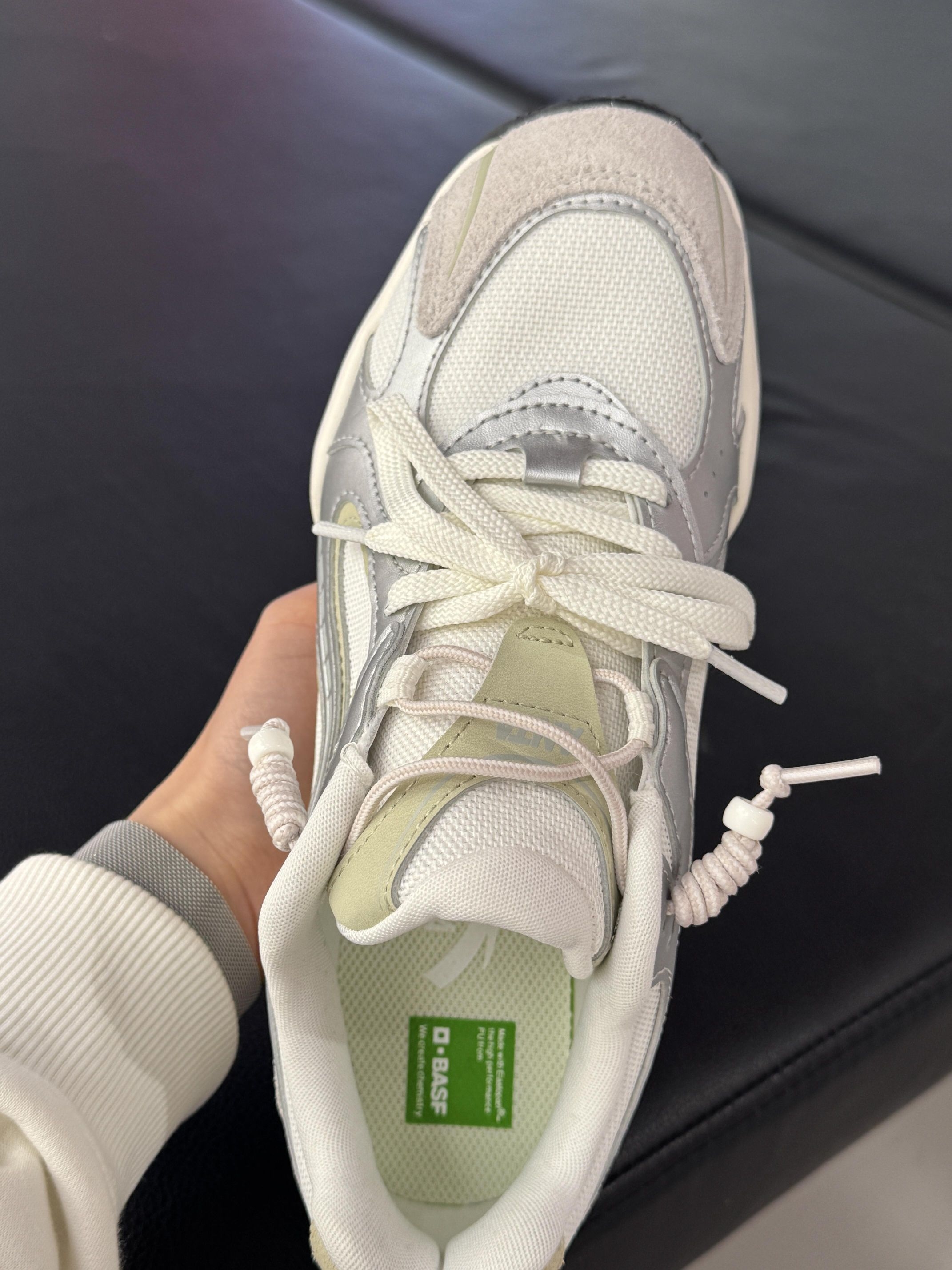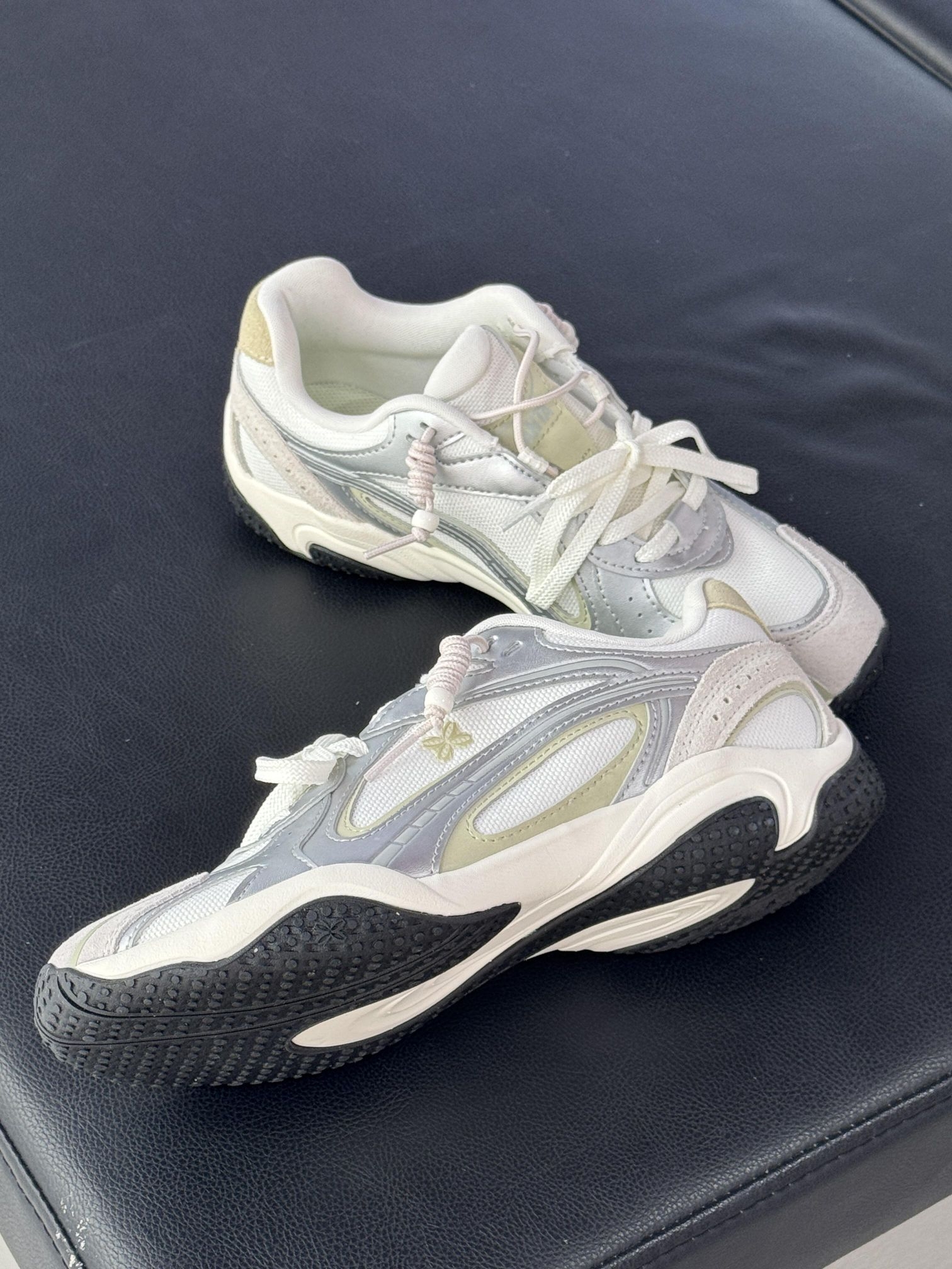 奶fufu的银白撞色,鞋侧的小蝴蝶刺绣好精致 上脚就是温柔甜妹本妹🥰 薄底+轻质的设计,走路软弹又稳,完全不笨重,小个子姐妹也能轻松驾驭~ 网面透气不闷脚,春天穿刚刚好,配百褶裙就是韩系女高,配牛仔裤又很休闲松弛感,一鞋多穿太香咯!