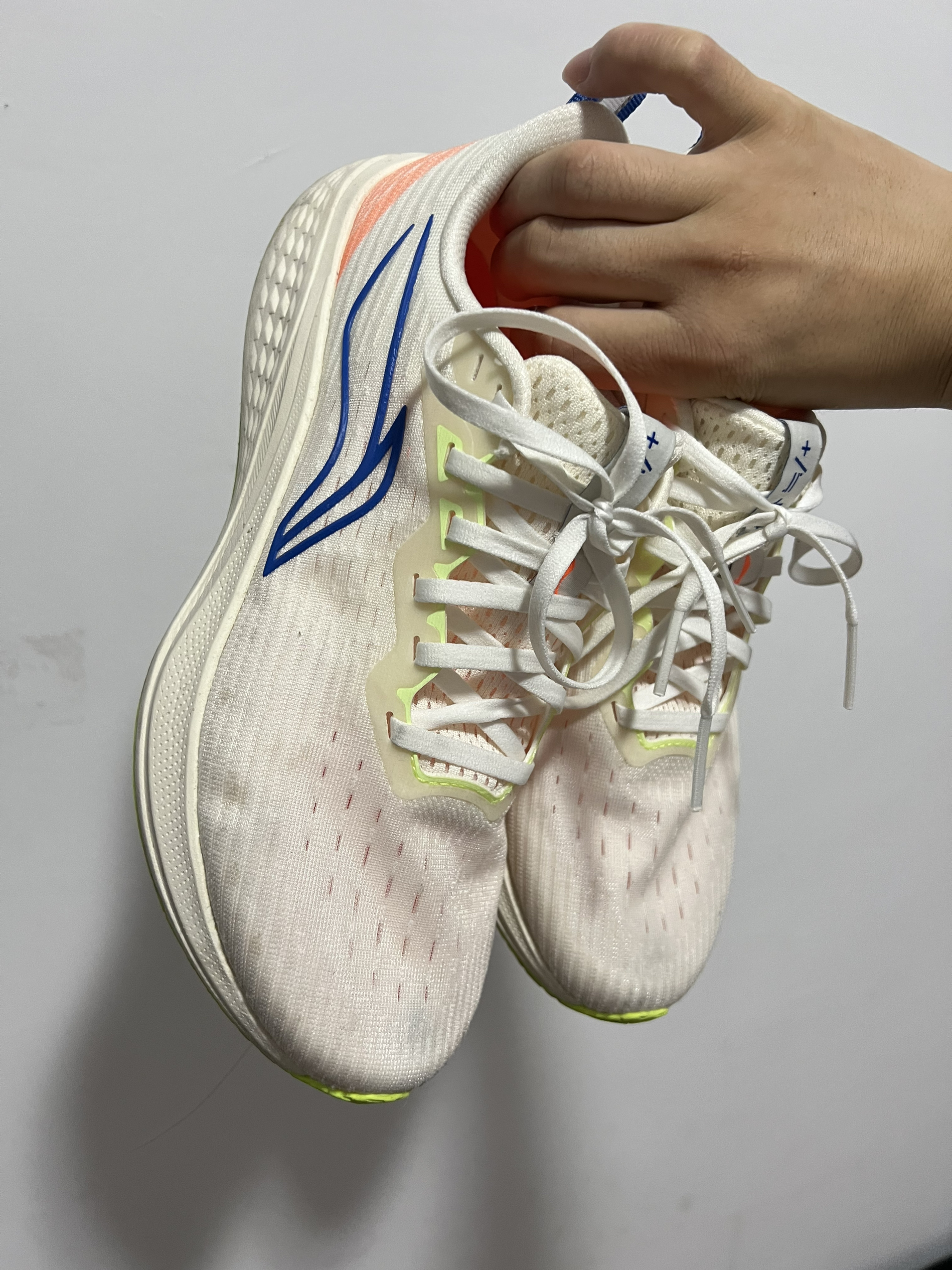 网面设计不出脚汗,跑步轻便不硌脚 本人脚宽,选择的正码,没有不适感。 颜色米白随便配裤子,运动短裤。 价格200左右,随便造。 清洗用软毛刷,用O泡 先泡一下。