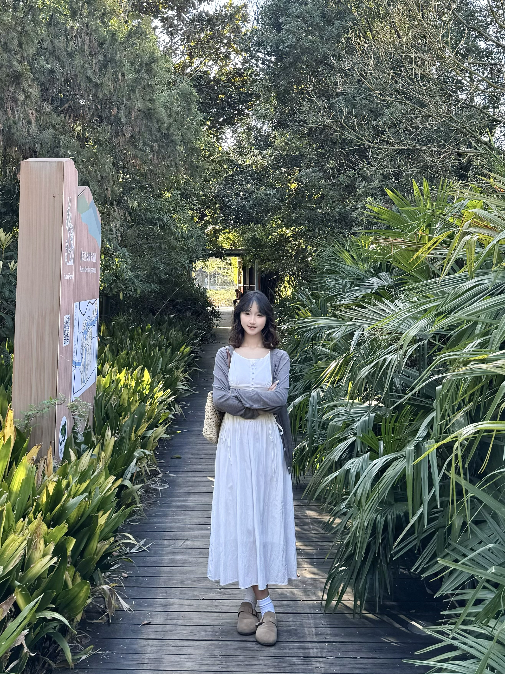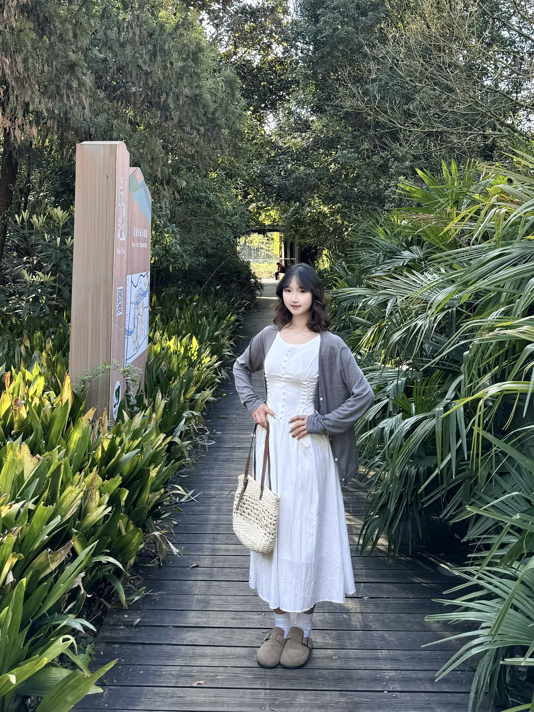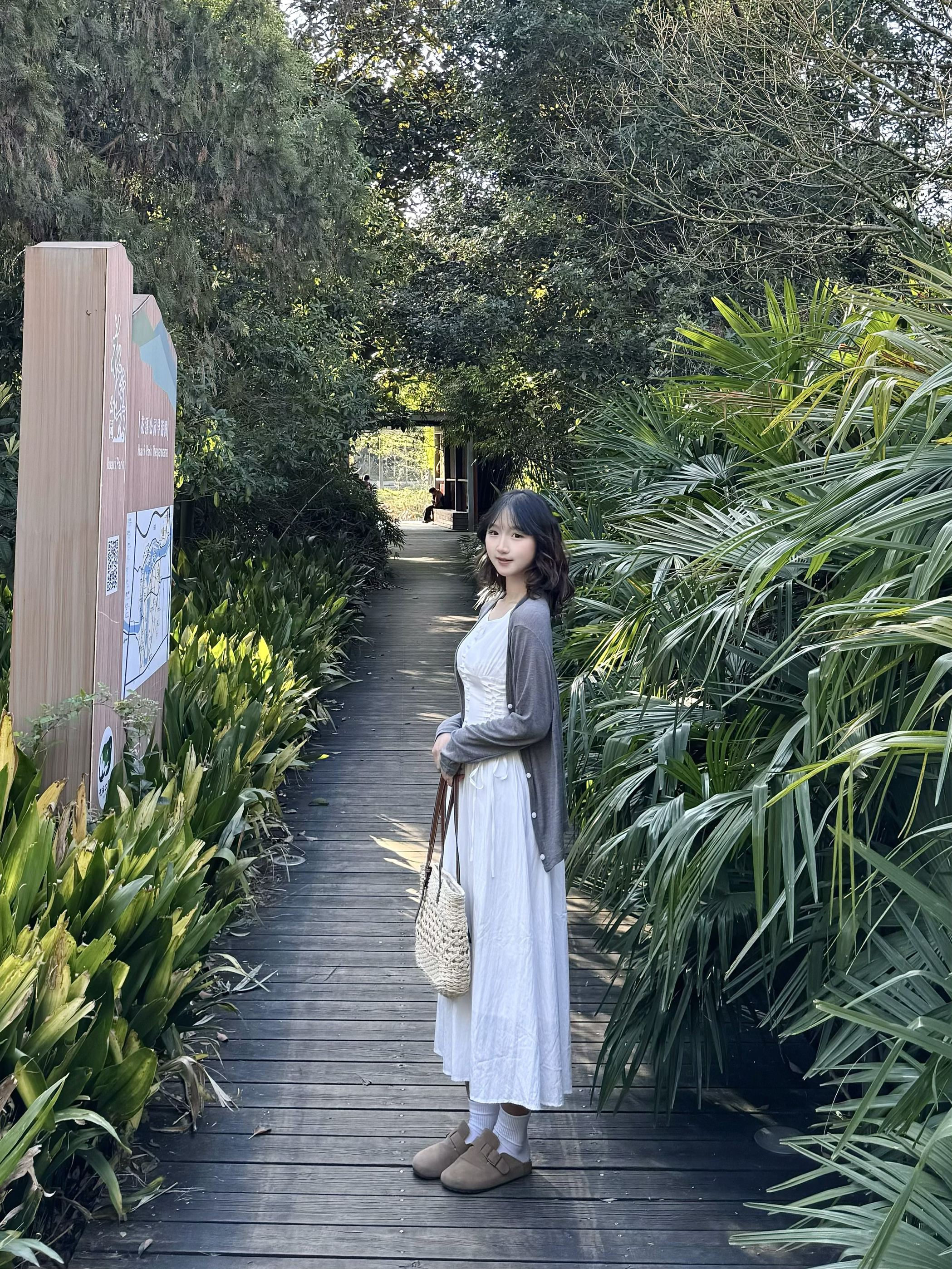 草编包+勃肯鞋,踩在林间木栈道上, 每一步都踩进自然的慢节奏里。 阳光穿过树叶缝隙,落在裙摆和发梢, 不用刻意修饰,松弛感就是最好的滤镜✨