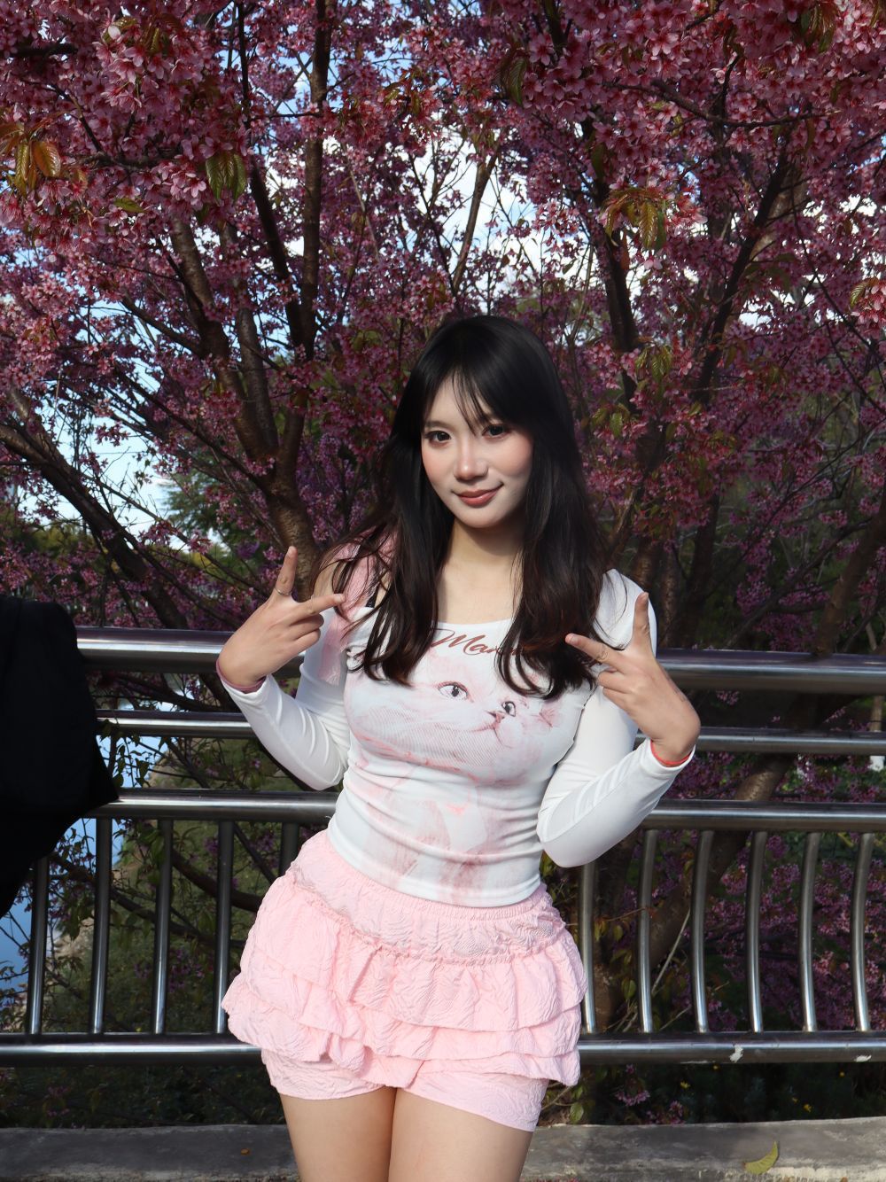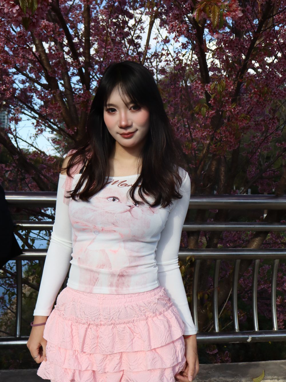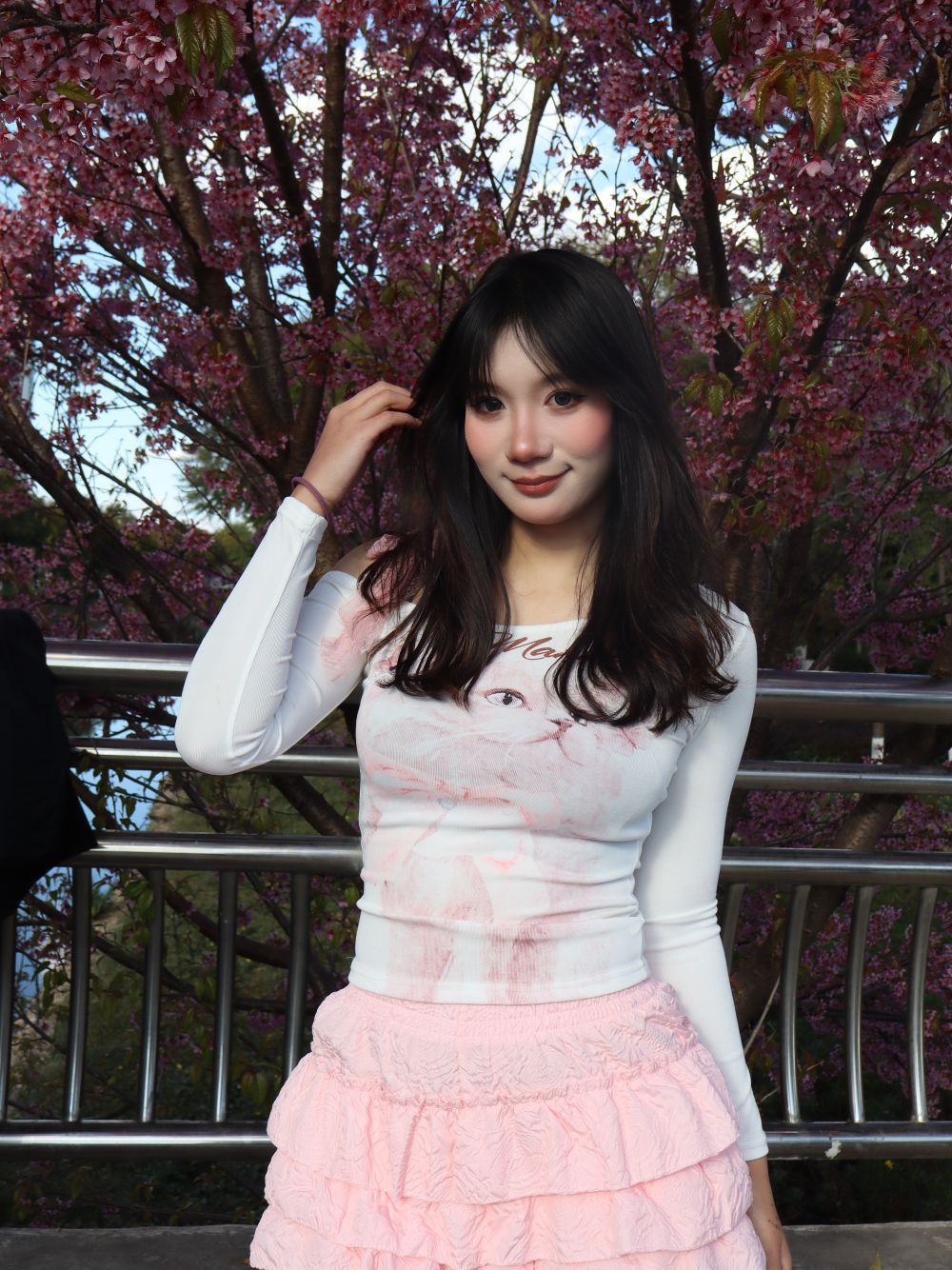 上衣:露肩设计的猫咪印花长袖,甜酷感拿捏!微透面料+可爱猫脸图案,软妹感十足,还能悄悄露出肩线,显瘦又小心机 下装:层层叠叠的粉色蛋糕短裙,褶皱设计自带少女感,高腰版型拉长比例,走路带风的灵动谁穿谁是甜妹!配色:白+粉的经典组合,和樱花背景完美融合,温柔又显白,春日氛围感直接拉满。春日赏花、公园散步、约会逛街都超合适 拍照超出片,粉白配色在花丛中温柔又亮眼。