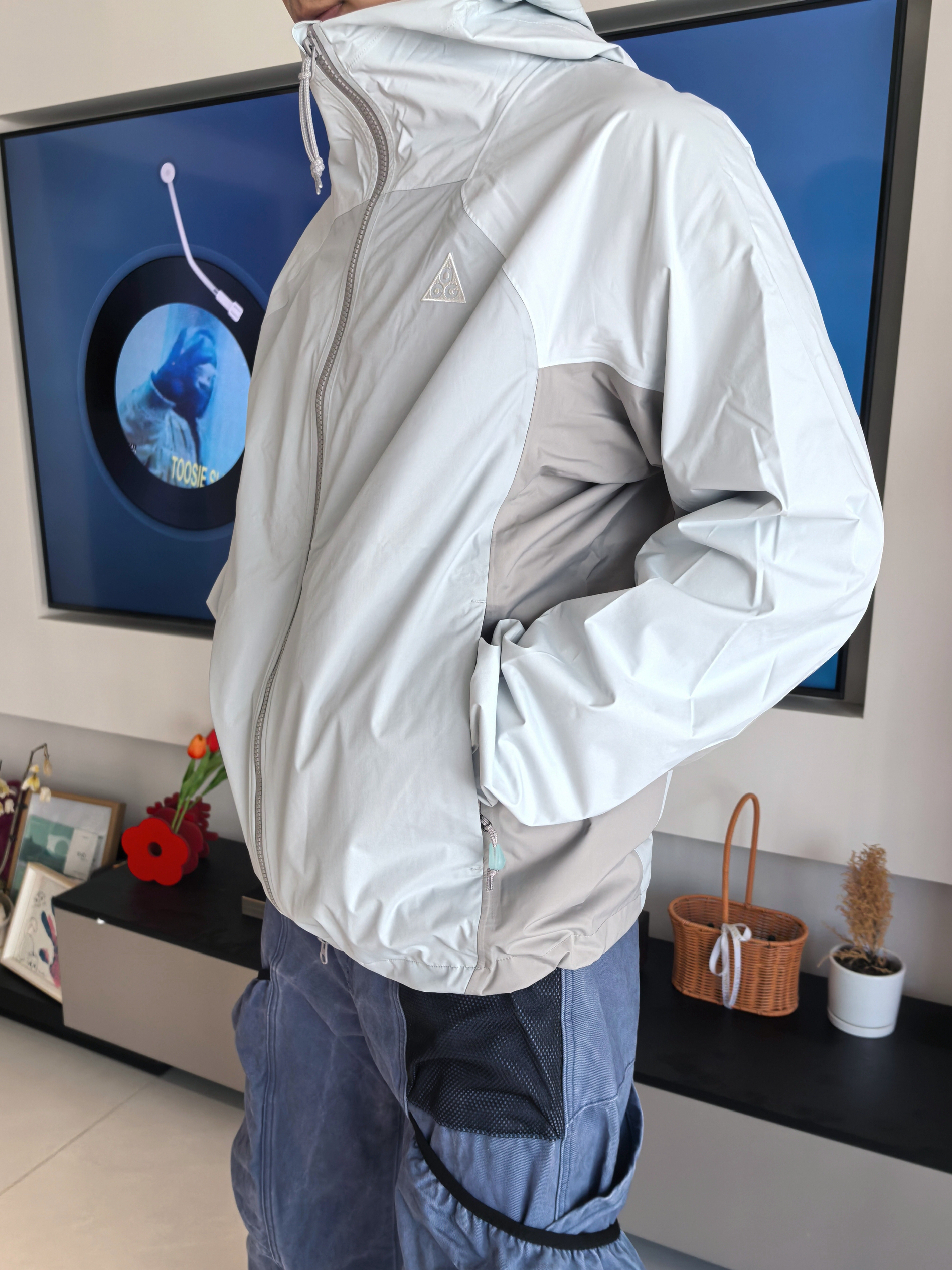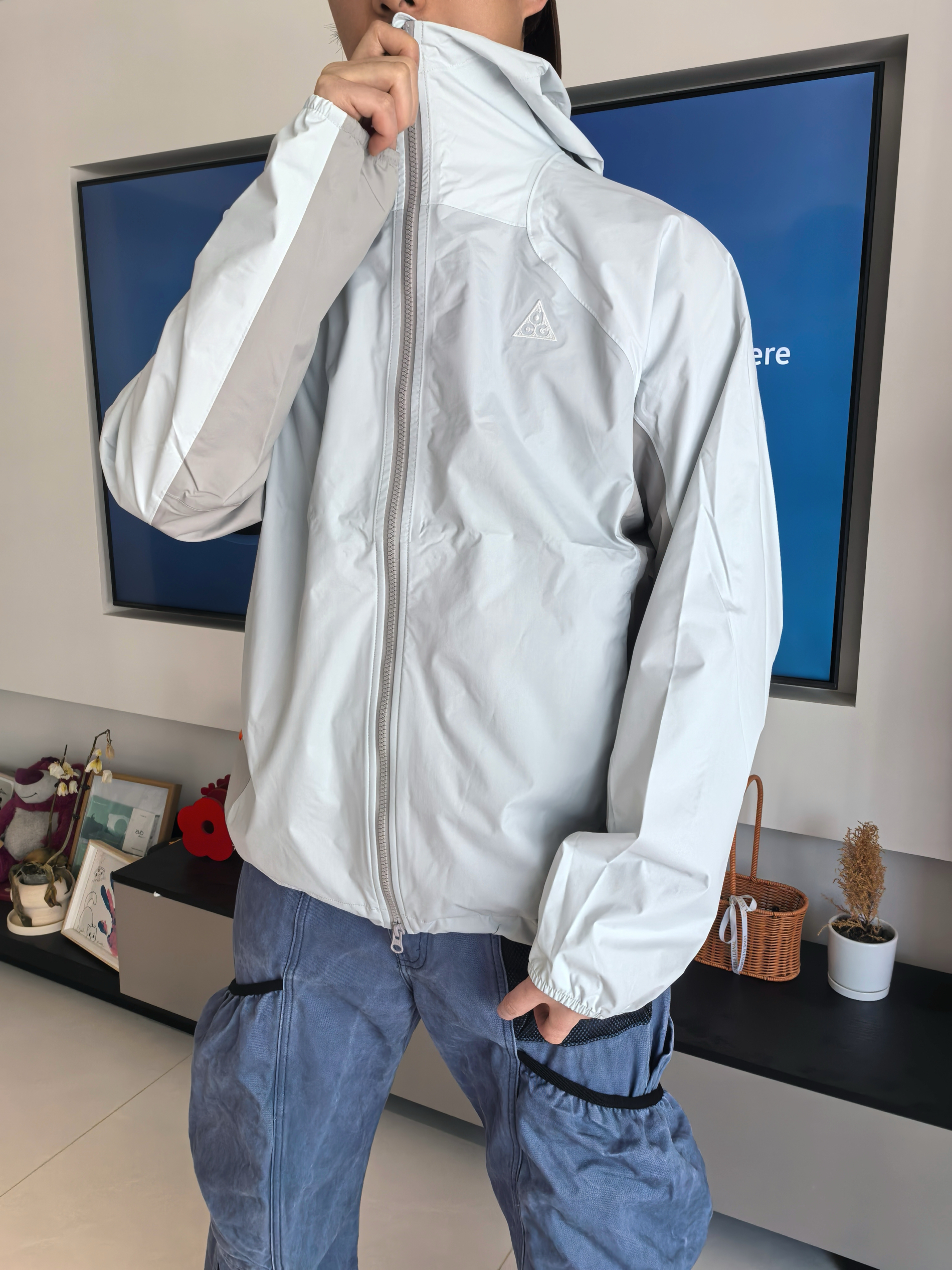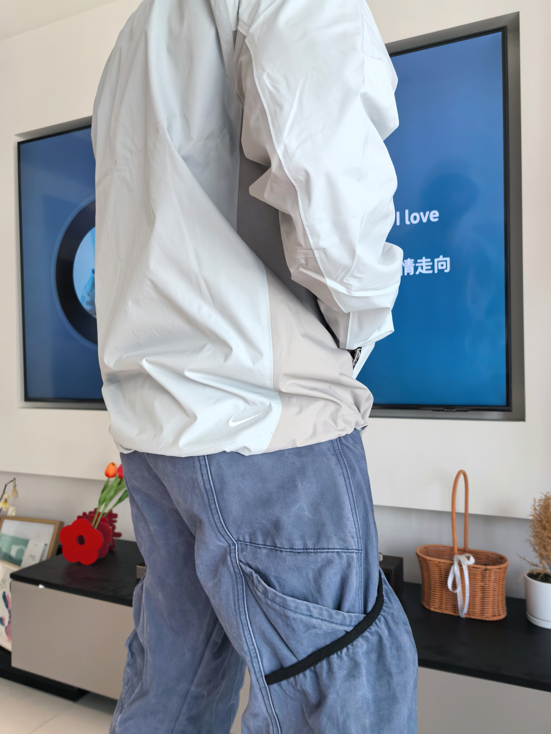 这个浅色拼接确实不太明显? 🏃今天我上身这件耐克外套是ACG系列,属于偏轻薄款,几个颜色我对这种浅灰还是没有抵抗力的,它的拼接两种灰色不太明显,但挺清爽的,背后有一个小细节Logo 这种户外风外套,最明显的就是会有一些机能风,并且它的质感我觉得是介于软壳硬壳之间的 🏷️尺码我选的一个L码,感觉有点偏大了