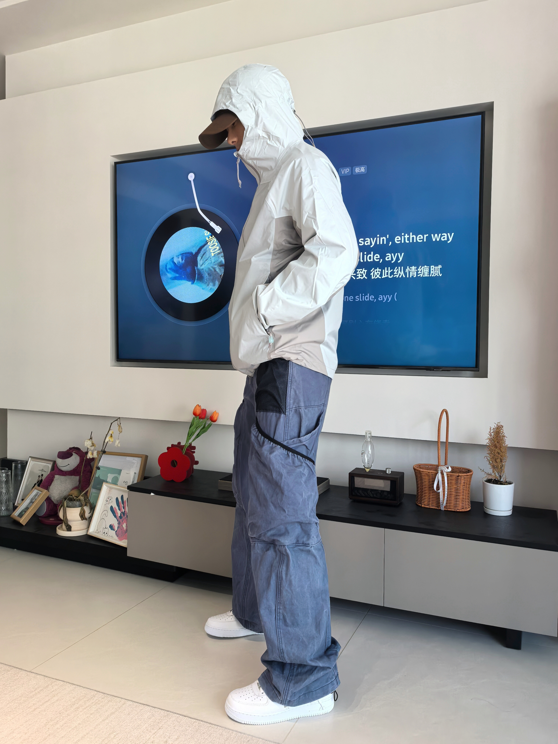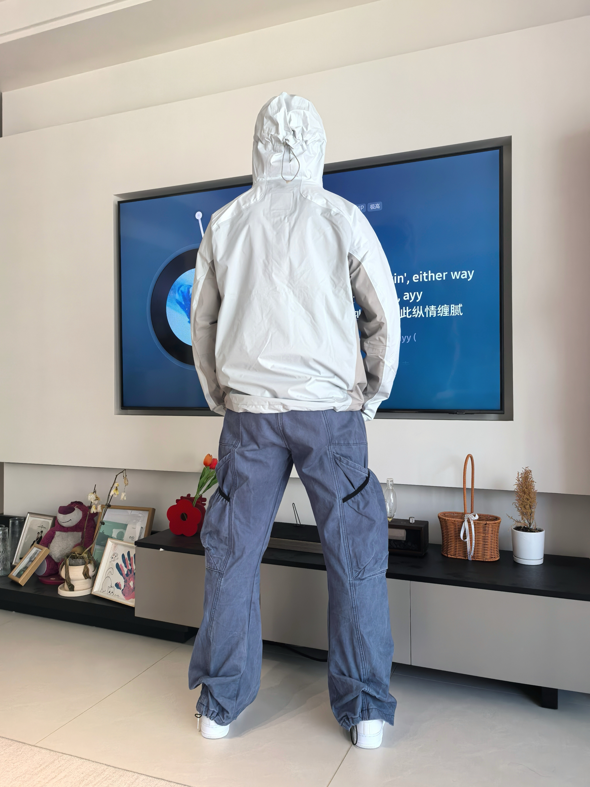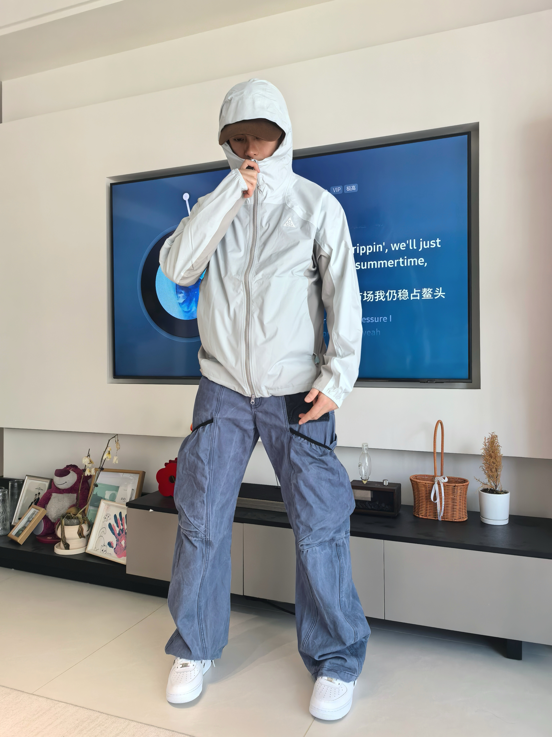 这个浅色拼接确实不太明显? 🏃今天我上身这件耐克外套是ACG系列,属于偏轻薄款,几个颜色我对这种浅灰还是没有抵抗力的,它的拼接两种灰色不太明显,但挺清爽的,背后有一个小细节Logo 这种户外风外套,最明显的就是会有一些机能风,并且它的质感我觉得是介于软壳硬壳之间的 🏷️尺码我选的一个L码,感觉有点偏大了